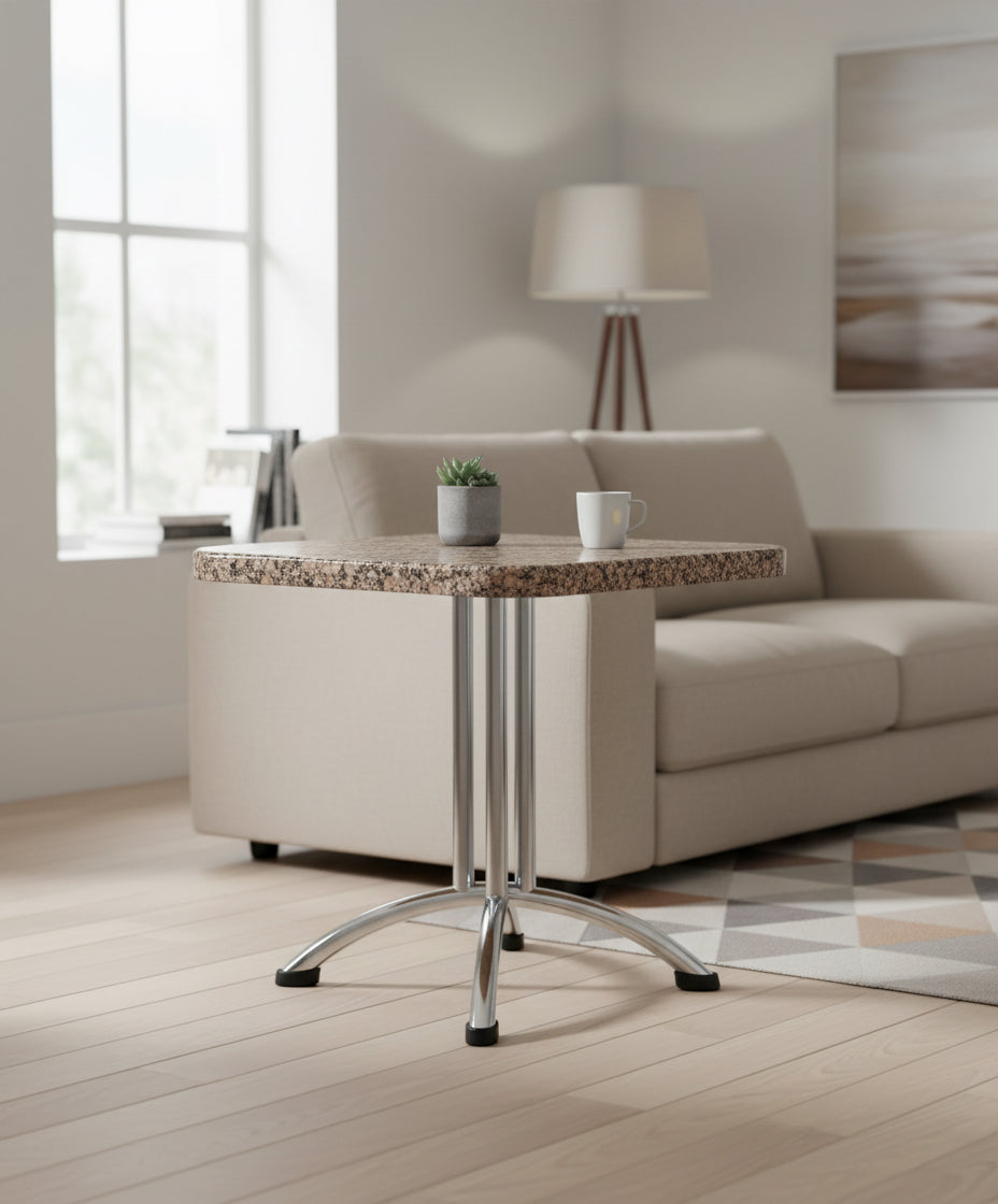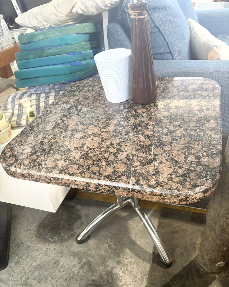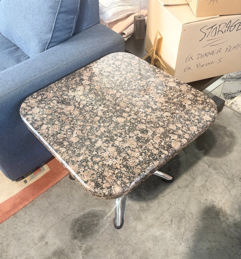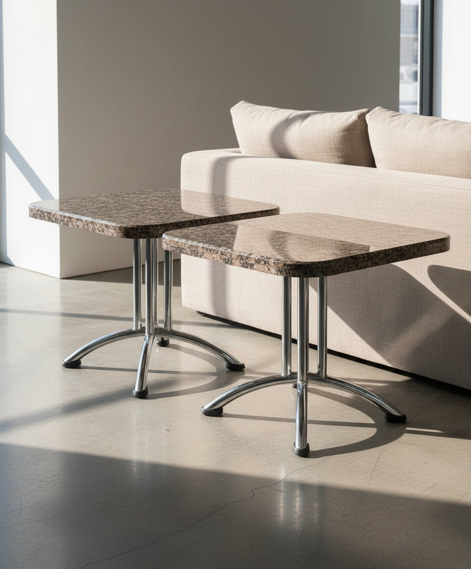 Um par de mesas de apoio esculpidas em grossas placas de granito com belos padrões, sobre bases cromadas brilhantes e com pés ovais pretos.
