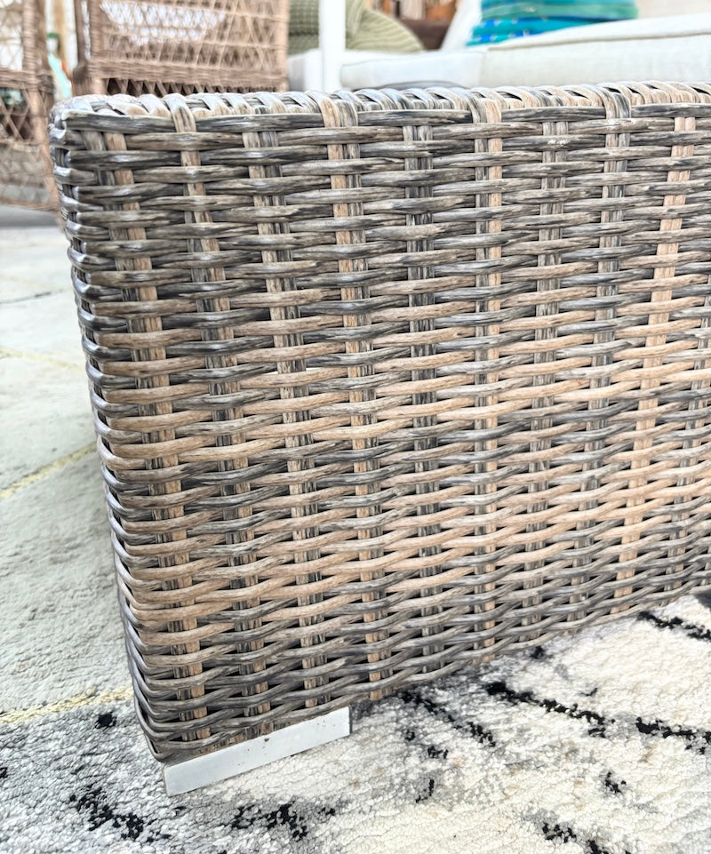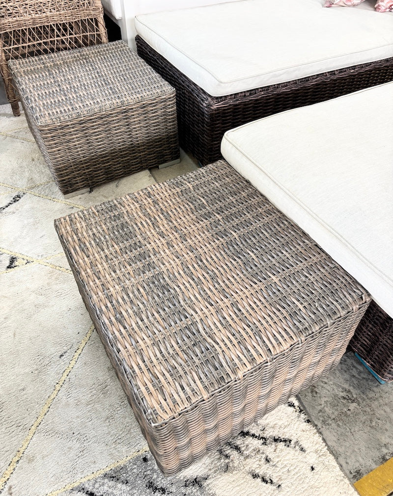 Um par de mesas de apoio em polirratã com pés em metal, à altura perfeita para apoiar a sua bebida enquanto apanha sol numa espreguiçadeira.