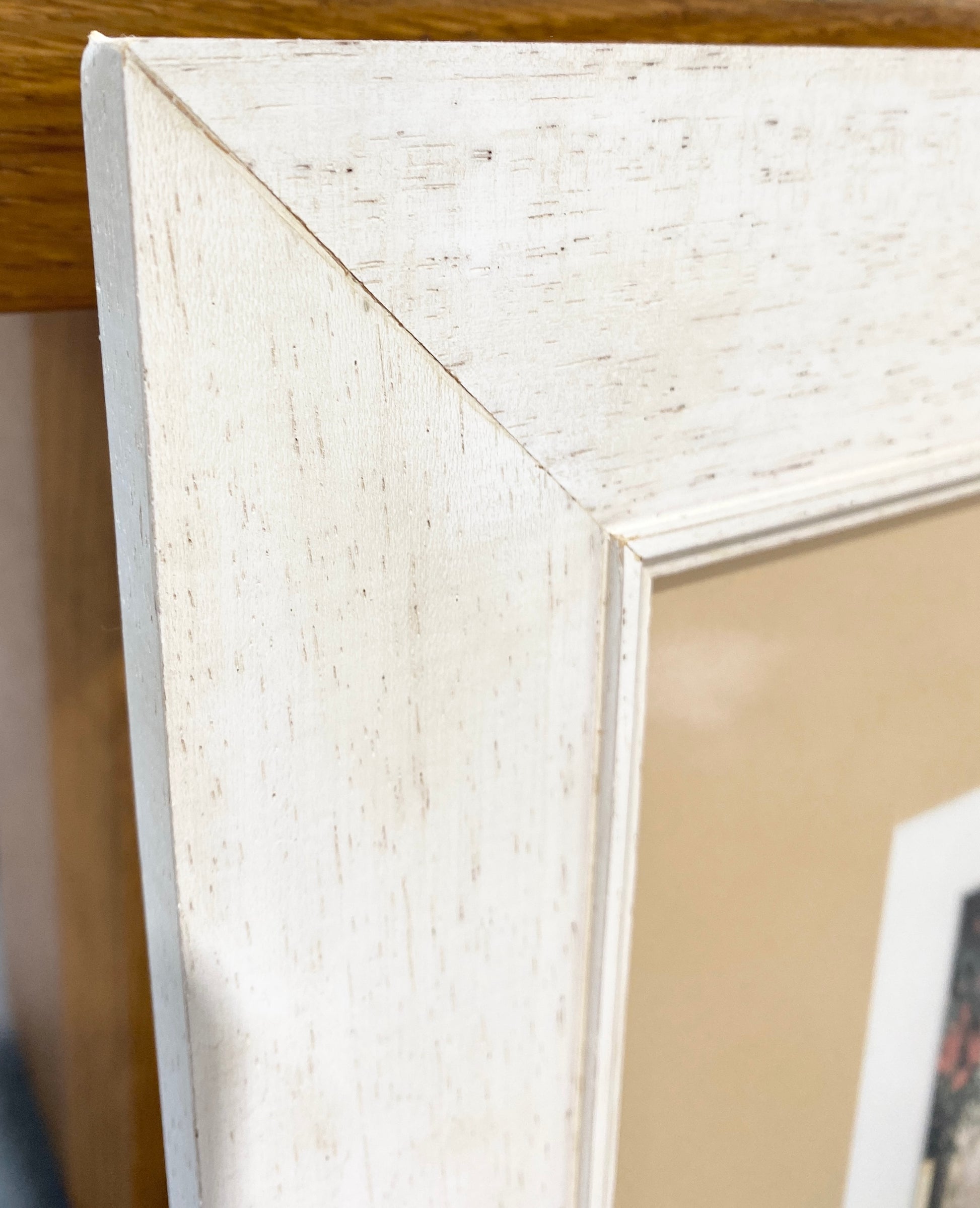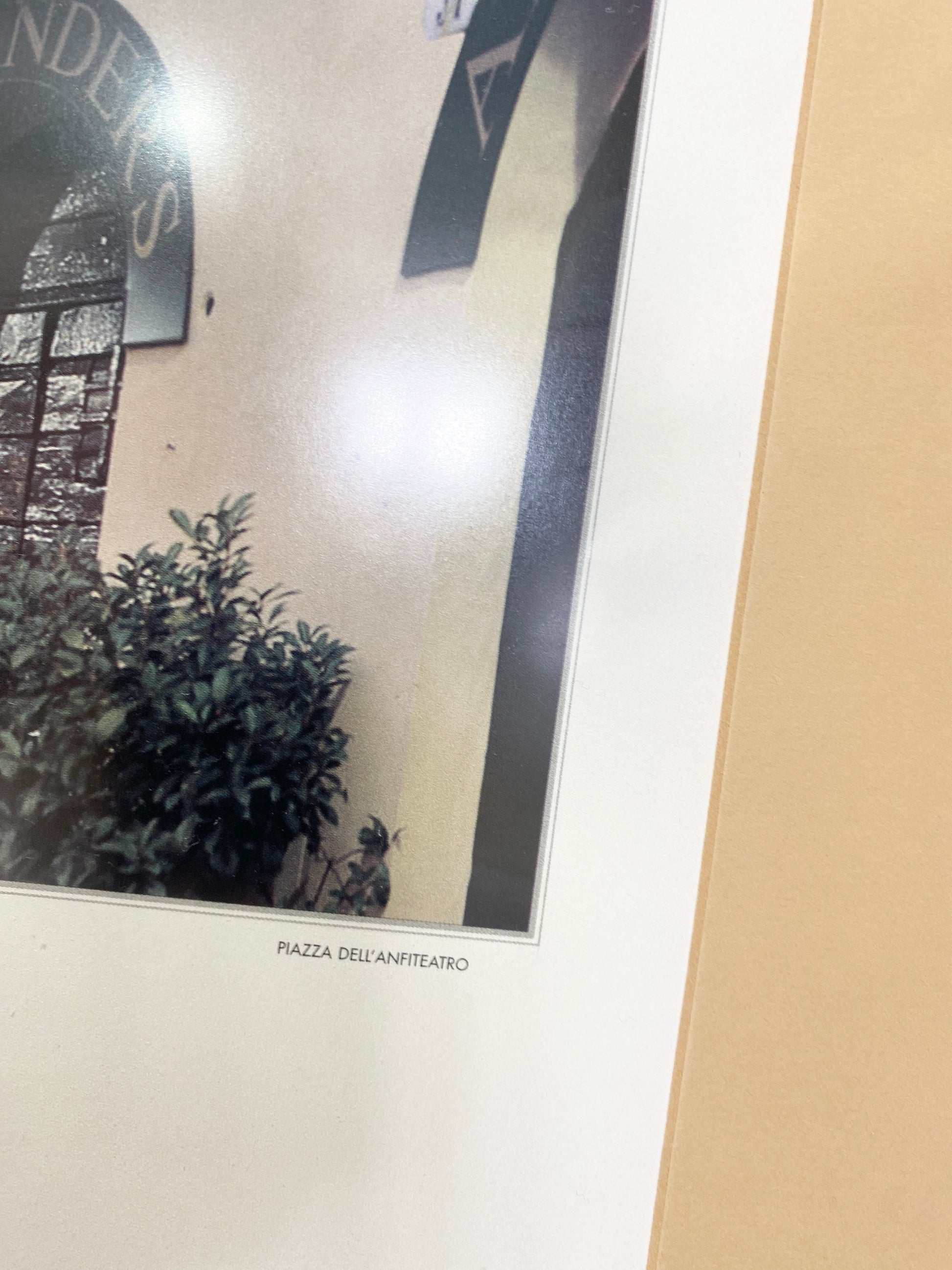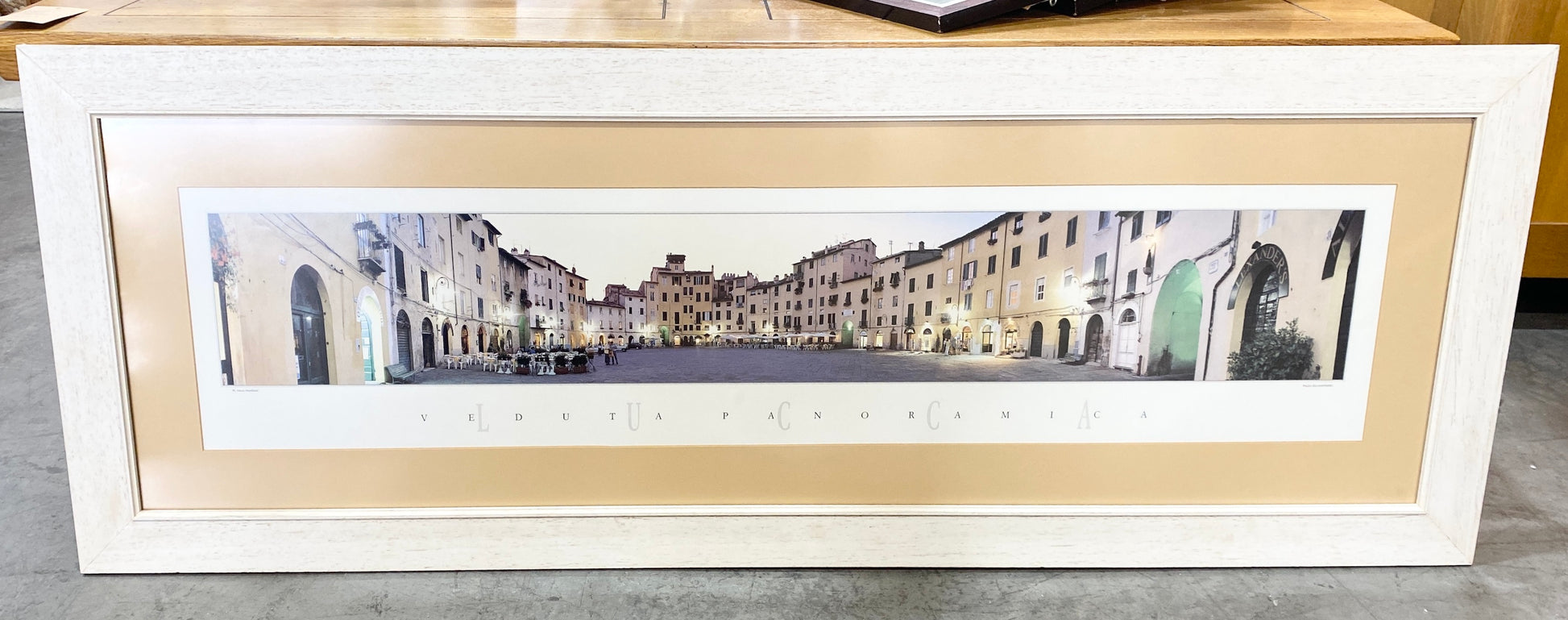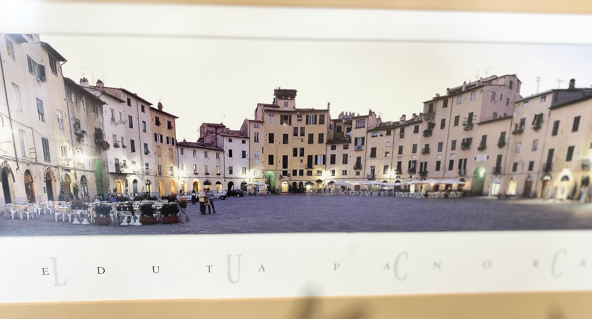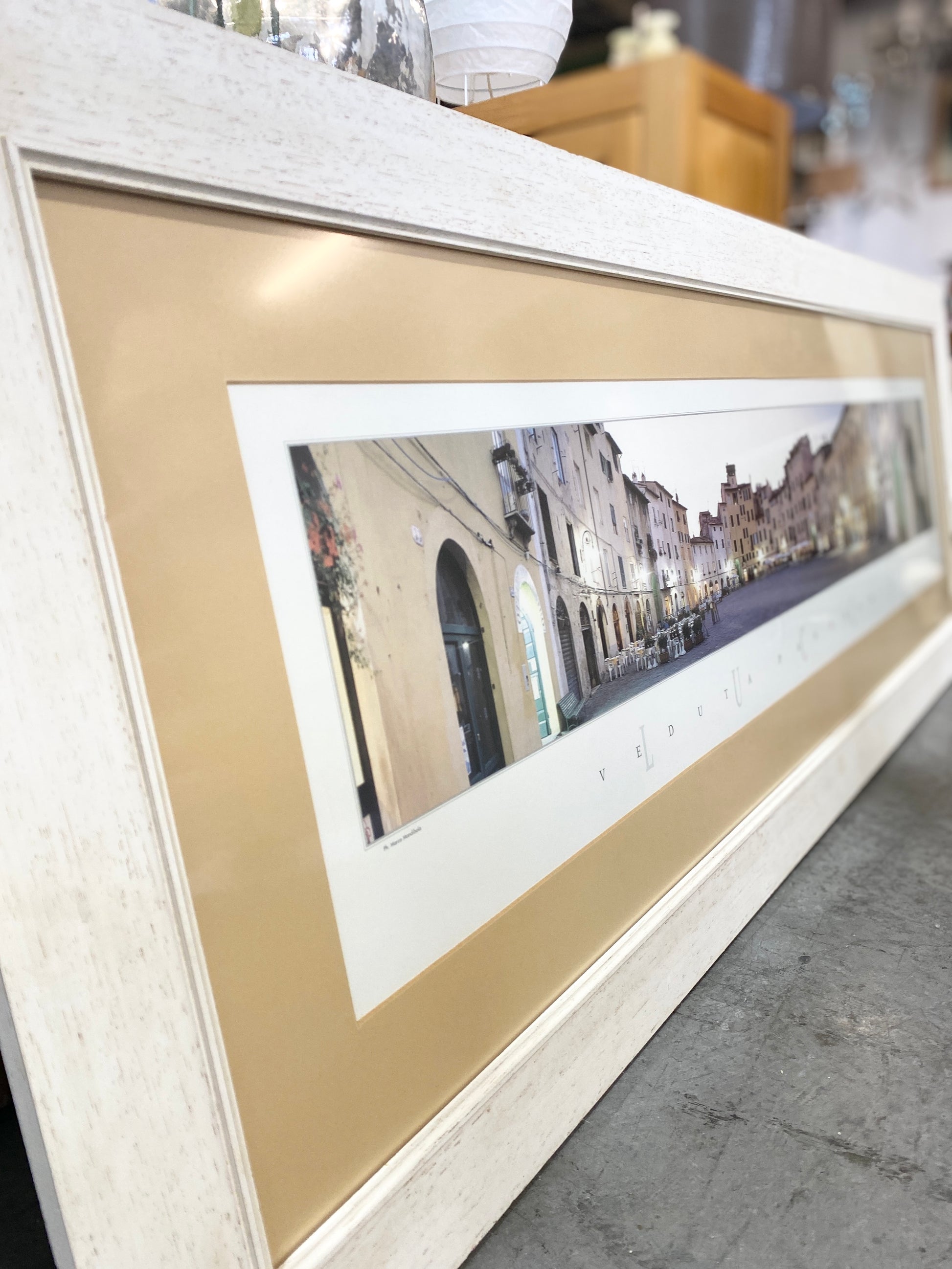 Esta é uma longa imagem italiana, emoldurada em uma moldura branca rústica e montada em uma base bege. Ela mostra a Piazza dell'Anfiteatro, uma praça famosa em Lucca, Itália. A imagem apresenta edifícios italianos tradicionais com fachadas coloridas, bem como restaurantes e cafés charmosos. A cena captura a atmosfera animada desta praça histórica.