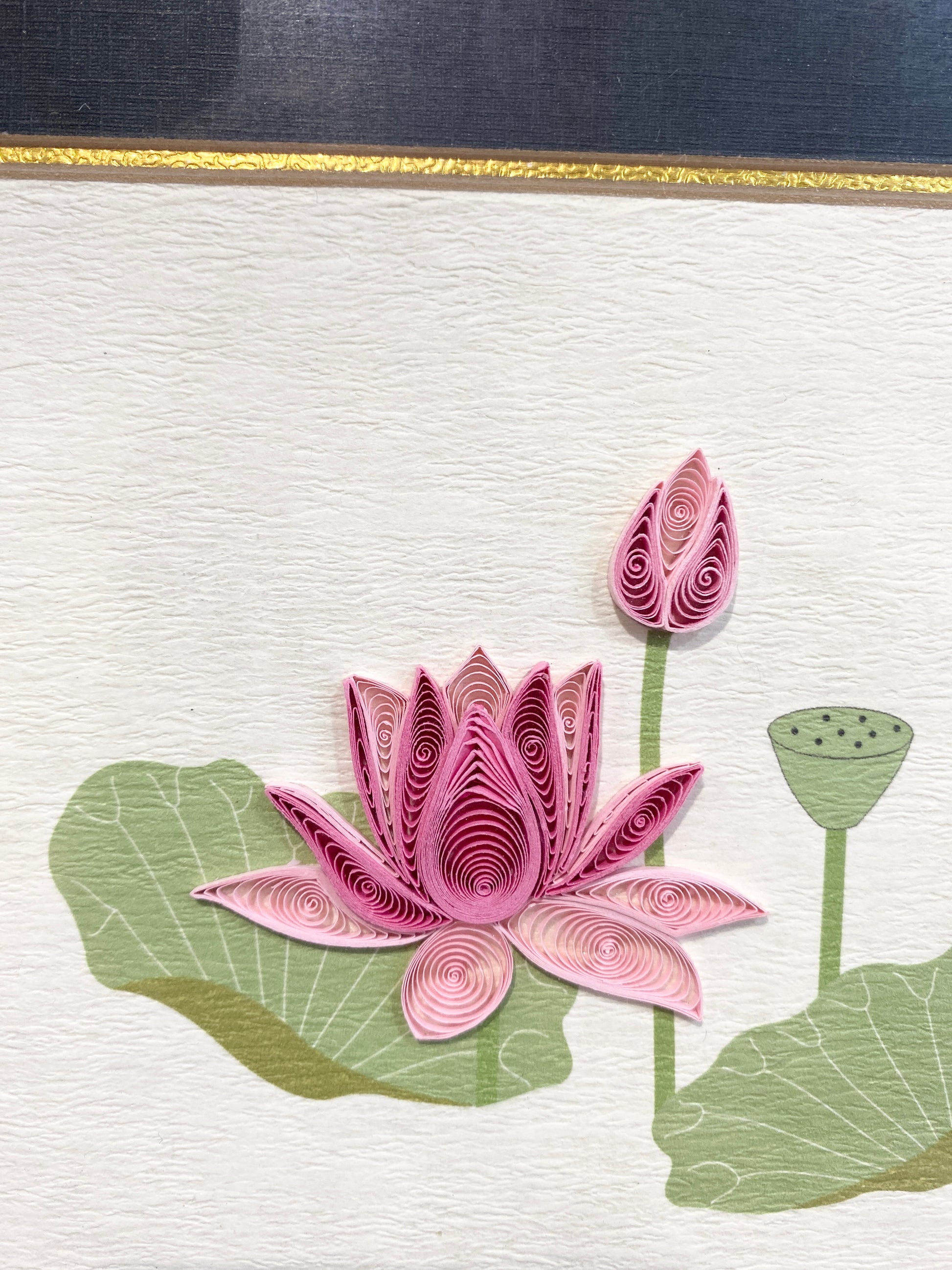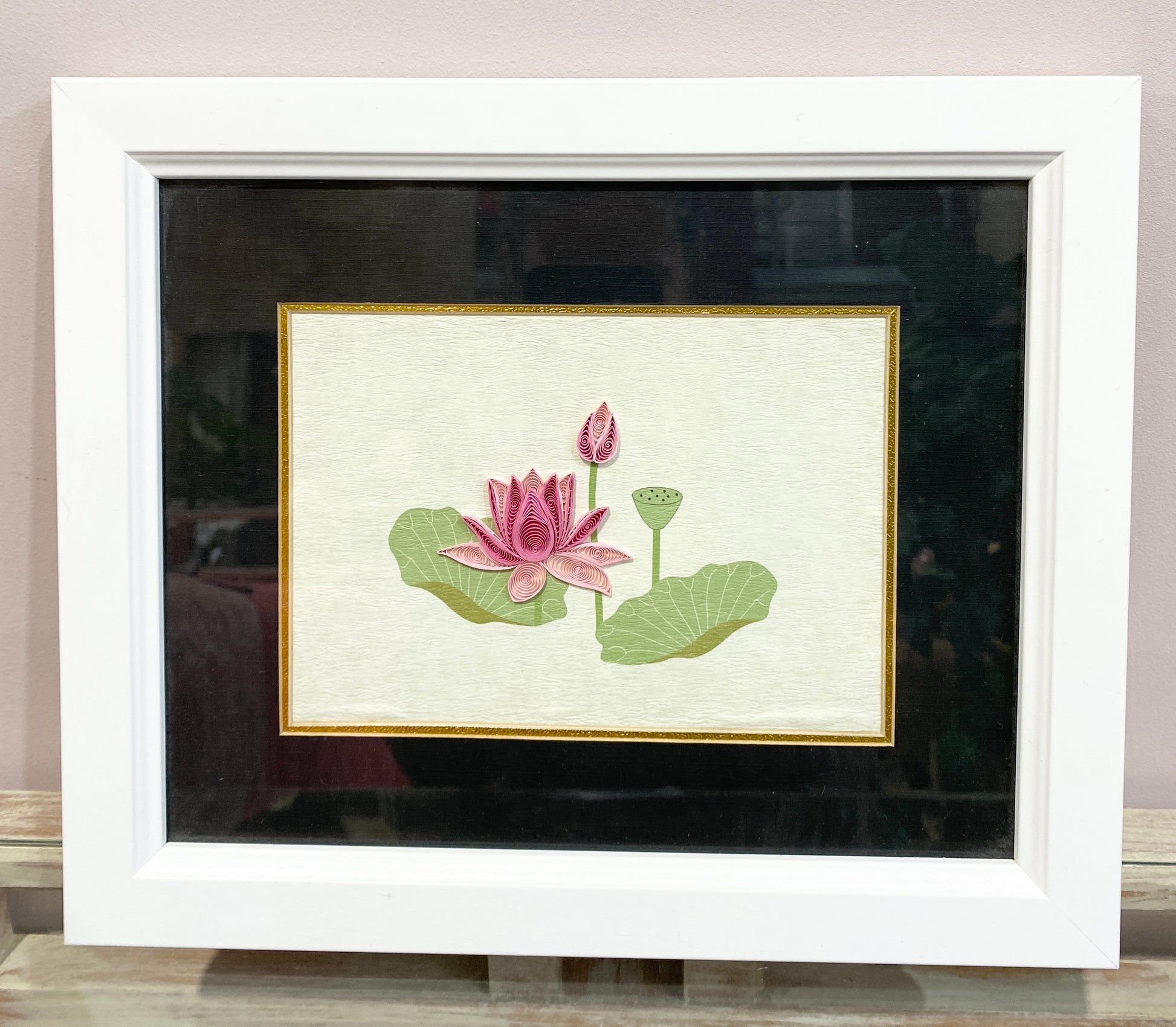 Esta bela obra de arte apresenta um delicado nenúfar rosa, feito com a técnica quilling. As bobinas de papel enroladas criam um adorável efeito tridimensional, dando vida à flor e suas folhas verdes. Emoldurado em branco com uma borda dourada, ele destaca os detalhes finos e o artesanato da filigrana de papel.