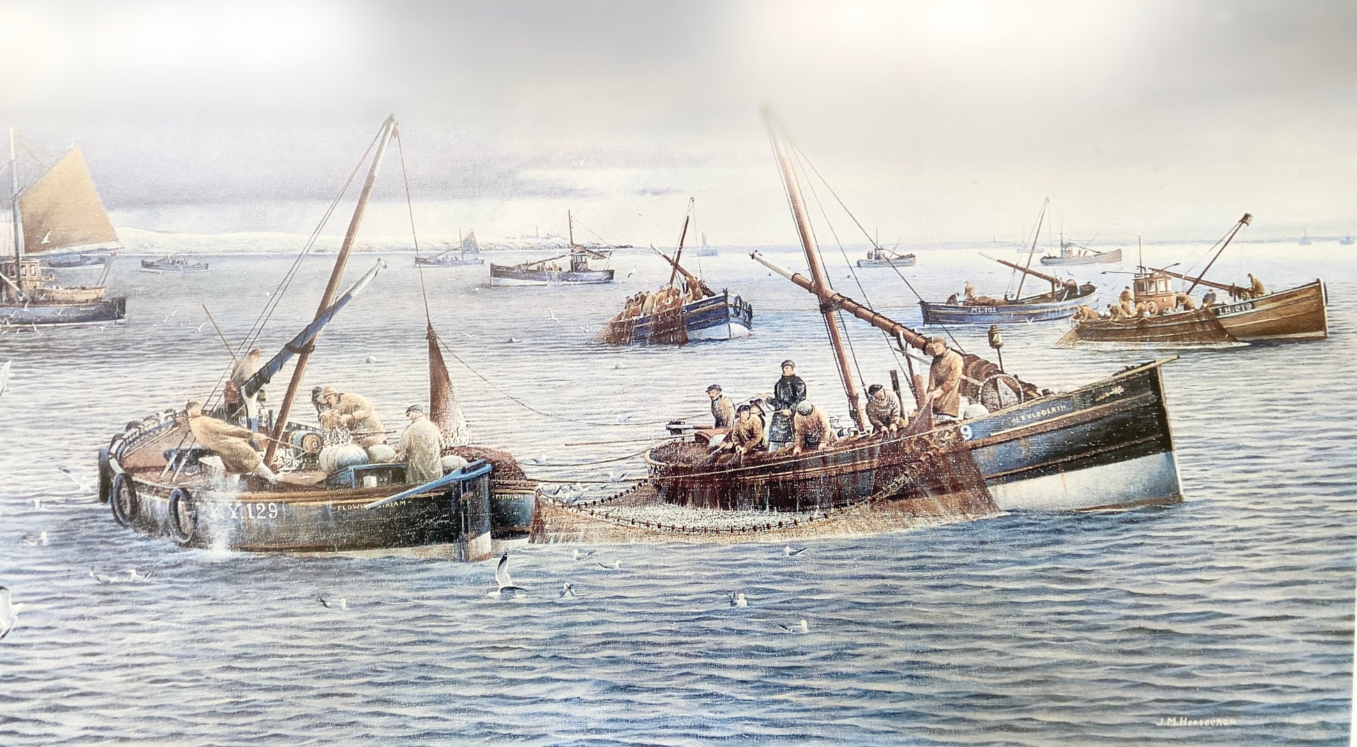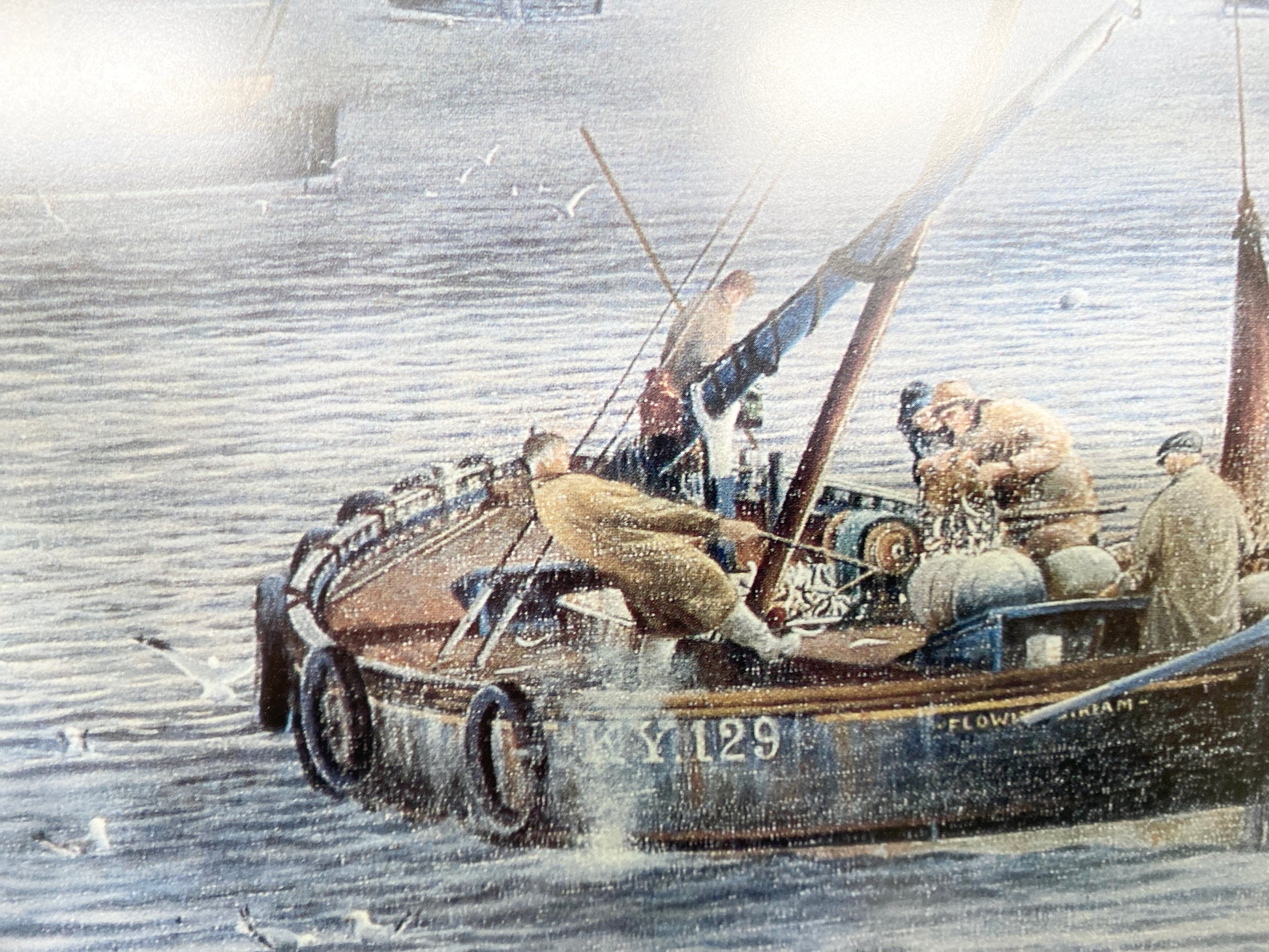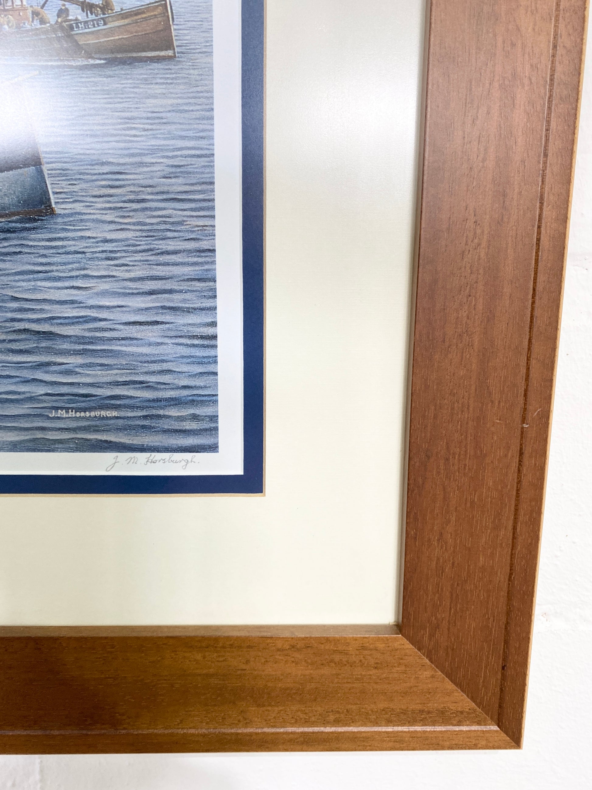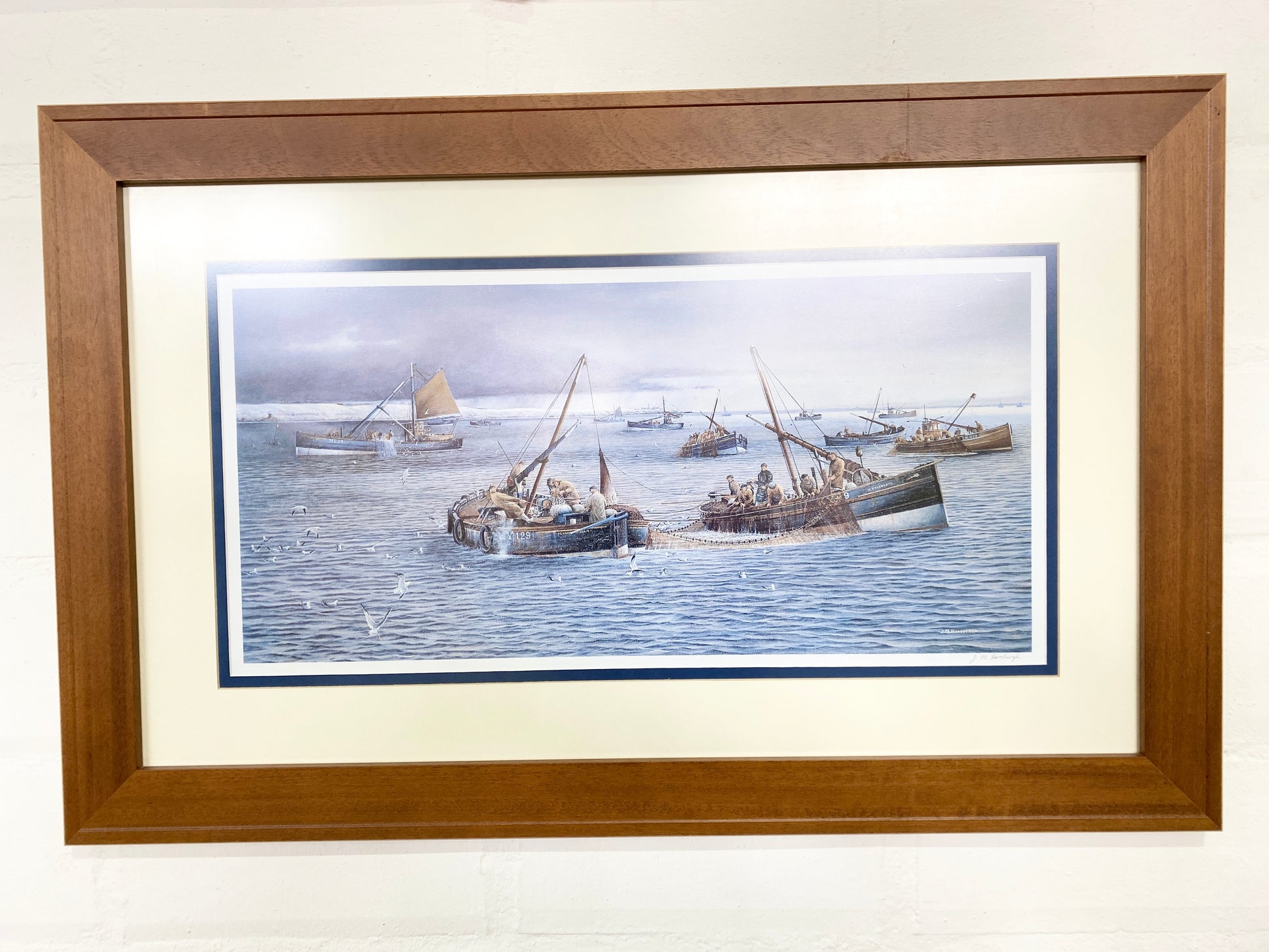 Uma grande impressão de barcos de pesca em uma moldura de madeira simples.
