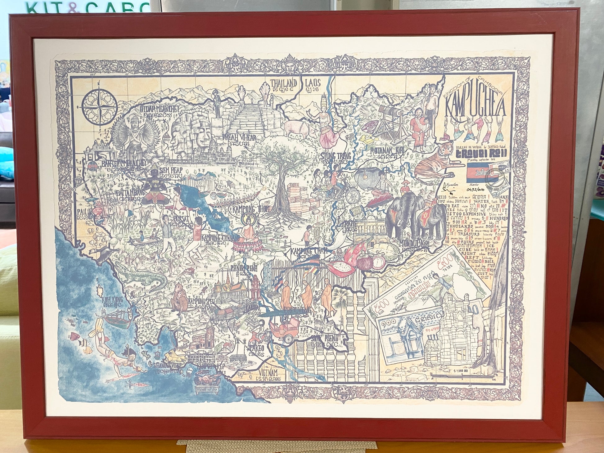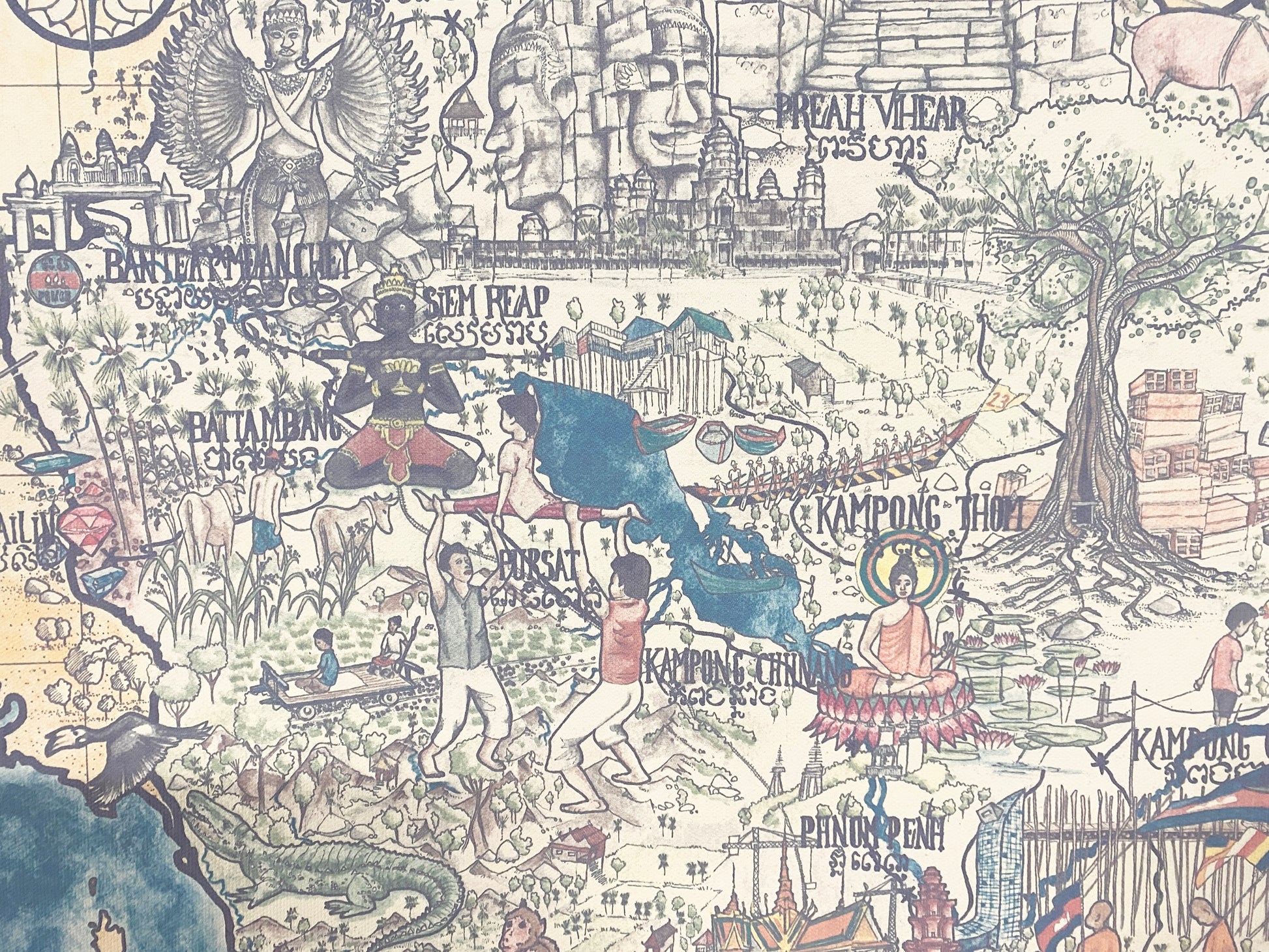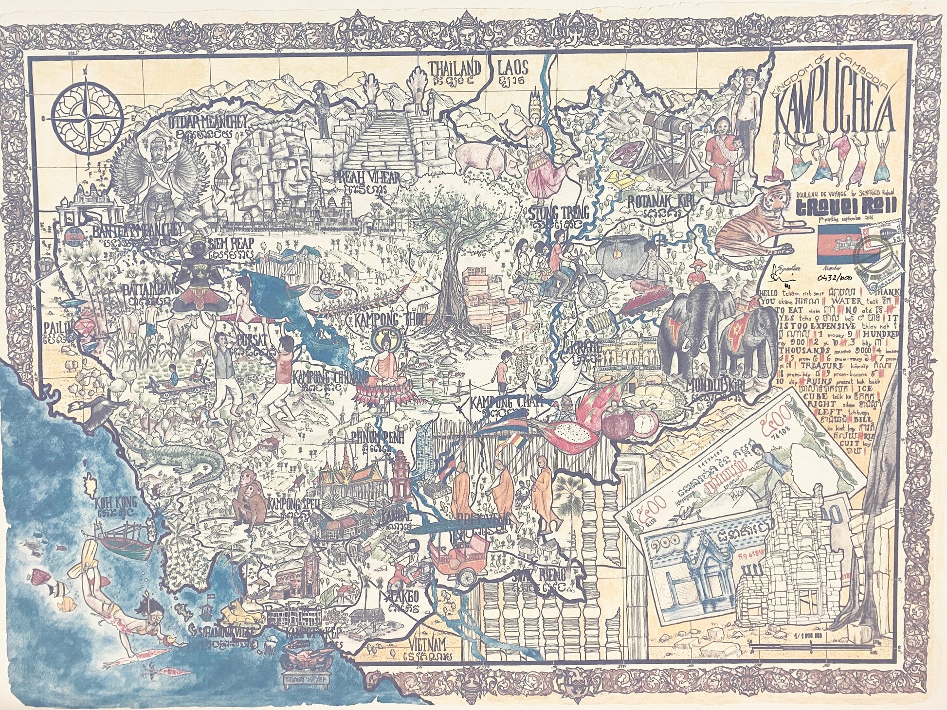 Um mapa turístico intrincado e estilizado do Camboja, pintado à mão com os principais pontos turísticos do país, emoldurado em vermelho.