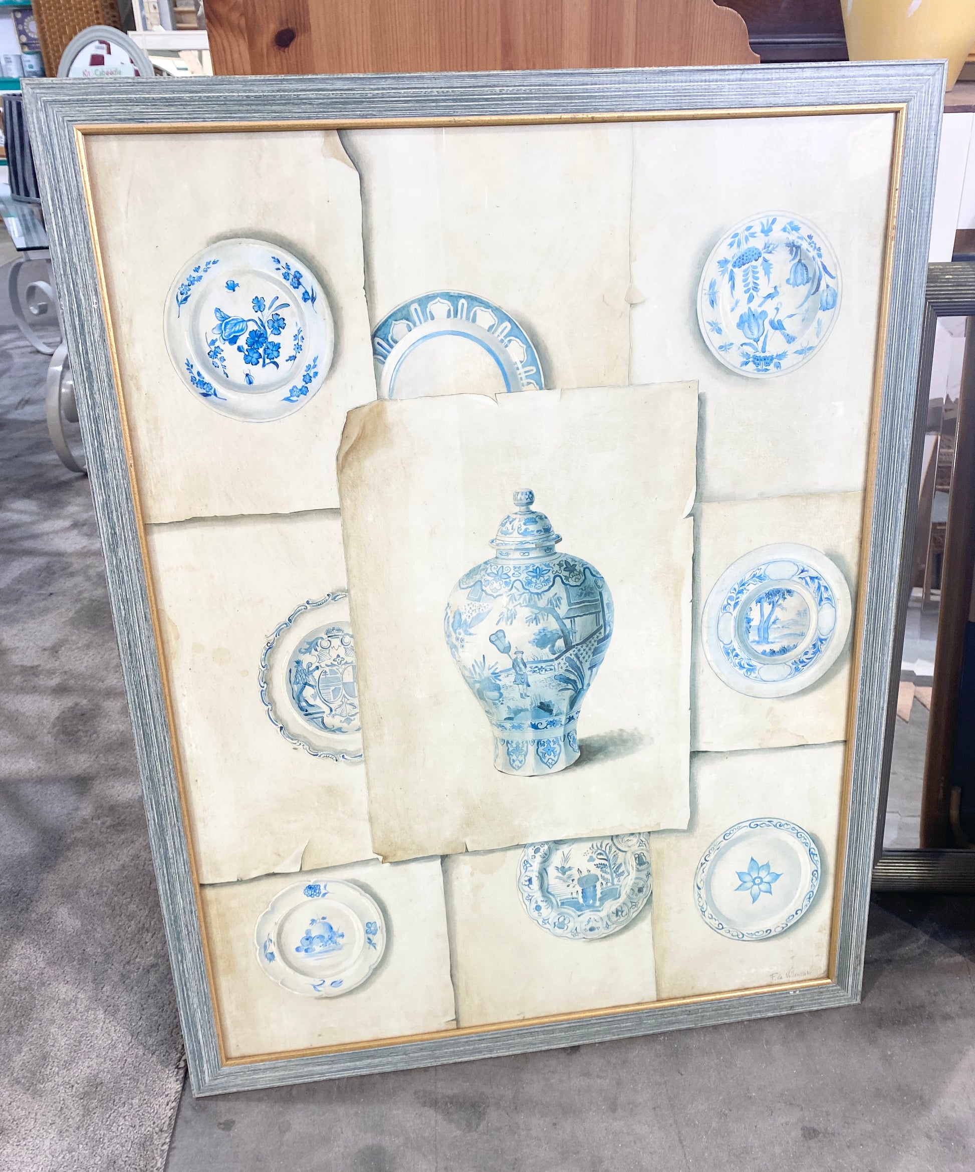 Charming kitchen-themed print featuring blue-toned dishes and pots against a soft cream background. A calming, country-style piece that adds warmth and character to any kitchen or dining space.