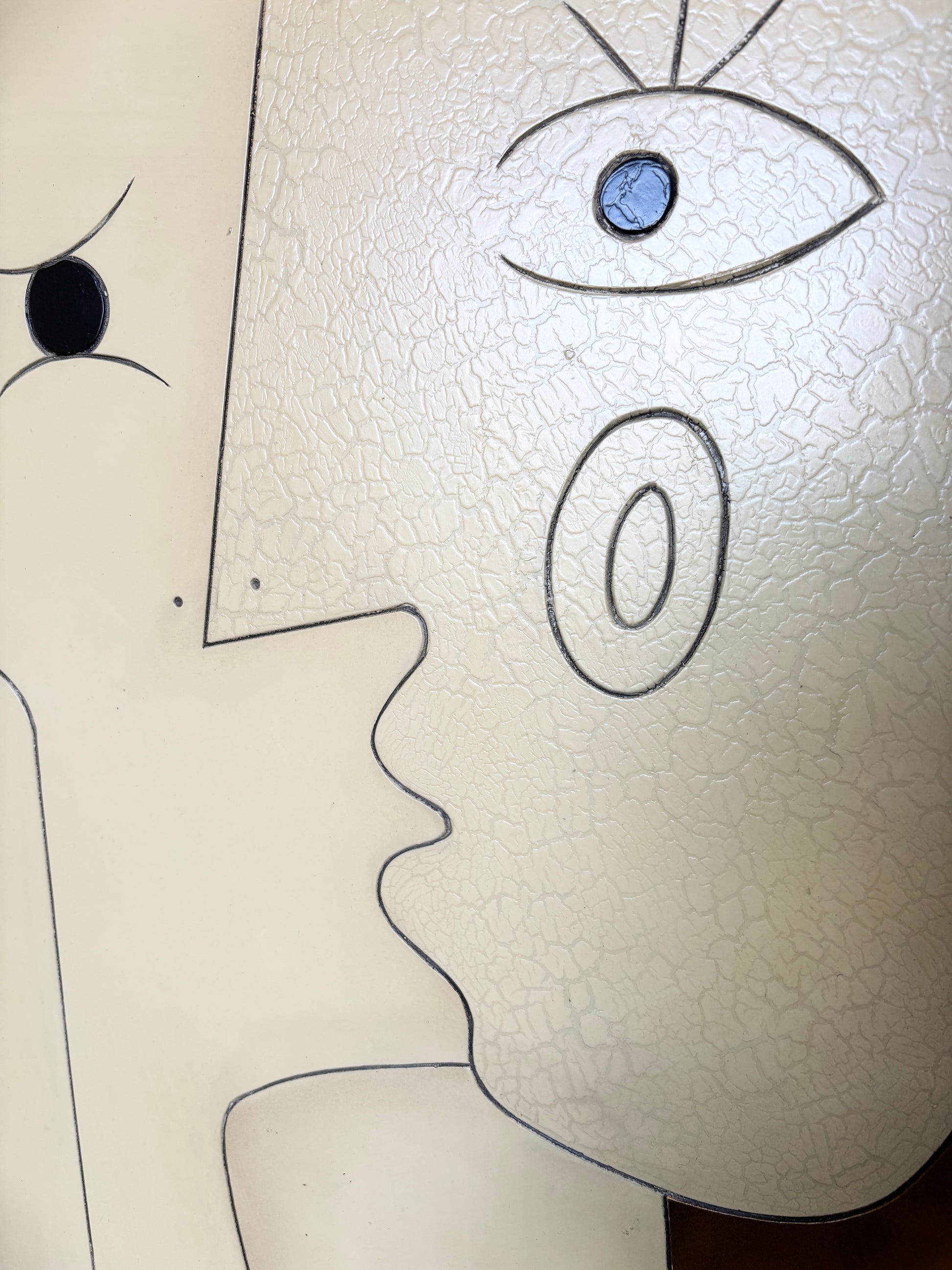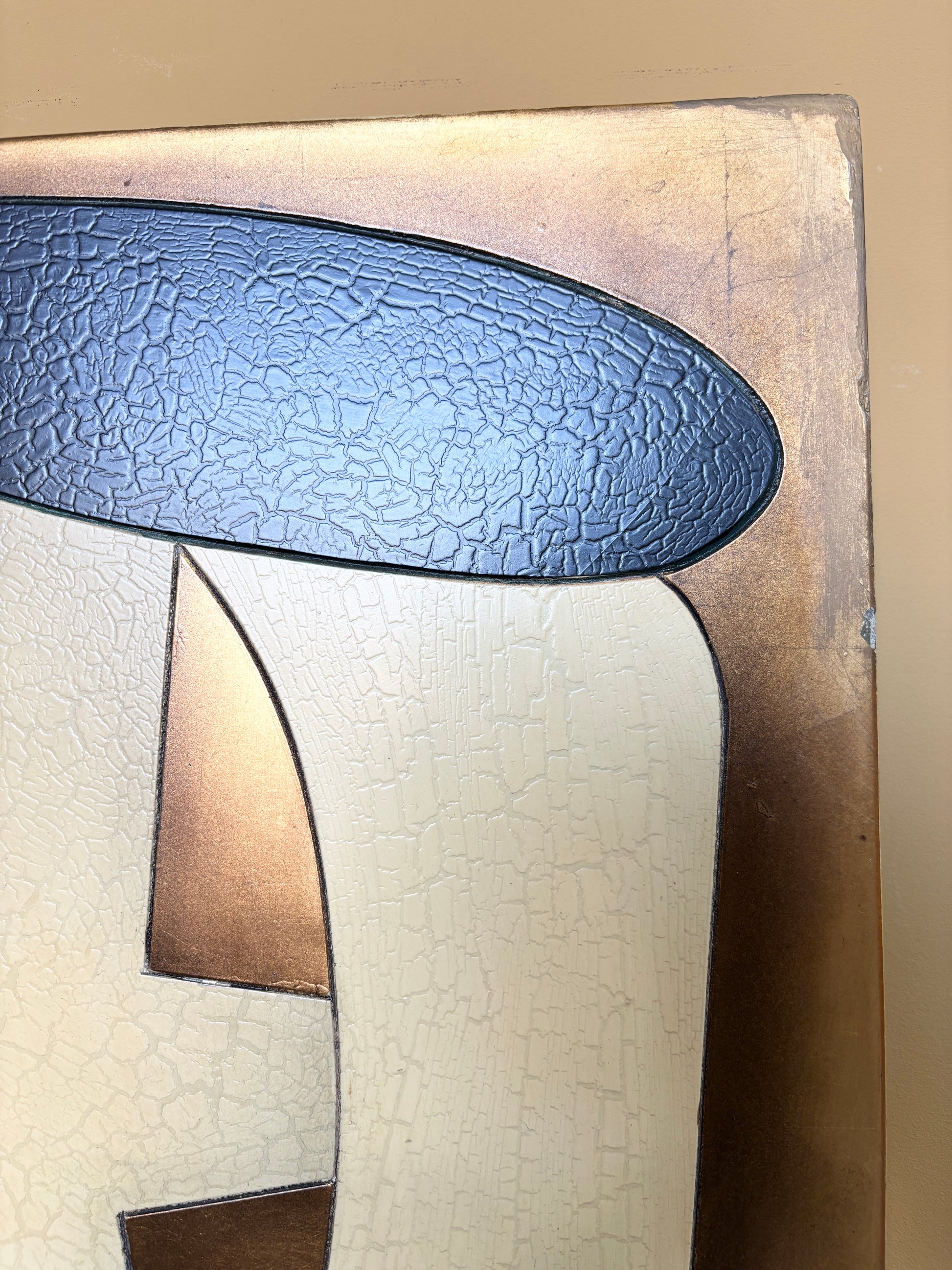 Uma pintura abstrata, evocativa do estilo de Picasso, de um casal abraçado sobre um fundo dourado metálico.