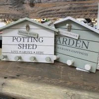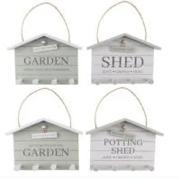 Uma mistura de placas de madeira em tons de branco e verde-sálvia, completas com textos sobre galpão e jardim e ganchos espaçosos para pendurar.