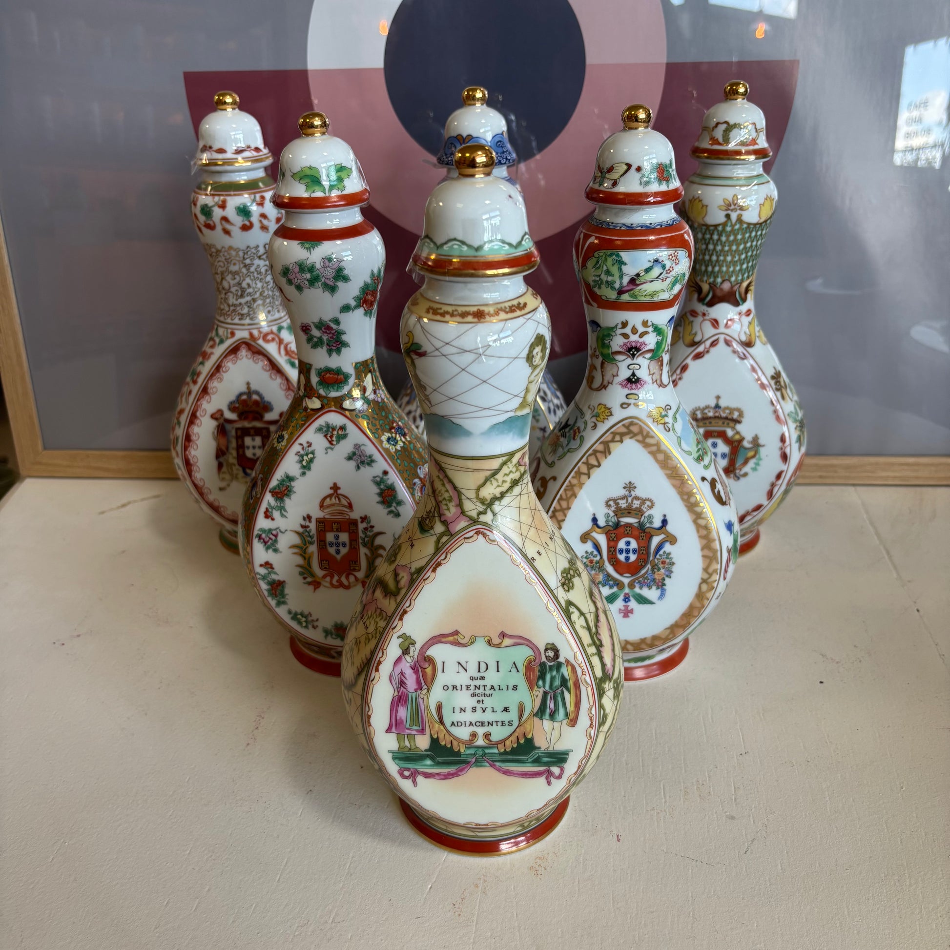 Conjunto de 6 peças em porcelana moldada e repuxada, comercializadas pelas 'Coleções Orbis', obras do séc. Corpos bulbosos, ricamente decorados em vários tons sobre fundo branco, ao estilo da Companhia das Índias. Ao centro, encontram-se os brasões e timbres dos reis portugueses, ladeados por motivos florais e ornitológicos, arabescos, filigranas e ornamentos em ouro. Edição limitada de 1998, pintada à mão. Versos com o nome de cada rei e a sua cronologia. “Rei D. Luís I” ; “Rei D João VI” ; “Rei D. Pedro IV” ; “Rei D. João V” ; “Rei D. Carlos I” ; “Índia Orientalis” .
