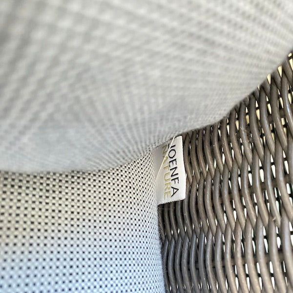 Um fantástico conjunto de mobiliário de vime para exterior, composto por um sofá de 3 lugares, 2 cadeirões e uma mesa de centro. Trata-se de um vime de grande qualidade, trazido da empresa espanhola Joenfa. Compre logo antes que esgote! O estofo cinzento-claro está em ótimo estado e todos os artigos possuem fechos para facilitar a limpeza.