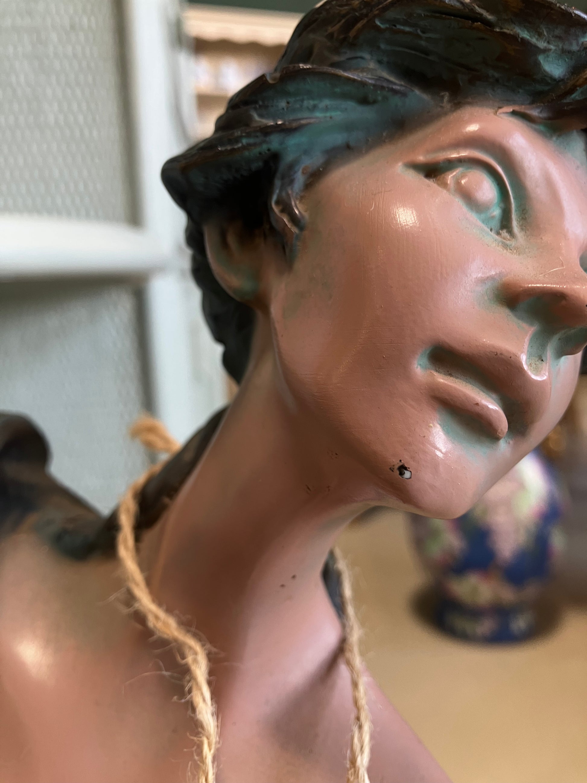 Escultura graciosa e artística de uma mulher com trajes esvoaçantes, com acabamento em pátina de bronze. Montada sobre uma base resistente, esta peça marcante acrescenta um toque artístico e elegância a qualquer espaço.