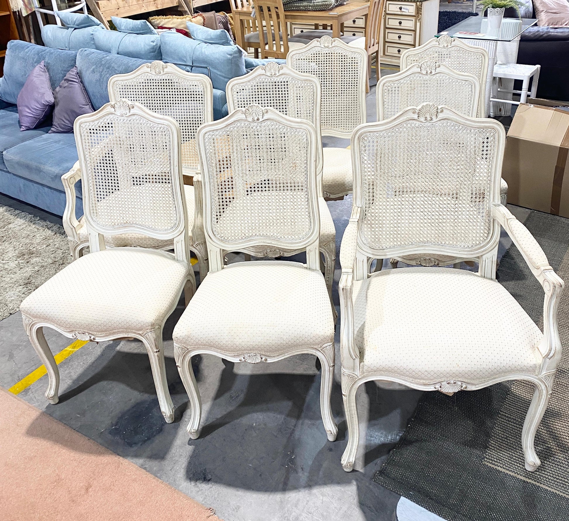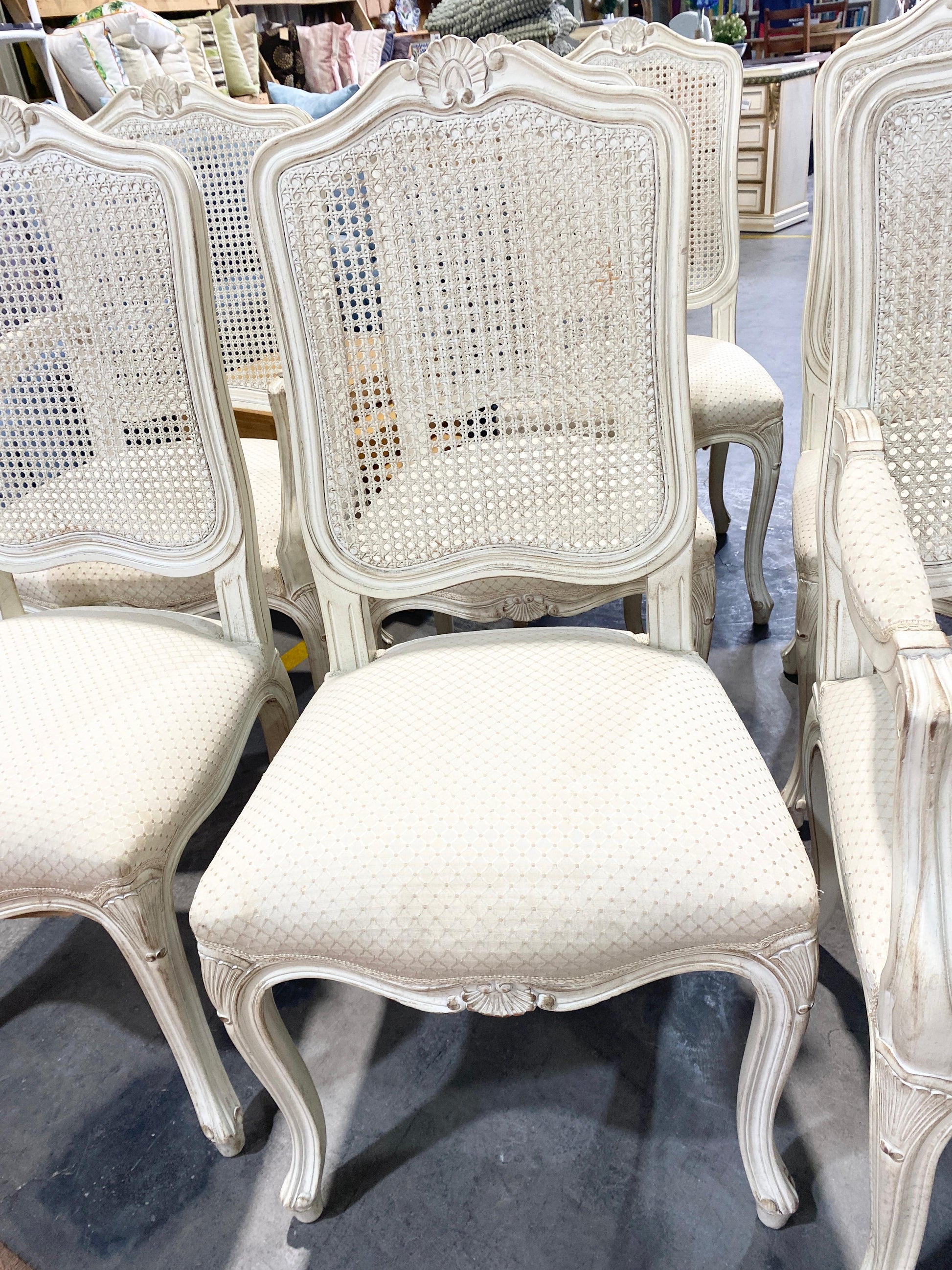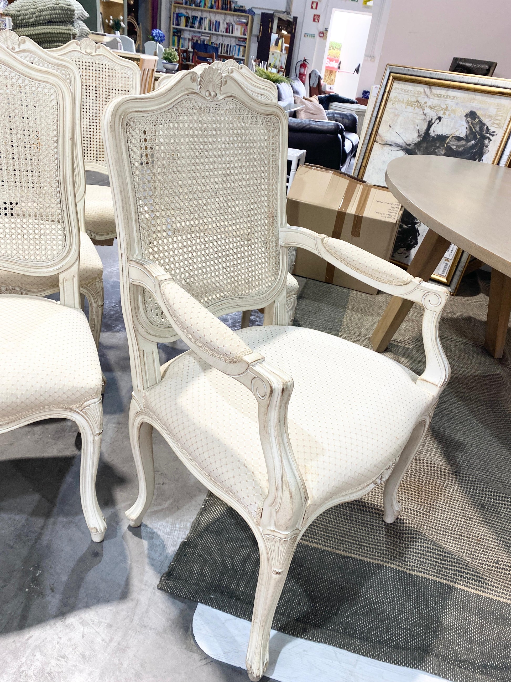 Traga a elegância intemporal à sua casa com este requintado conjunto de 8 cadeiras de jantar em estilo Luís XV. Belíssimo, com uma estrutura de madeira esculpida e delicadas pernas cabriolé, este conjunto exibe as curvas refinadas e os detalhes intrincados característicos do design clássico francês. O encosto em palhinha entrançada à mão confere leveza e charme, enquanto o assento estofado e os braços almofadados garantem conforto e sofisticação. Com um acabamento num tom marfim suave e desgastado, esta peça combina na perfeição com interiores de inspiração francesa, campestre, shabby chic ou vintage.