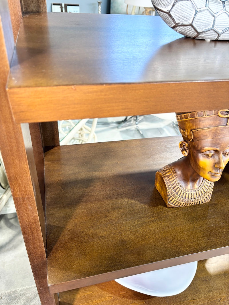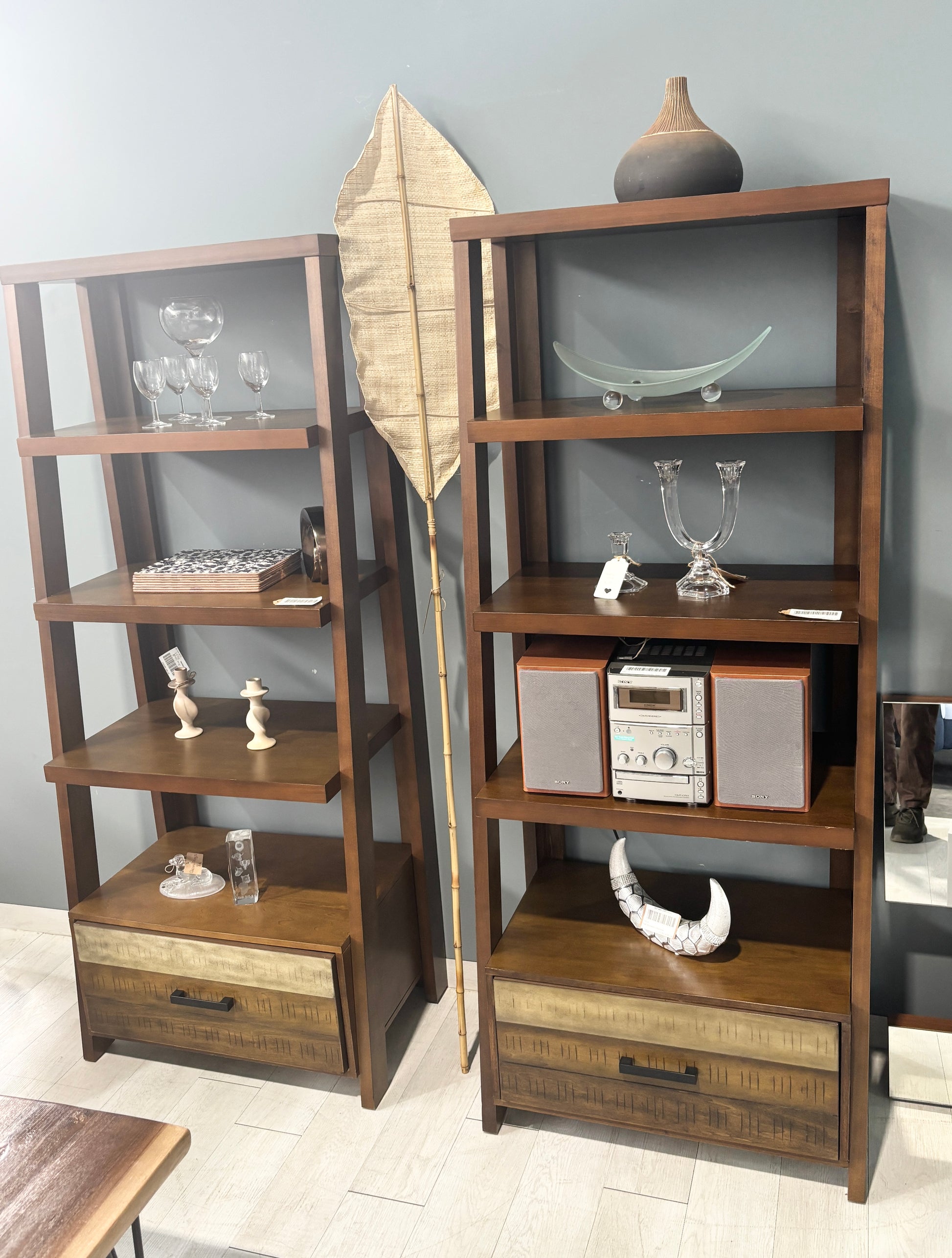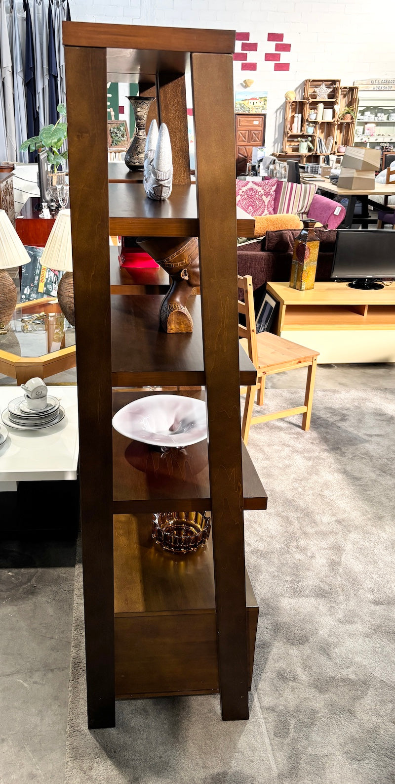 Esta é uma estante alta, com prateleiras que diminuem de tamanho de baixo para cima, criando um efeito inclinado. Há bastante espaço para arrumação, incluindo uma gaveta grande com um puxador de metal na parte inferior. Temos duas destas estantes disponíveis, vendidas em separado.