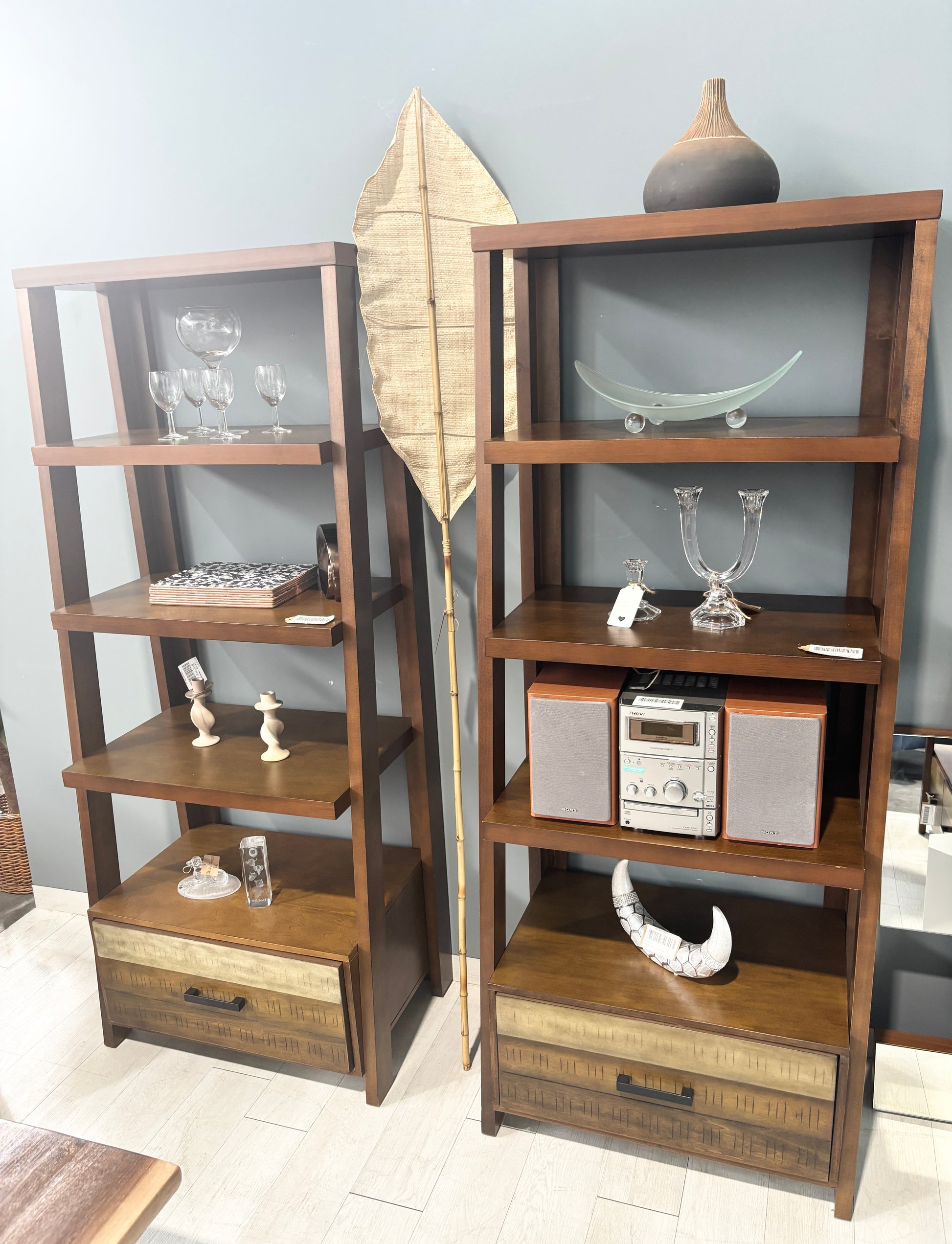 Esta é uma estante alta, com prateleiras que diminuem de tamanho de baixo para cima, criando um efeito inclinado. Há bastante espaço para arrumação, incluindo uma gaveta grande com um puxador de metal na parte inferior. Temos duas destas estantes disponíveis, vendidas em separado.
