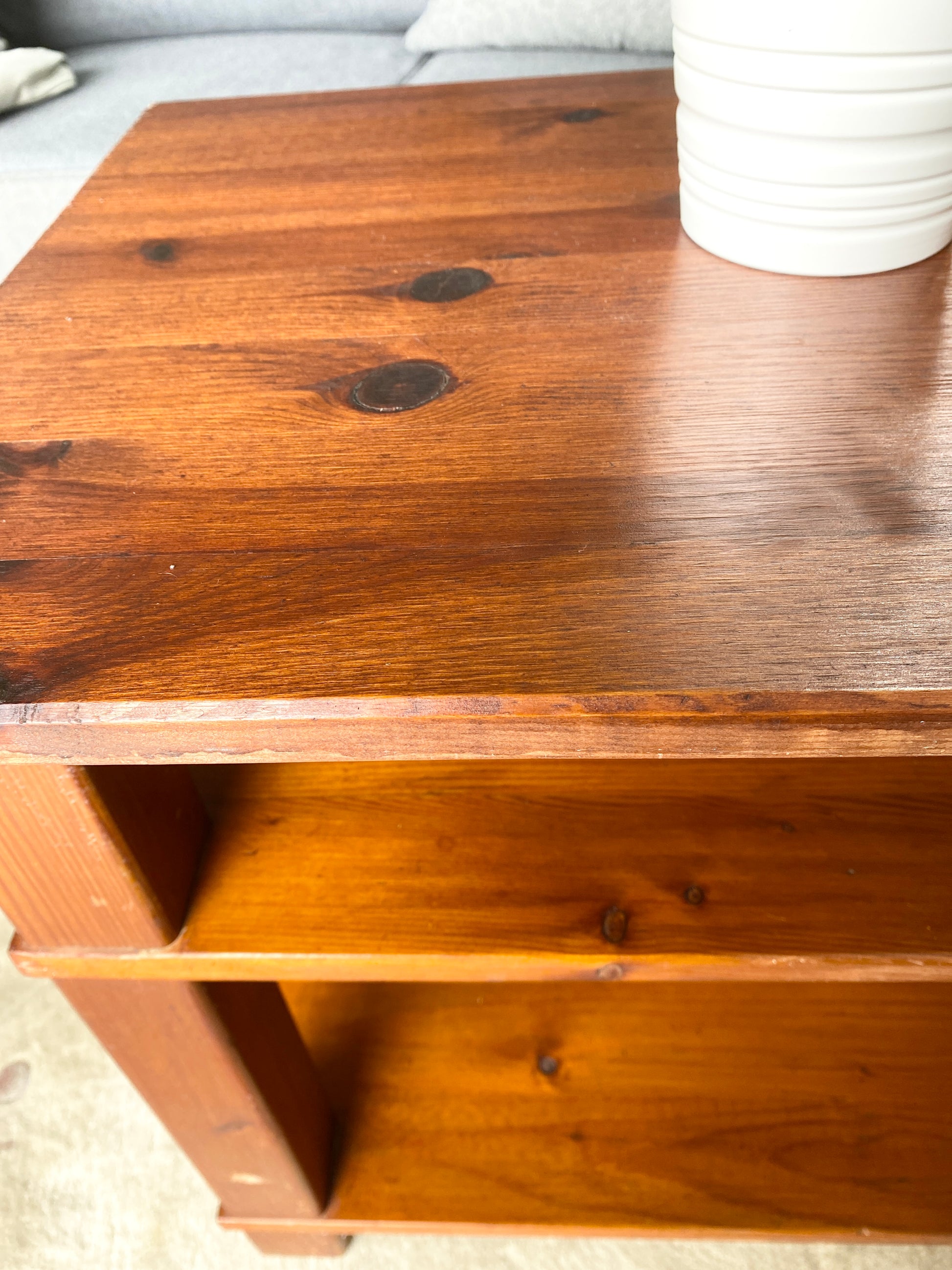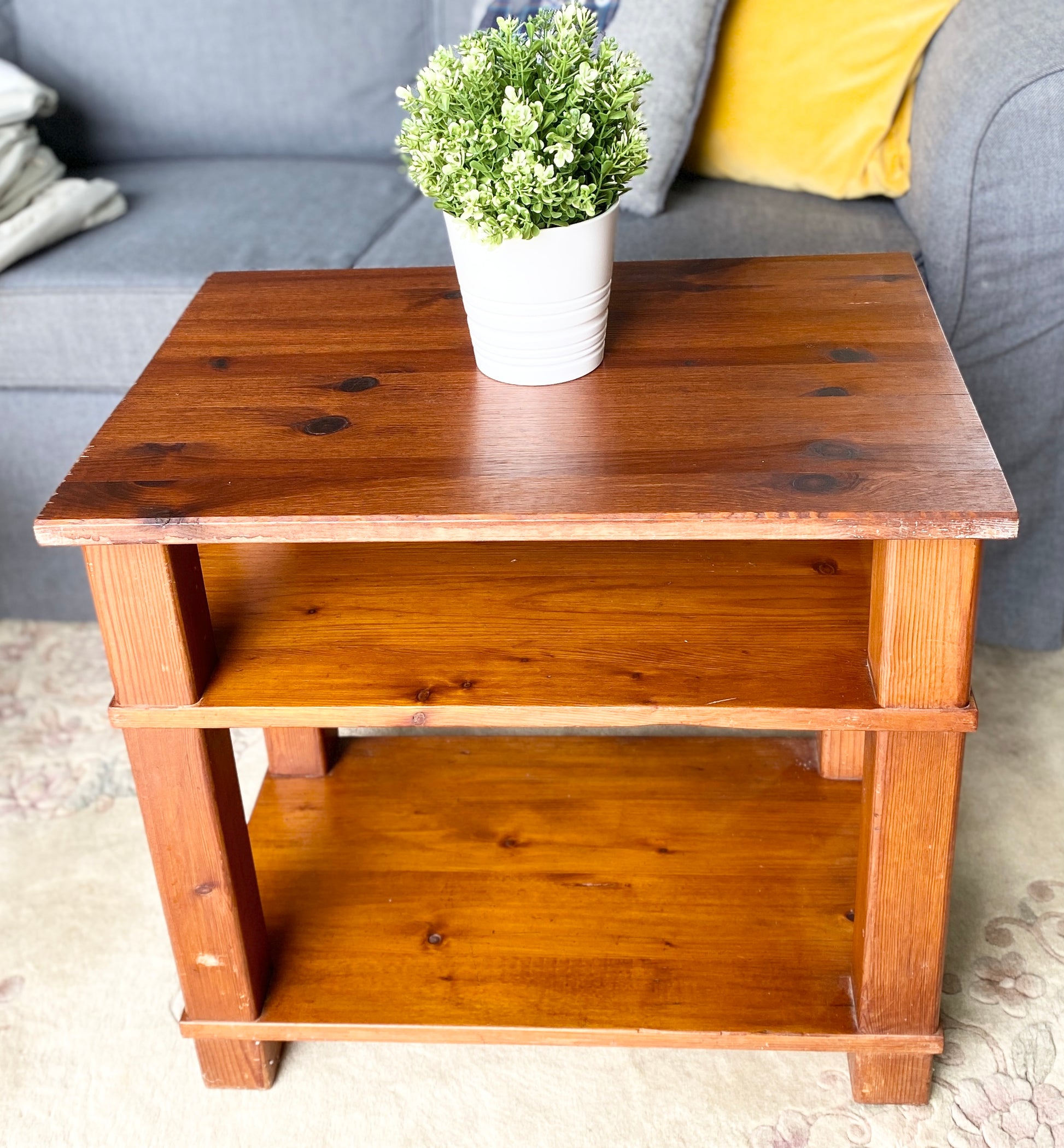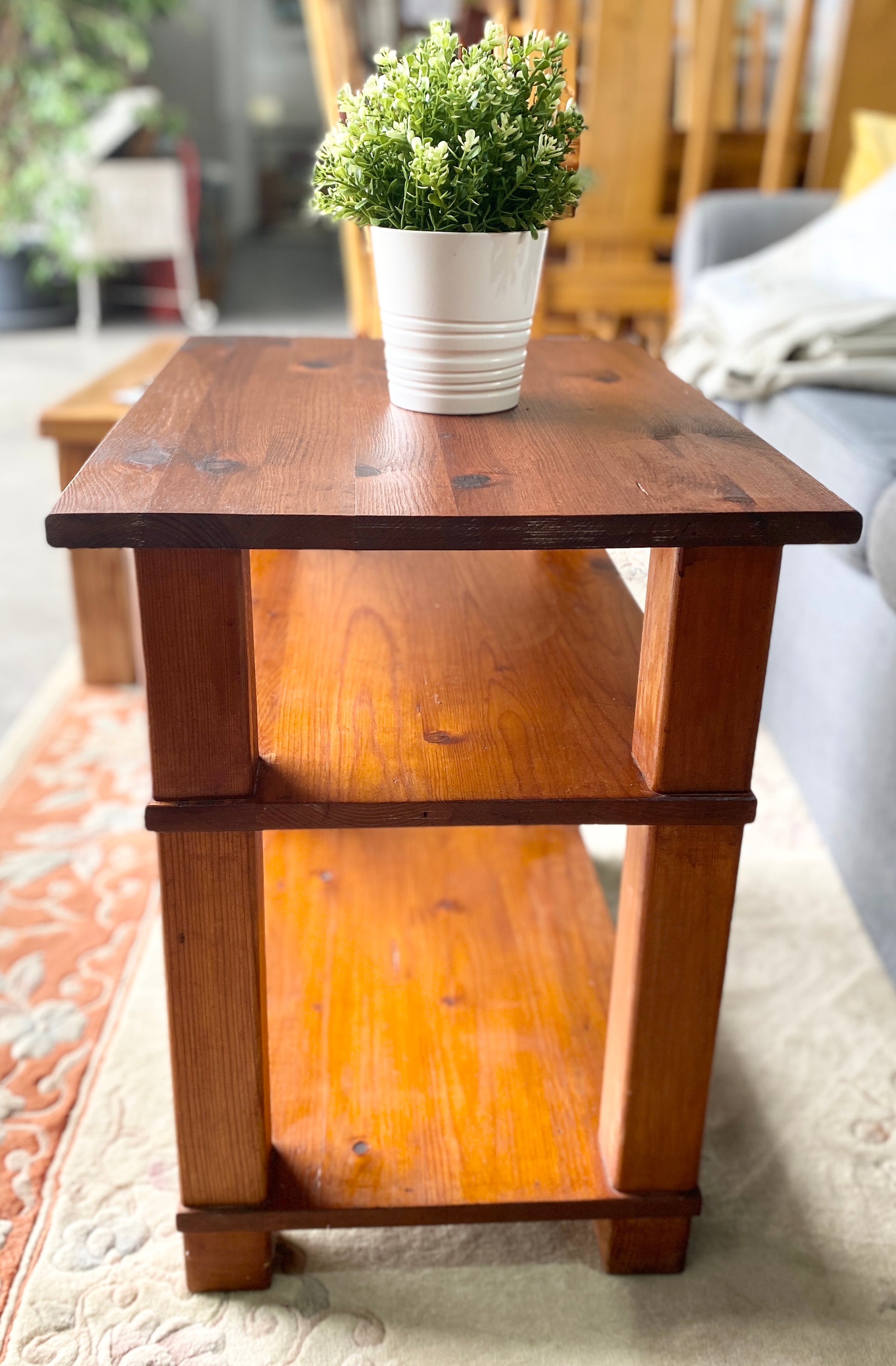 Uma mesa lateral simples de madeira maciça com duas prateleiras abaixo. Sua rica cor de madeira e simplicidade fazem dela uma peça versátil para qualquer cômodo.