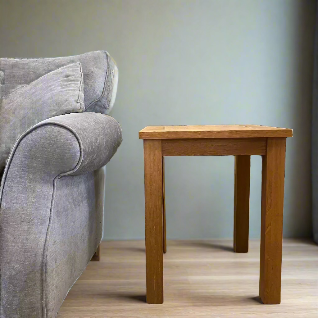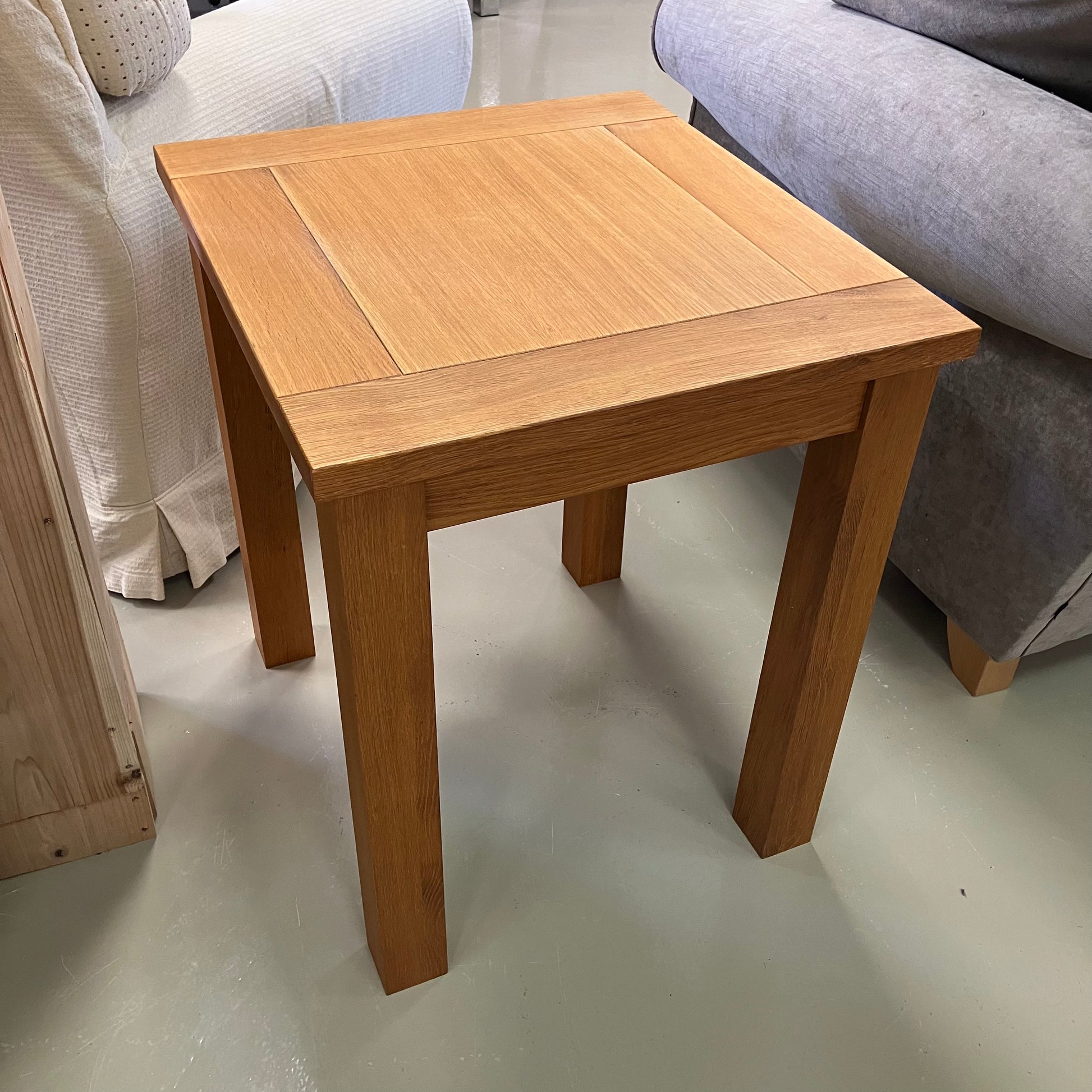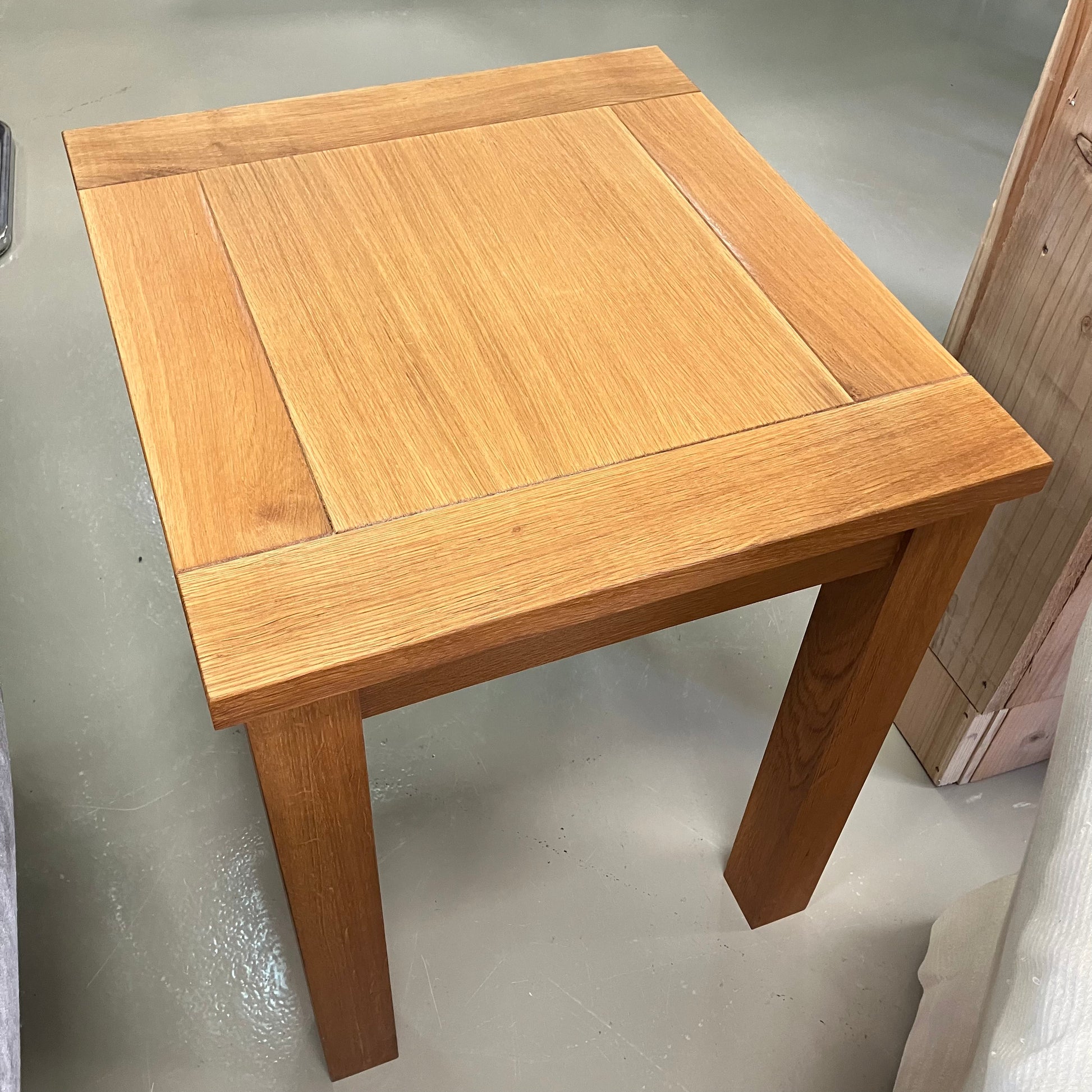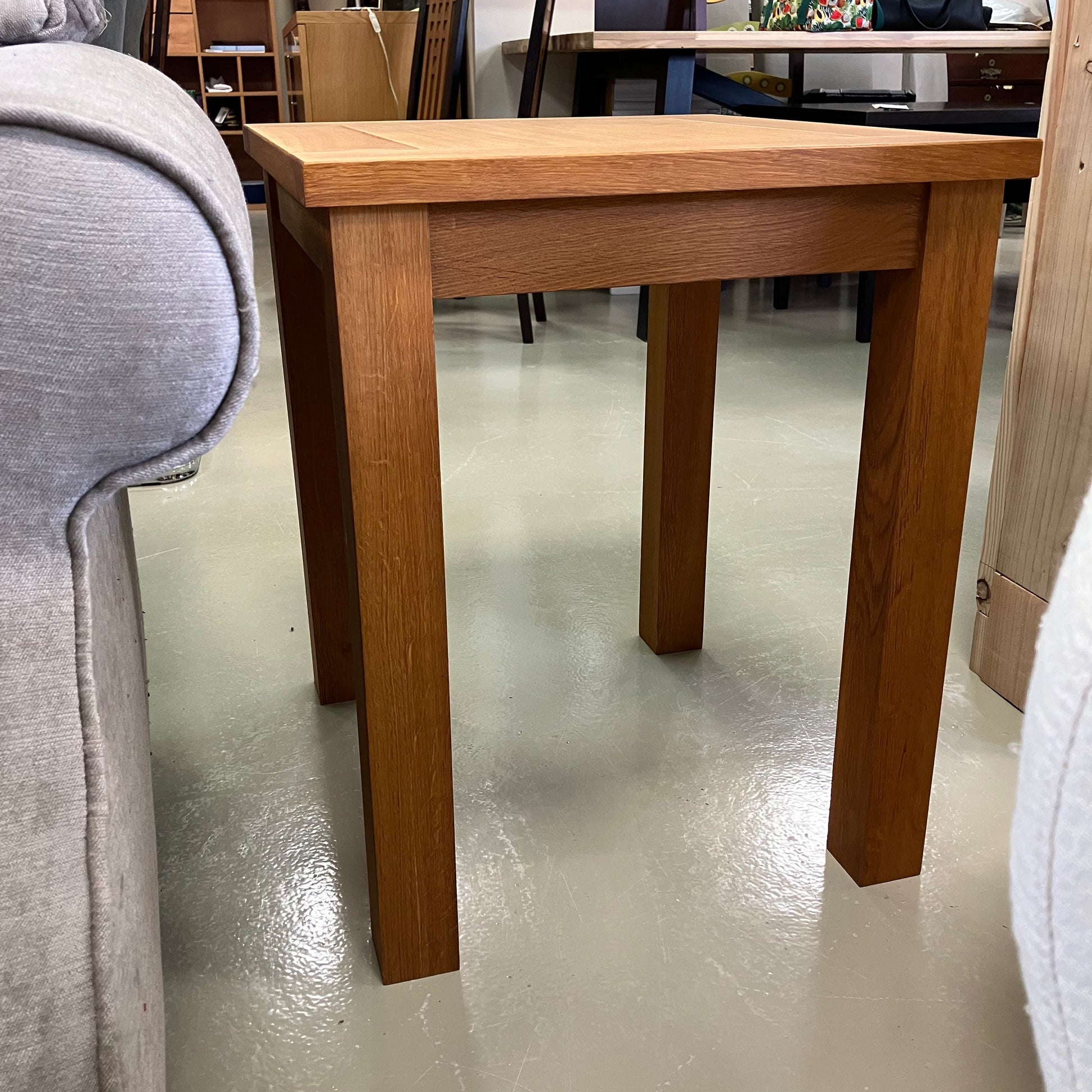 Minimalist square table in a warm oak finish. Great as a lamp table or accent piece.