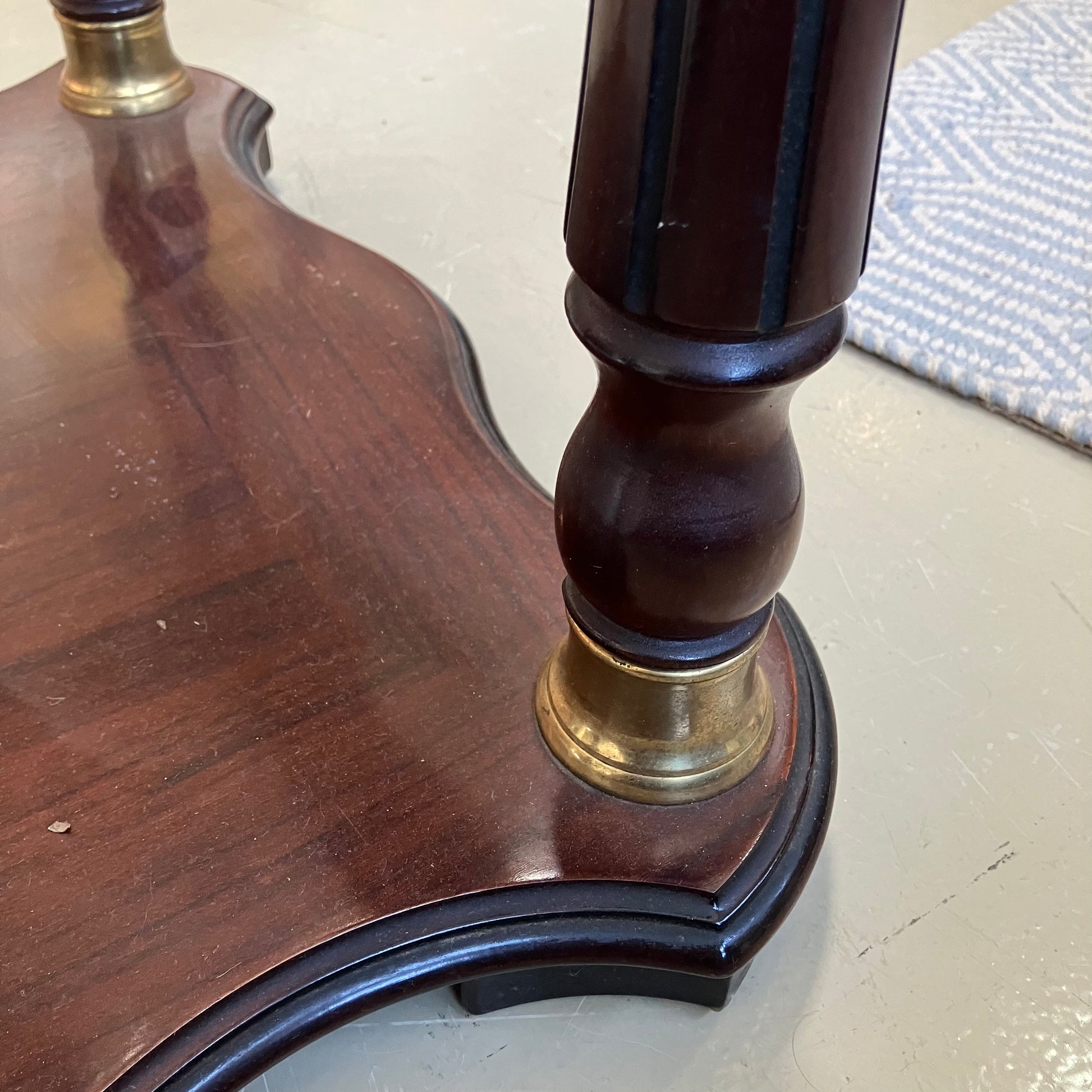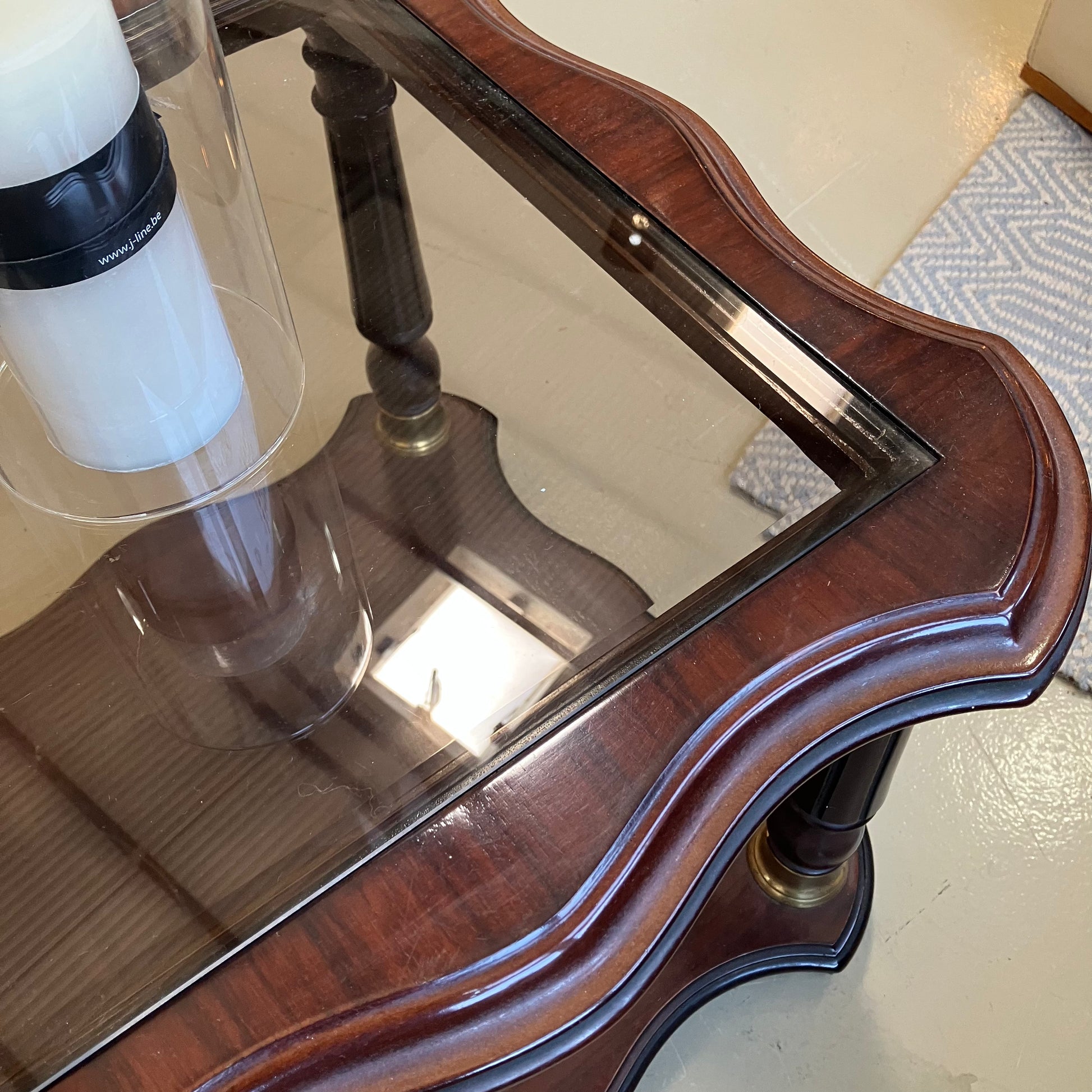 Elegante mesa de apoio quadrada com estrutura de madeira esculpida e prateleira inferior para maior arrumação. O tampo de vidro e as bordas curvas criam um aspeto requintado, ideal para usar ao lado de um sofá ou de uma poltrona.