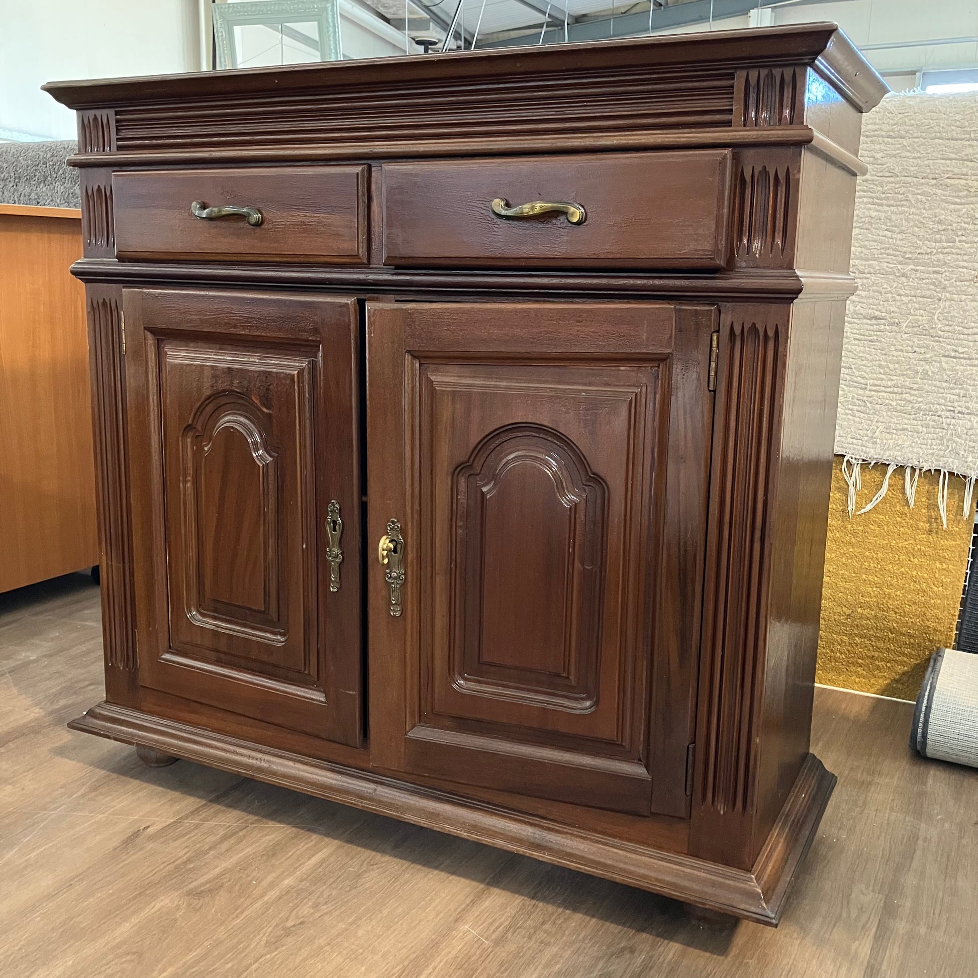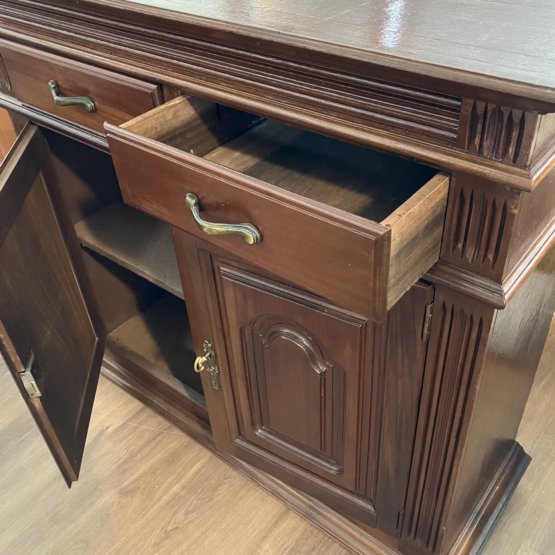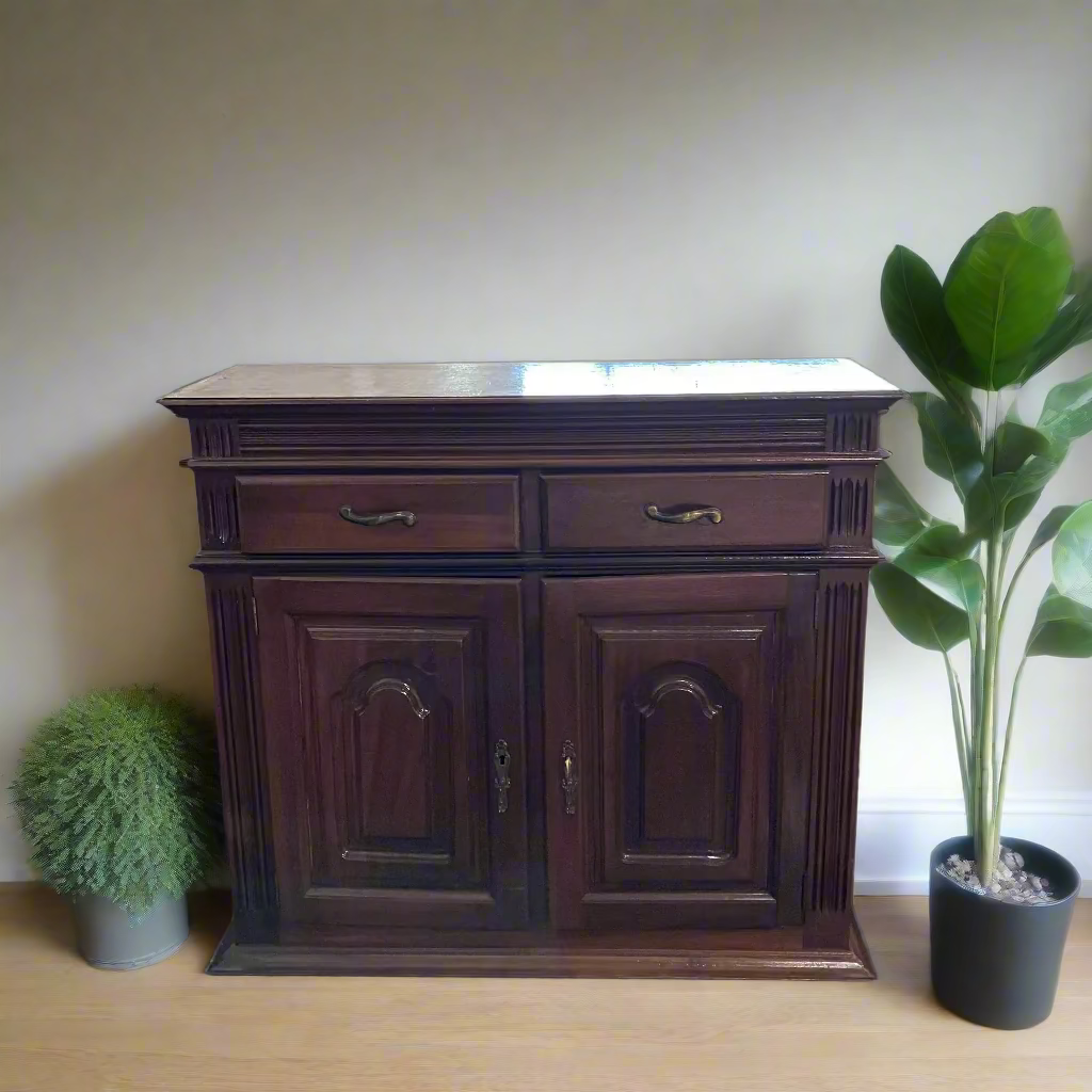 Um aparador em tons ricos com detalhes decorativos esculpidos e ferragens em latão. Perfeito para armazenamento extra na cozinha ou sala de jantar com um toque tradicional.