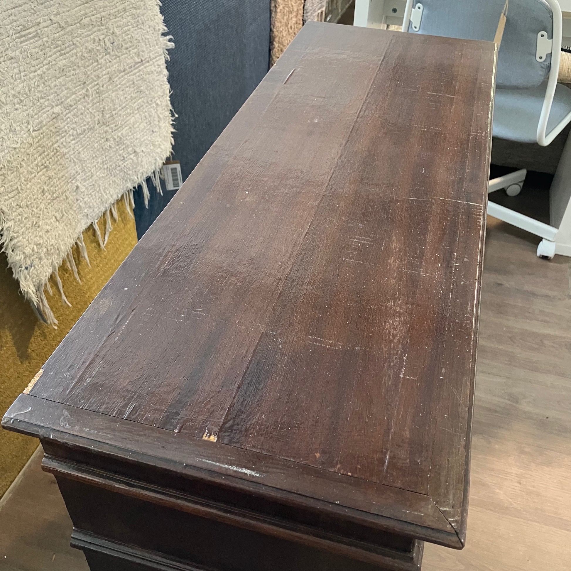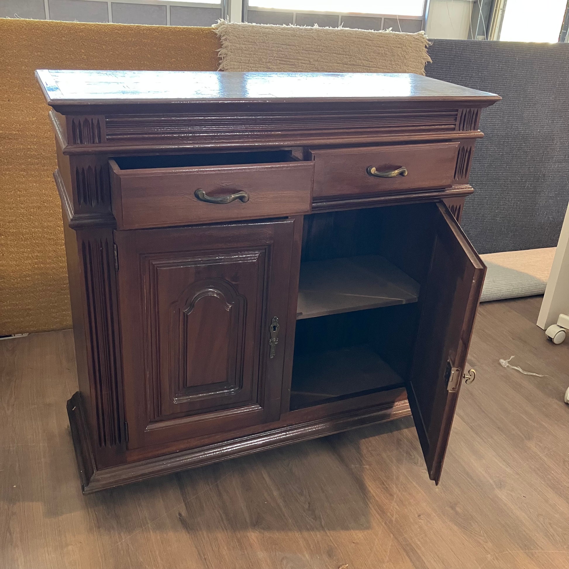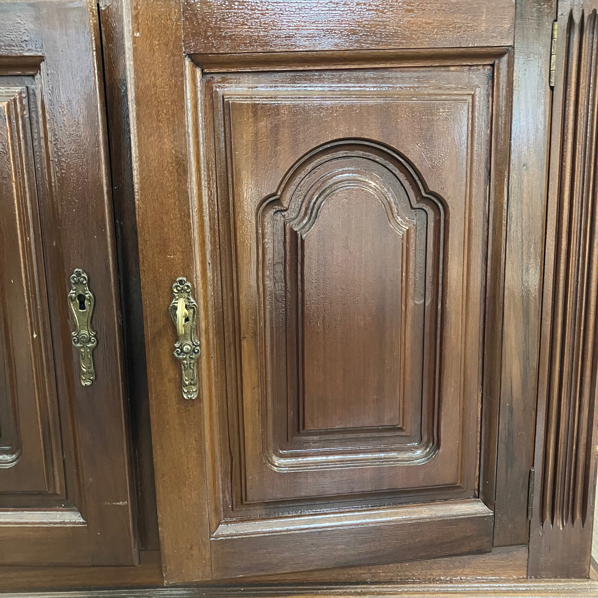 Um aparador em tons ricos com detalhes decorativos esculpidos e ferragens em latão. Perfeito para armazenamento extra na cozinha ou sala de jantar com um toque tradicional.