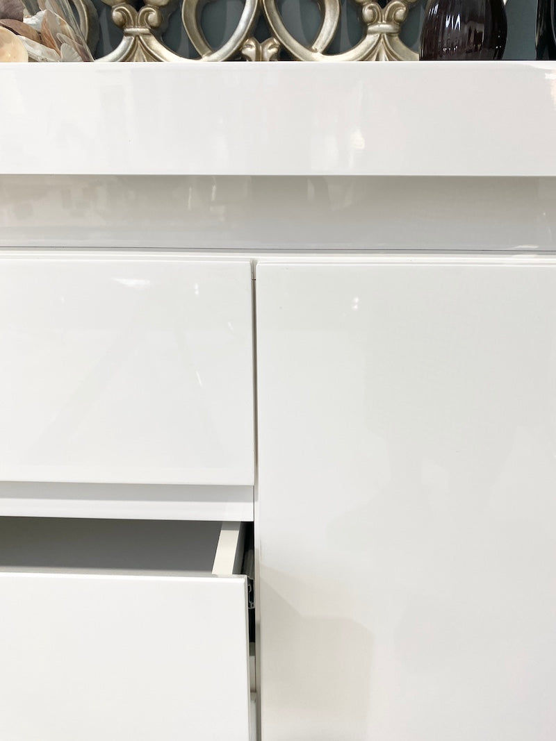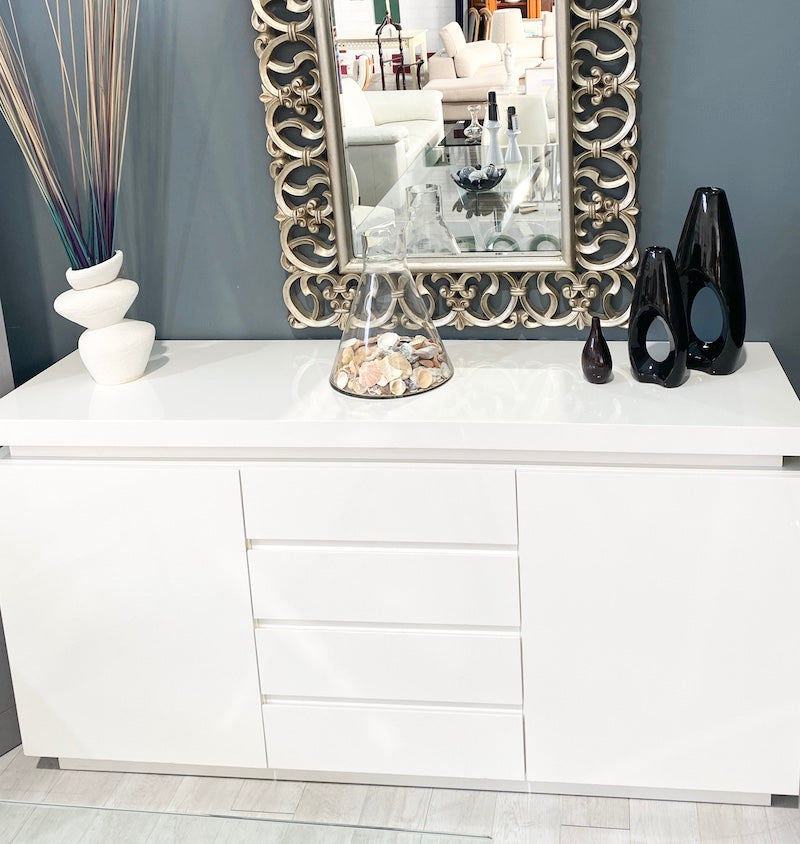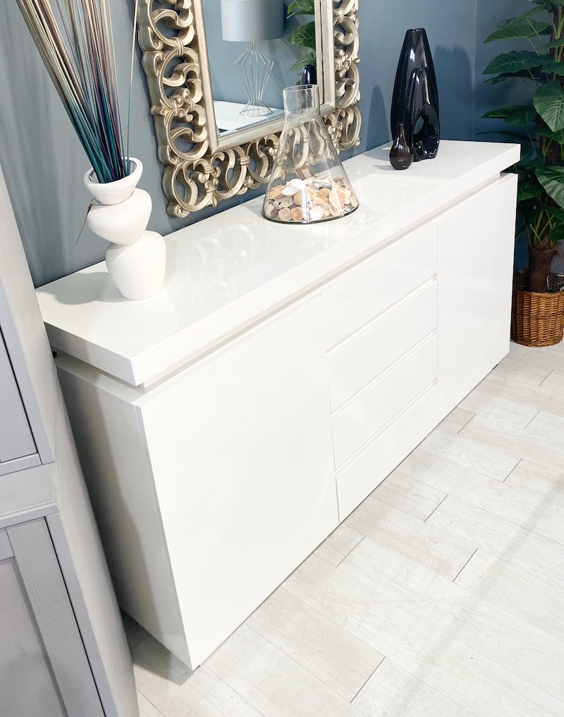 Este aparador branco, elegante e moderno, exemplifica o design minimalista com as suas linhas retas e elegância discreta. Com dois armários espaçosos em cada lateral e um conjunto de quatro gavetas no centro, a peça oferece soluções de arrumação versáteis. Concebido para se integrar perfeitamente em interiores contemporâneos, este aparador proporciona uma organização prática, mantendo um aspeto despojado, sendo ideal para salas de estar, salas de jantar ou escritórios que procuram opções de arrumação requintadas.