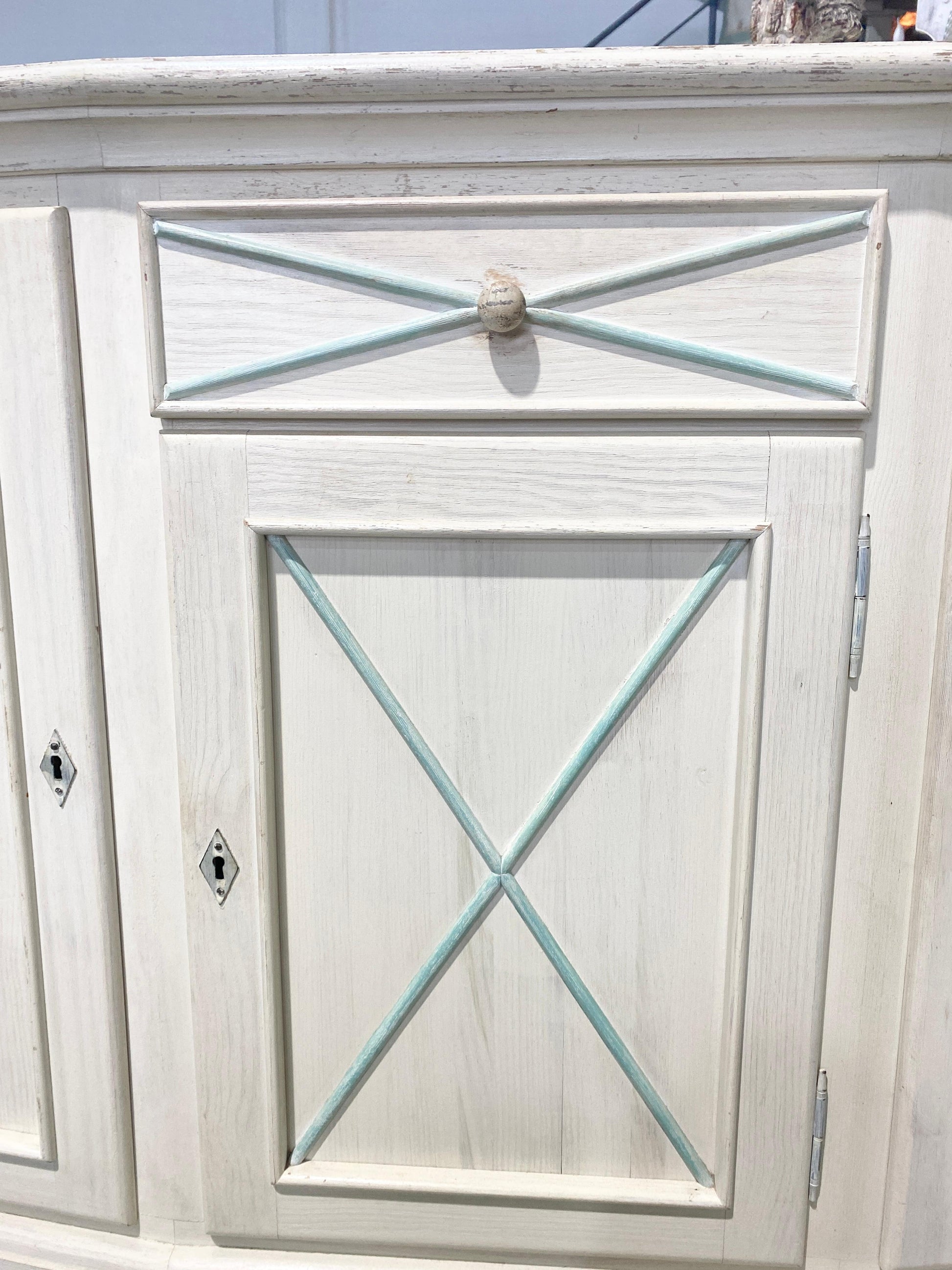 Encantador aparador de estilo campestre francês com acabamento em marfim envelhecido, detalhes em azul suave e amplo espaço de arrumação com prateleiras e gavetas — perfeito para acrescentar elegância e funcionalidade a qualquer espaço.