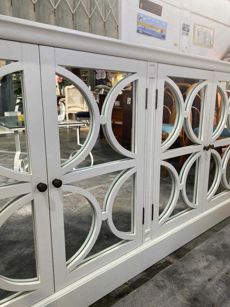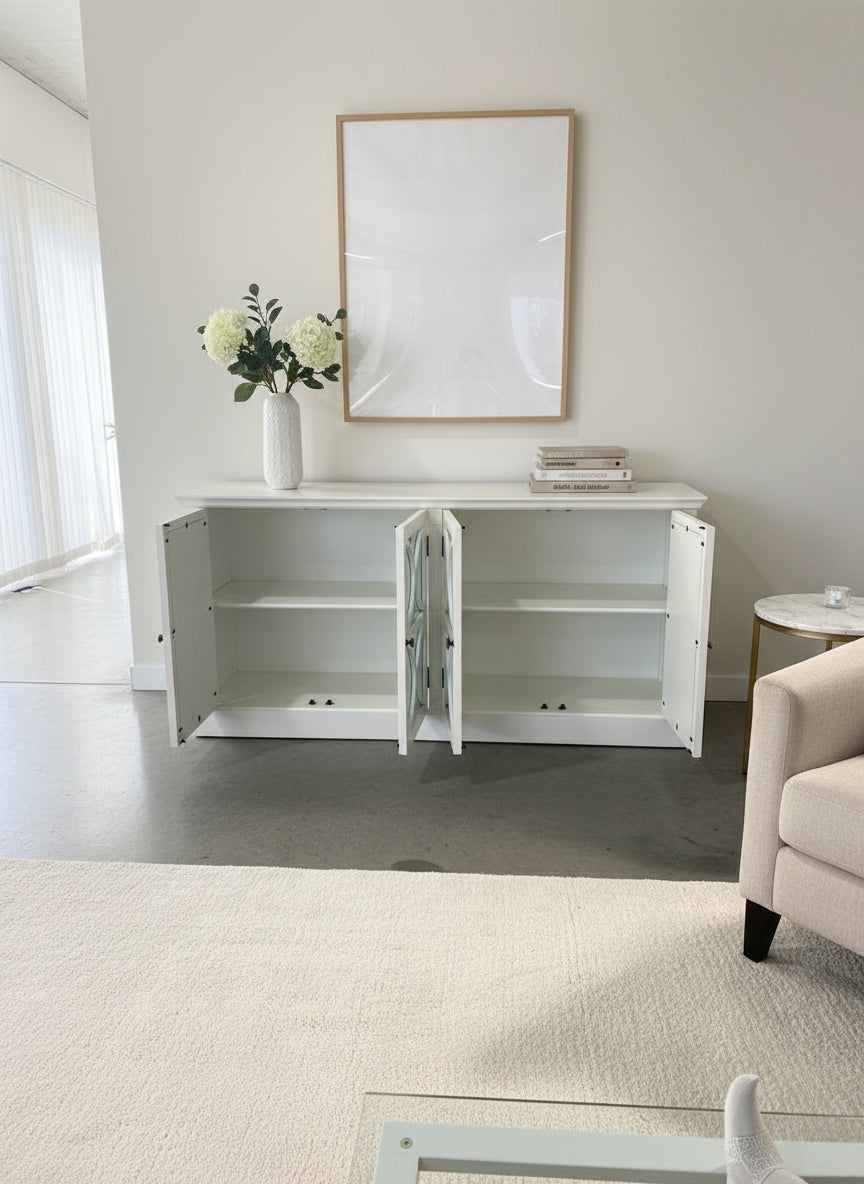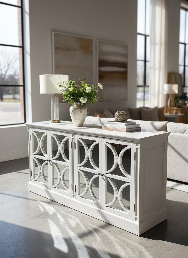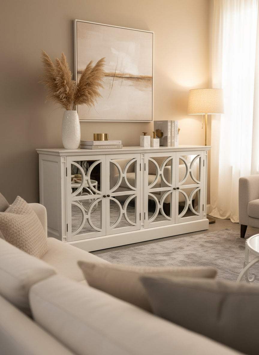 Este elegante aparador branco apresenta portas espelhadas com detalhes curvos que captam a luz de forma magnífica. No interior, dois armários espaçosos contêm prateleiras, oferecendo um amplo espaço para organizar e expor os seus pertences. Perfeito para dar um toque contemporâneo a qualquer divisão, mantendo tudo organizado e fora do alcance das mãos.
