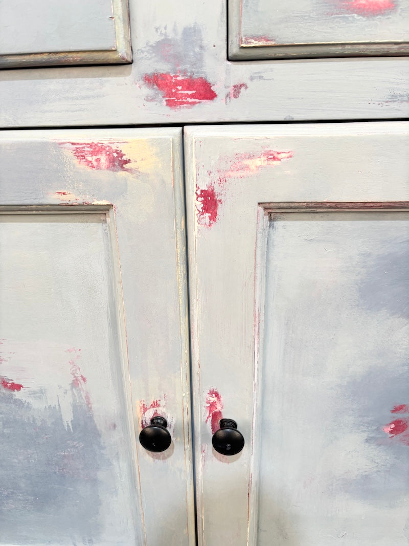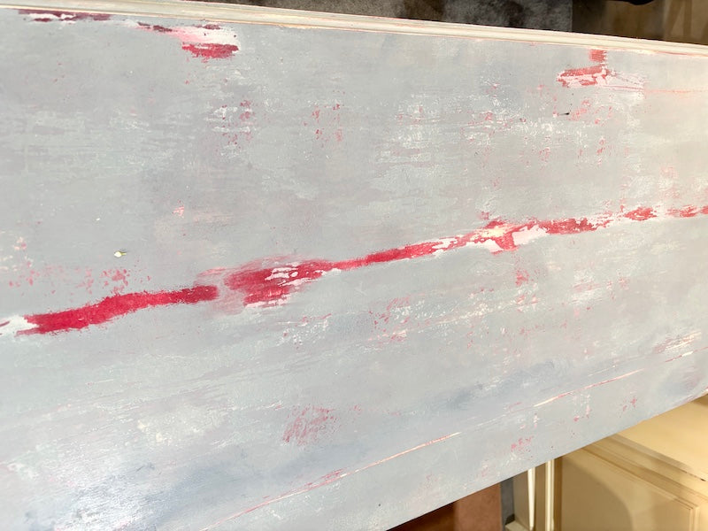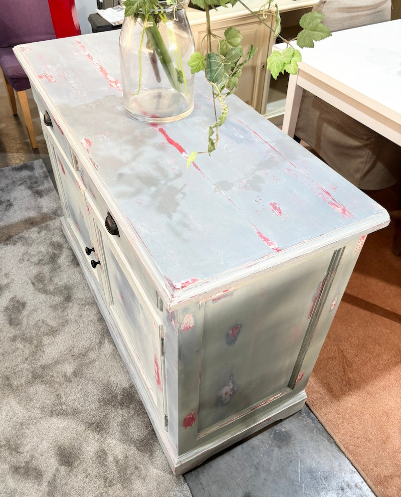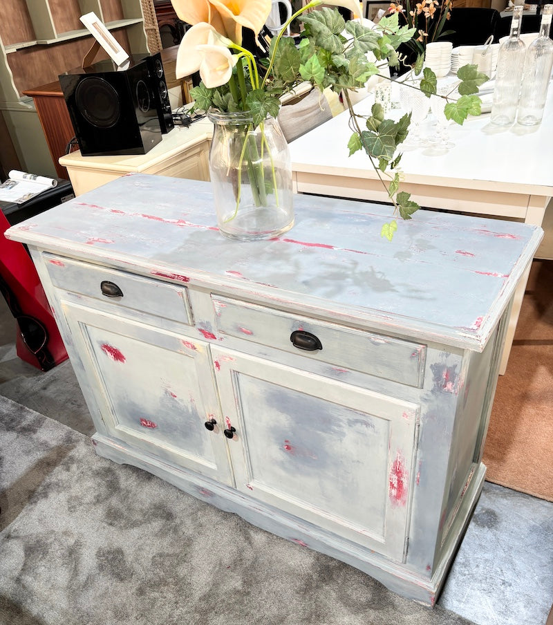 Um aparador rústico feito com materiais reciclados, pintado num tom de azul desgastado com detalhes em vermelho. Possui um amplo espaço de arrumação nos armários profundos e espaçosos, bem como duas gavetas.