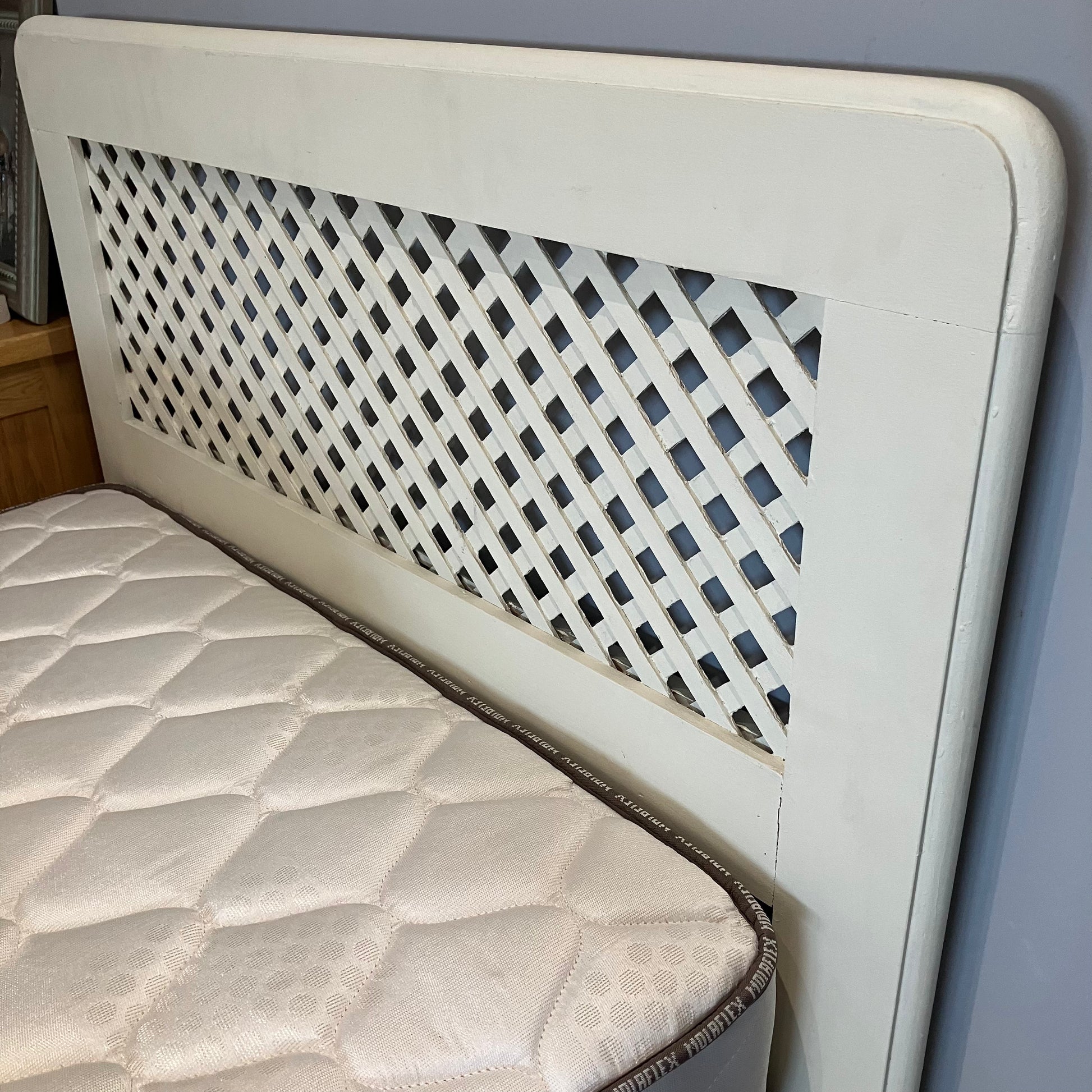 Pair of white painted single beds with mattress. The clean, neutral design easily blends with any décor style, from modern to classic. Sturdy and reliable, it comes with a comfortable mattress included, making it a ready-to-use solution for your sleeping space. Perfect for a child’s bedroom, guest room, or other.