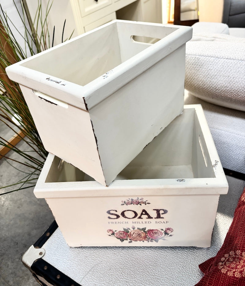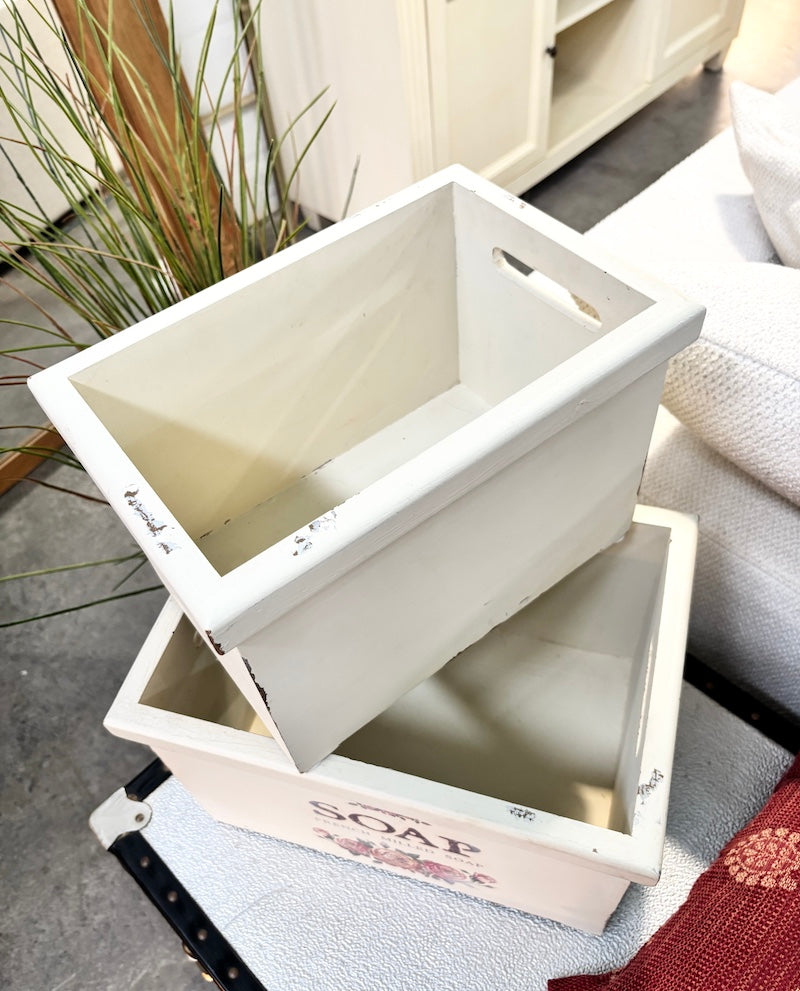 Um par de caixas de arrumação em madeira com um estilo rústico chique.