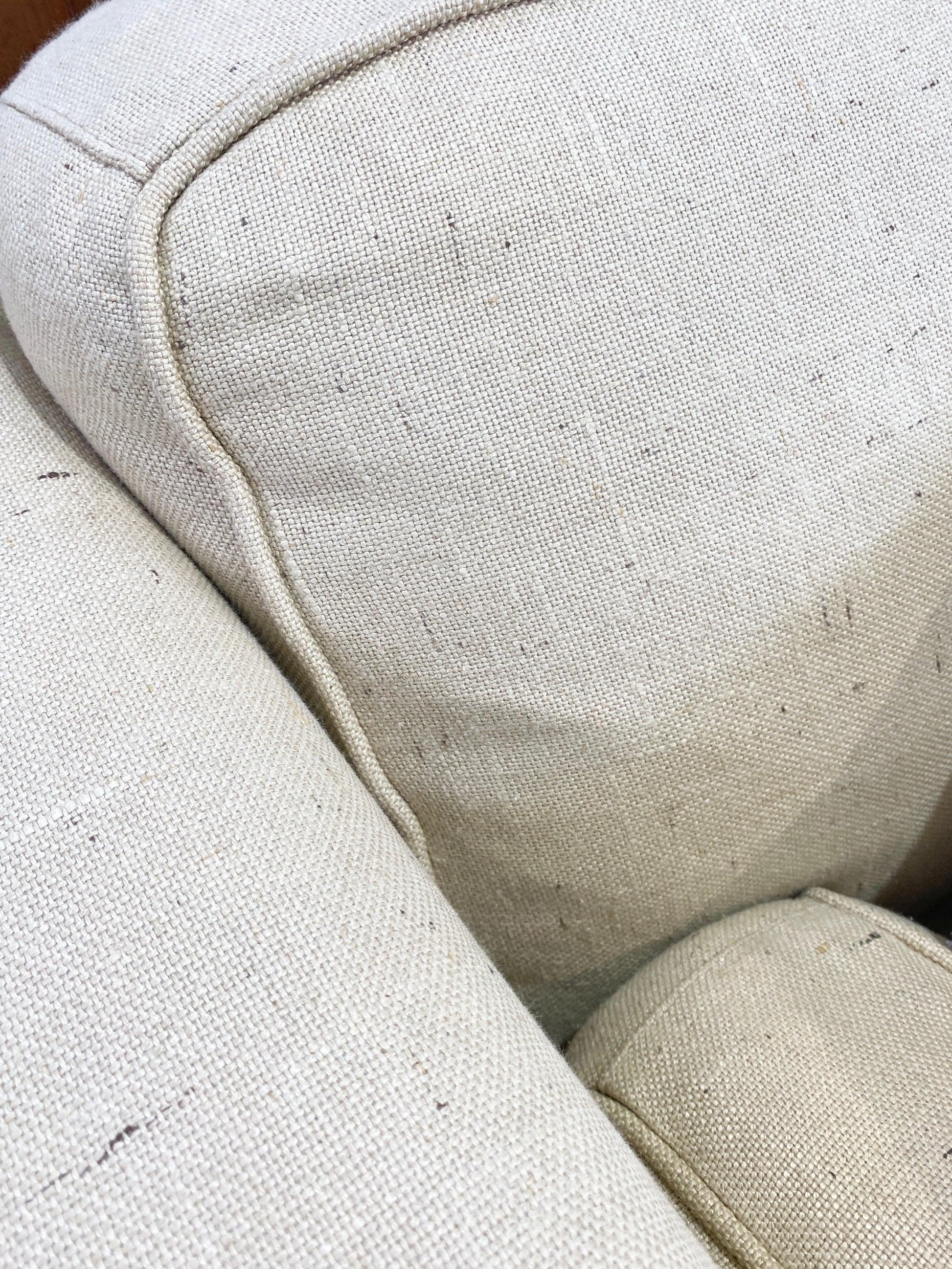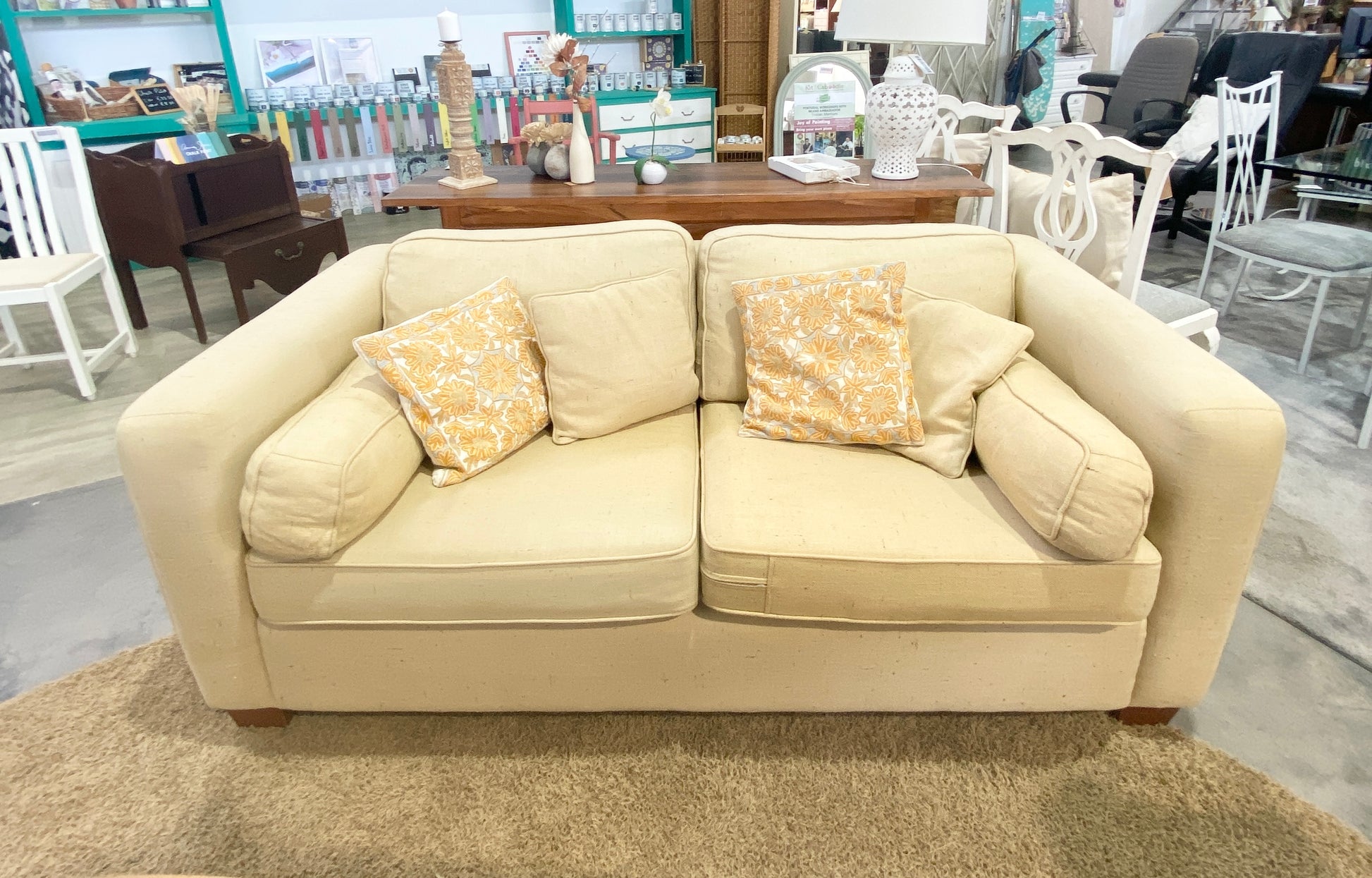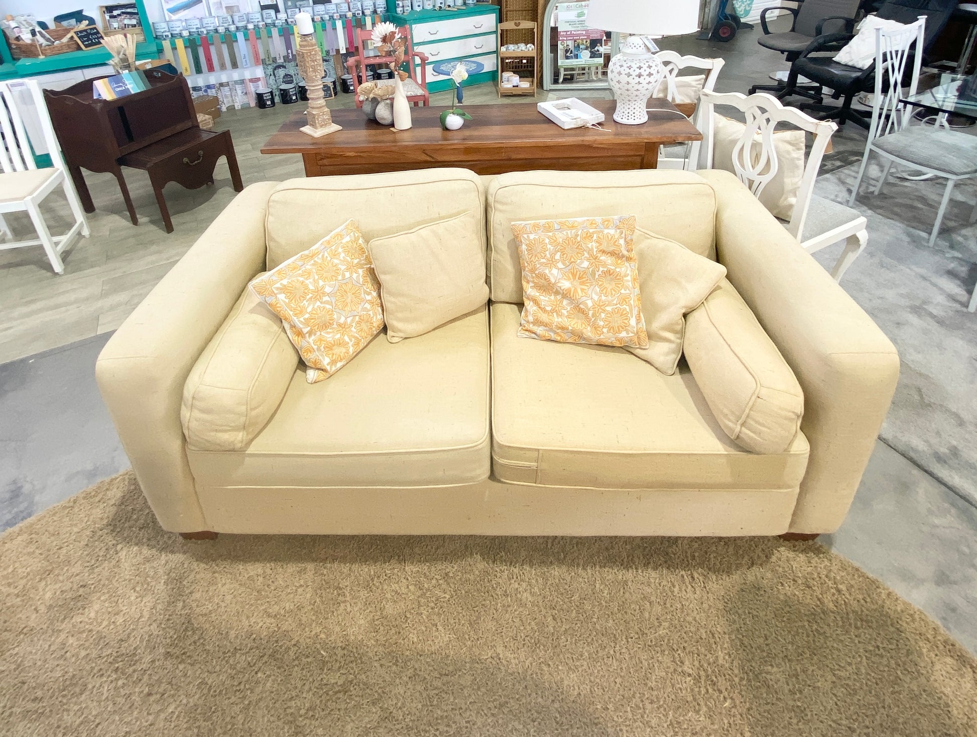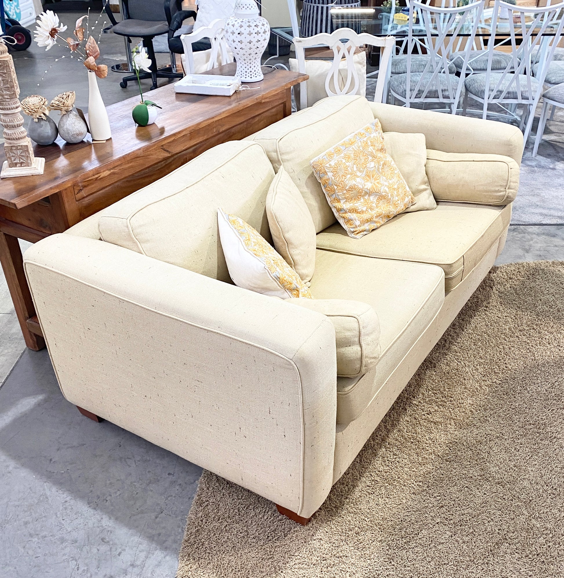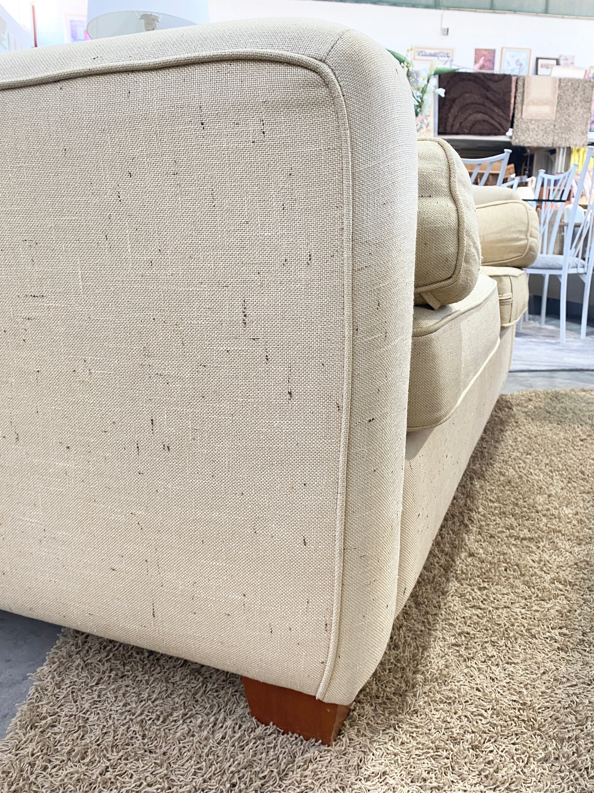 Crie um cantinho acolhedor na sua sala de estar com este sofá grande e confortável de dois lugares. É estofado em tecido bege suave e tem pernas de madeira resistentes.