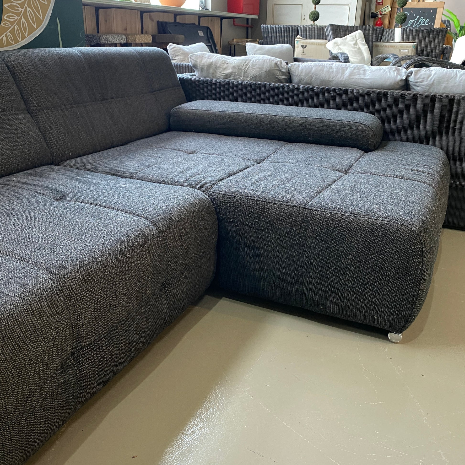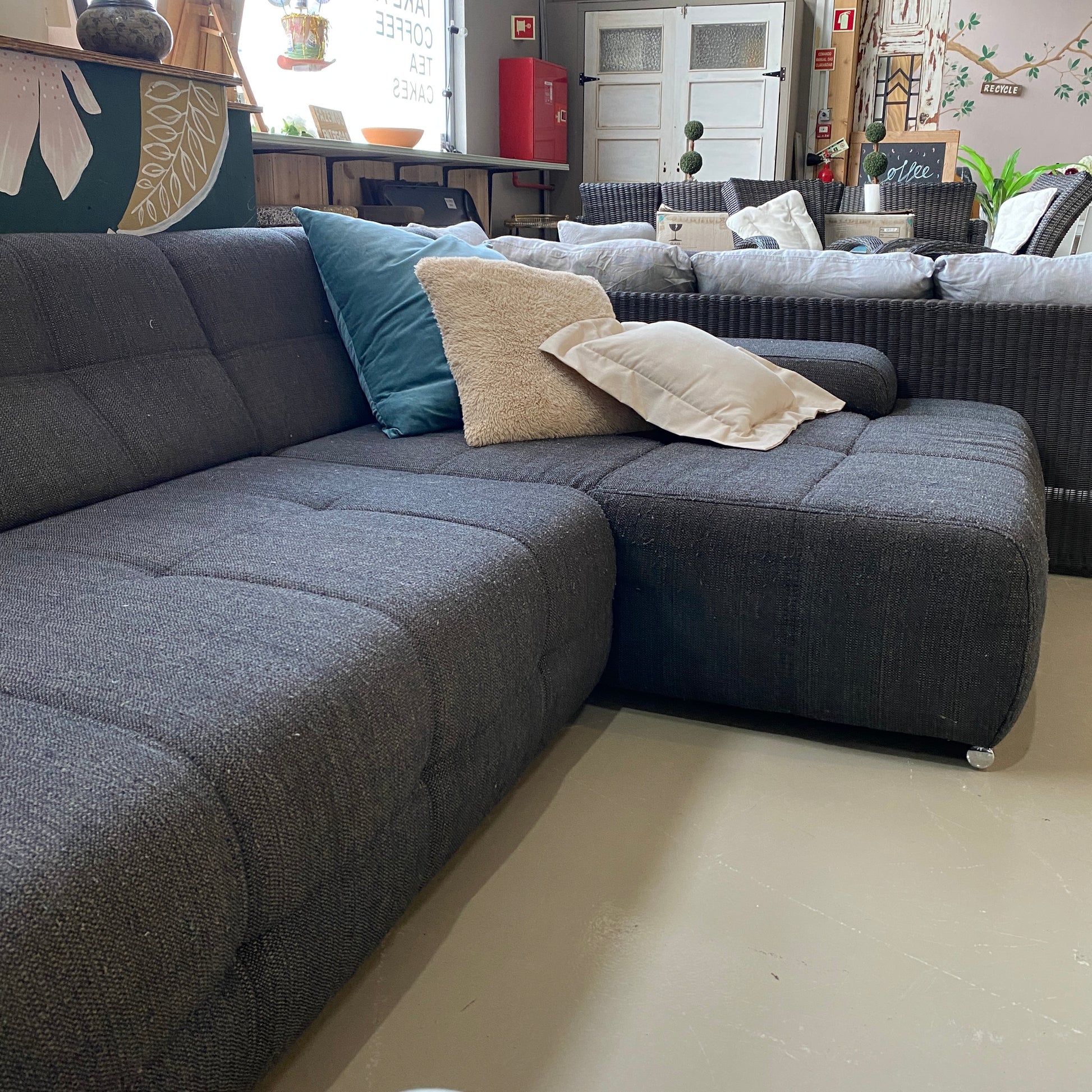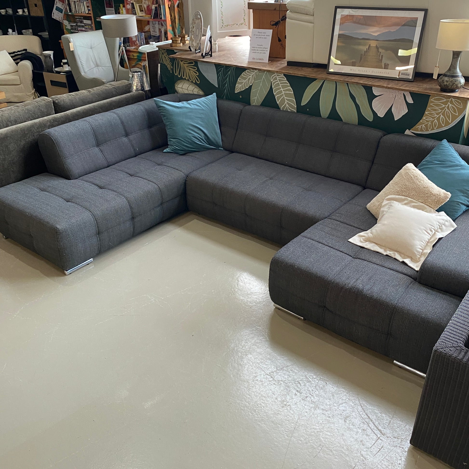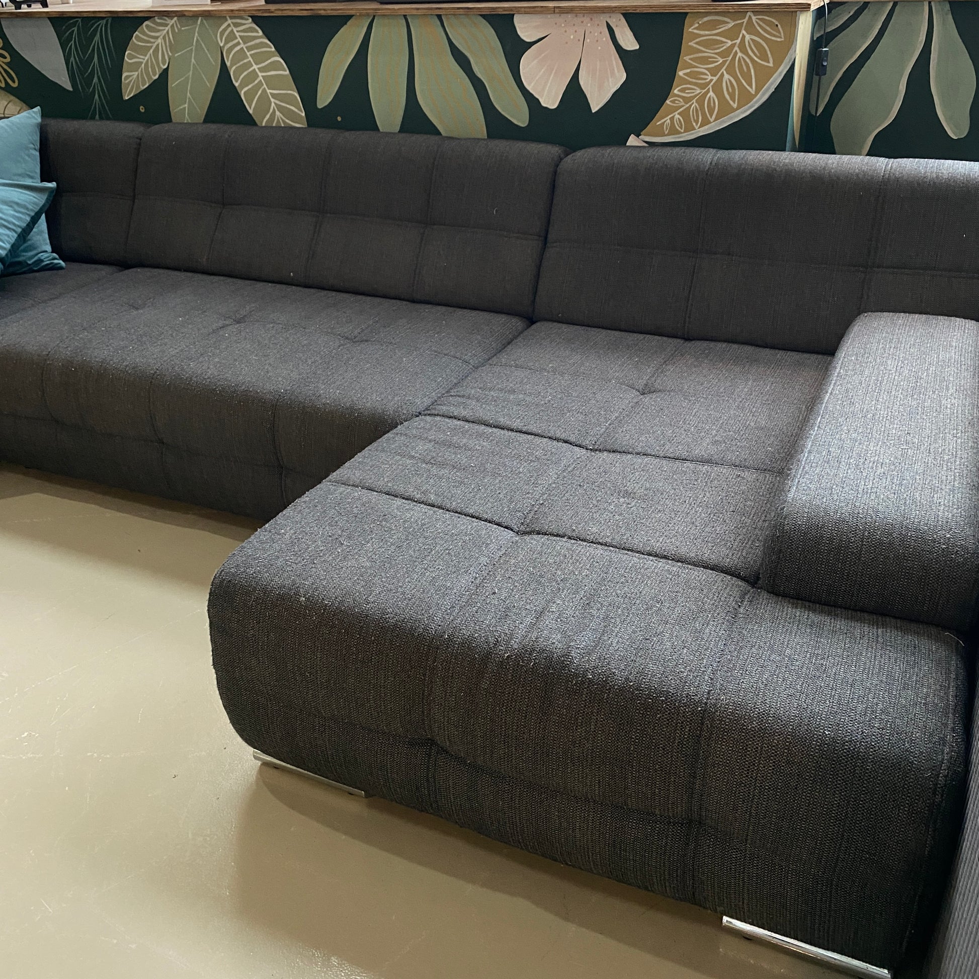 Sofá de canto espaçoso em tom cinza escuro, com design de perfil baixo e almofadas a condizer. Oferece assentos generosos e conforto contemporâneo - perfeito para salas de estar familiares.