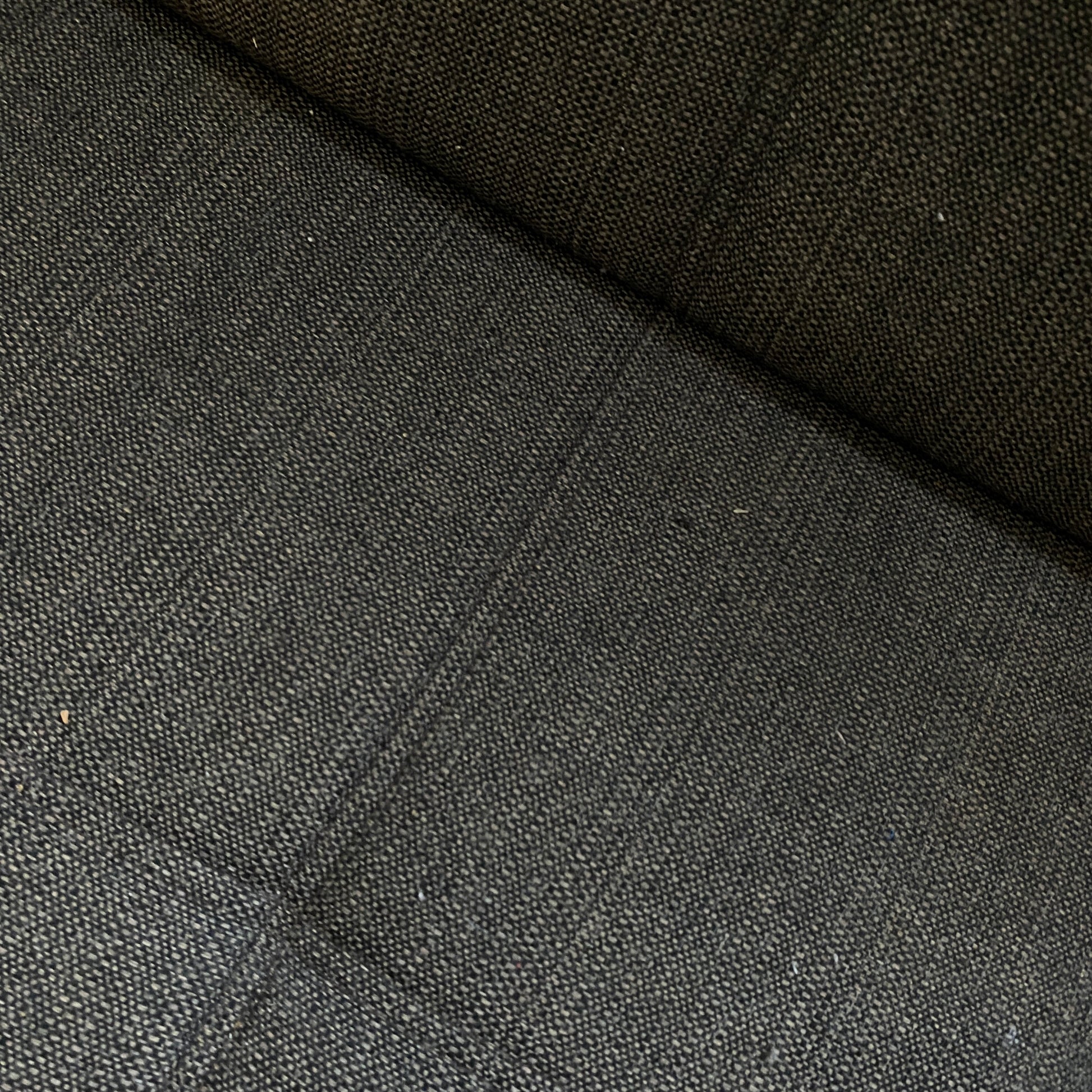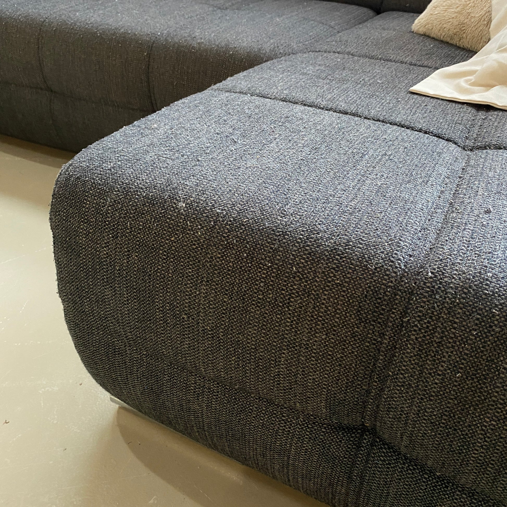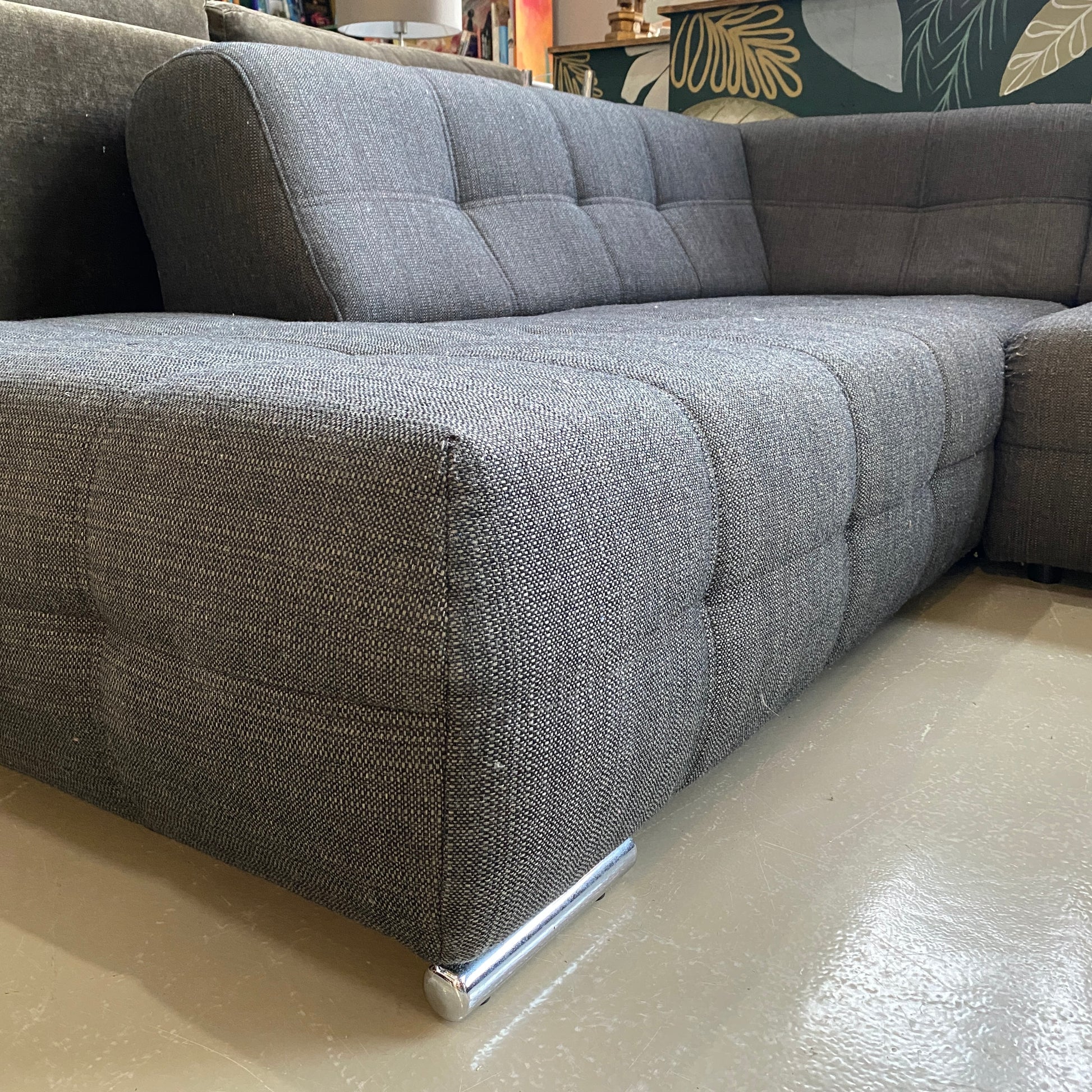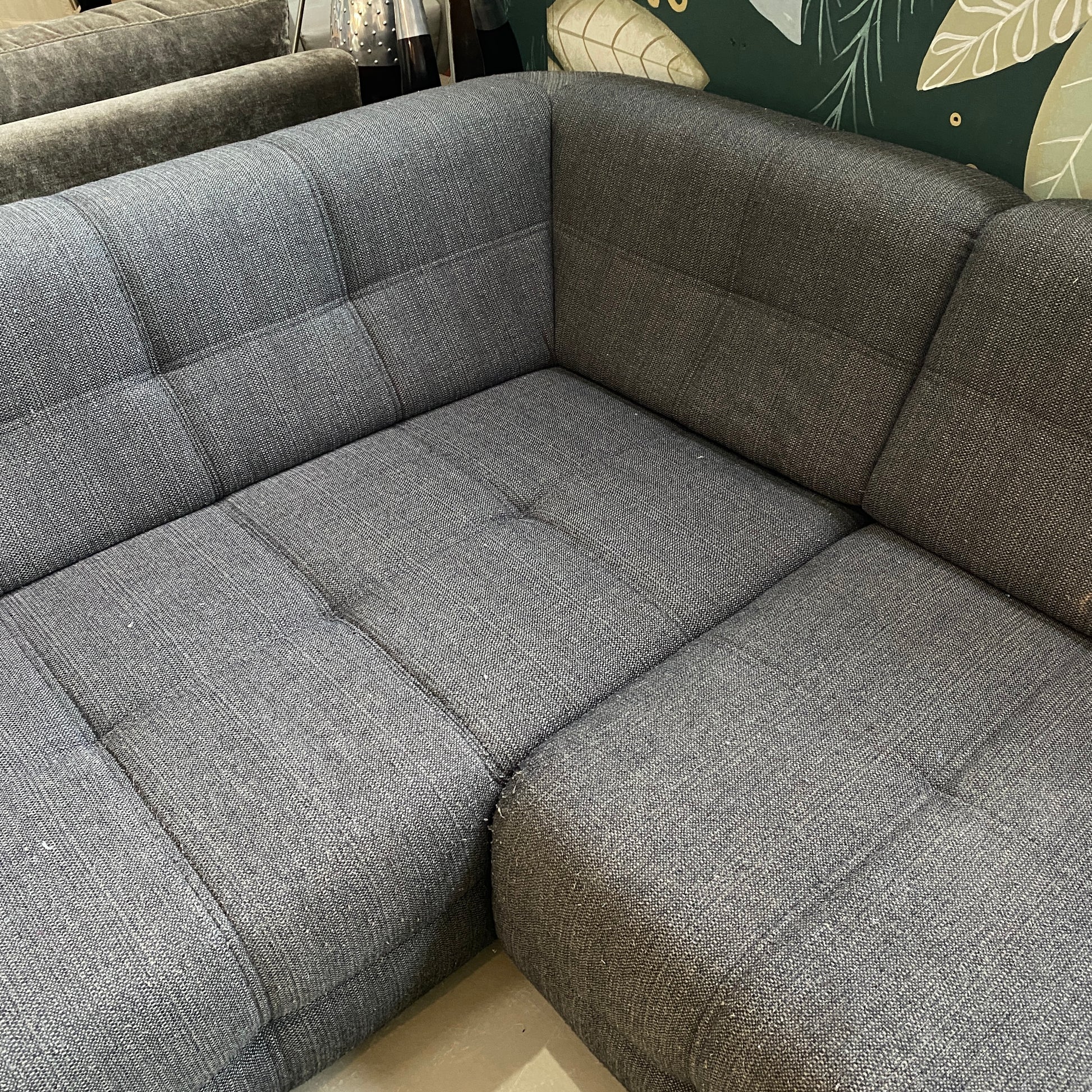 Sofá de canto espaçoso em tom cinza escuro, com design de perfil baixo e almofadas a condizer. Oferece assentos generosos e conforto contemporâneo - perfeito para salas de estar familiares.