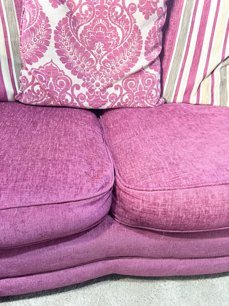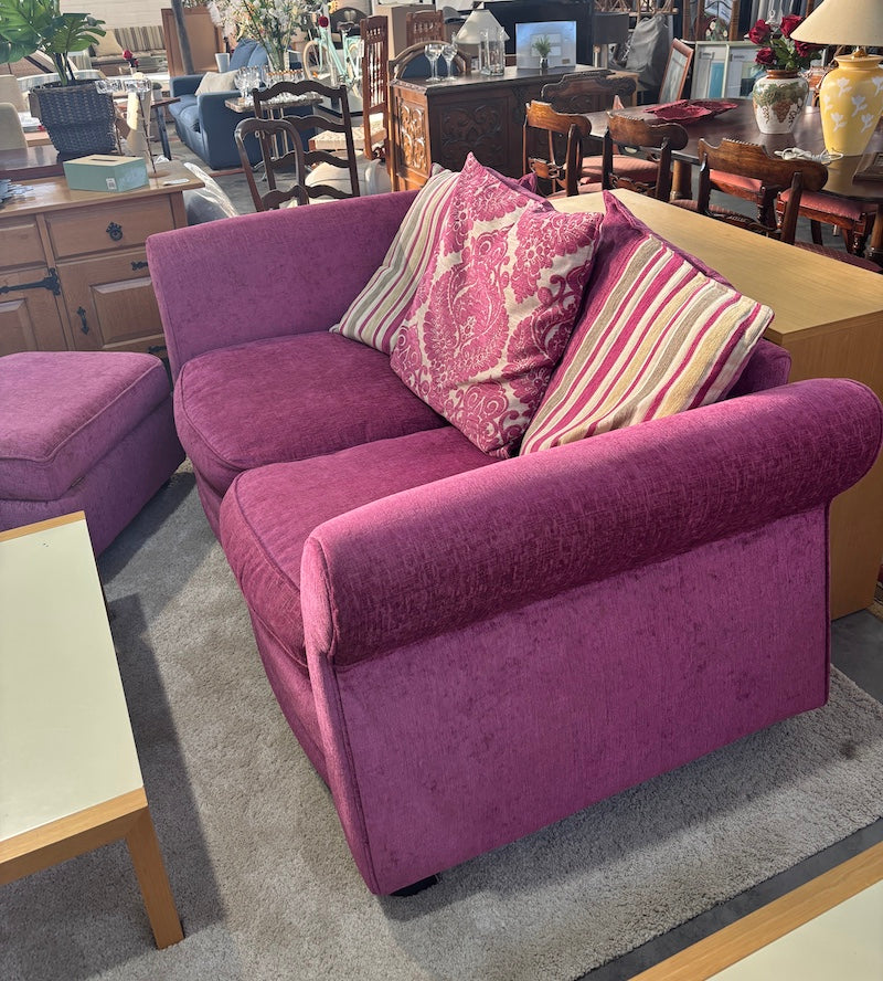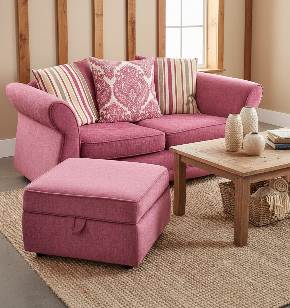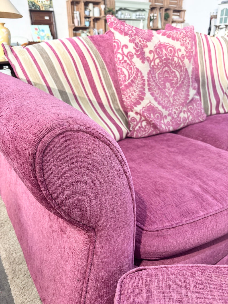 Dê espaço a este sofá de dois lugares em magenta vibrante e veja a sua sala ganhar vida! Um tecido macio e texturado envolve os braços com um design divertido, ao estilo de meias. Três almofadas coordenadas com riscas e estampado paisley completam o encosto, criando um cantinho aconchegante que alia conforto e personalidade.