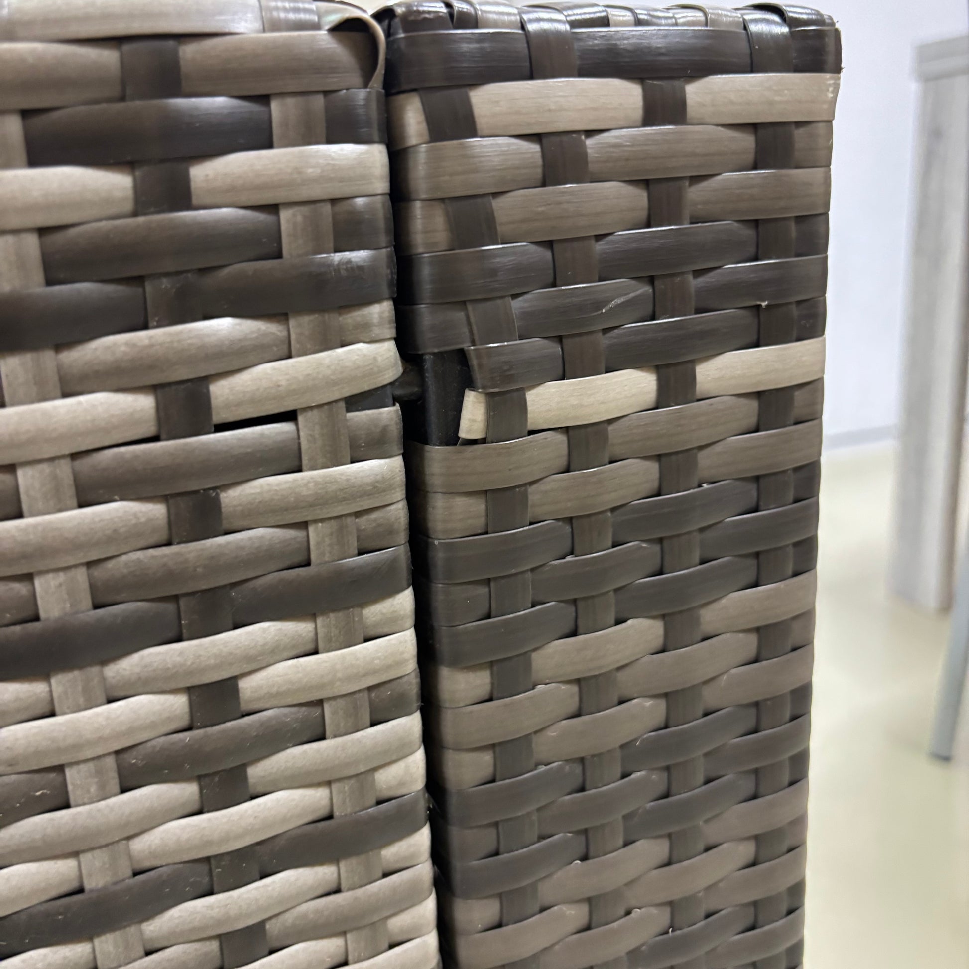 Stylish and weather-resistant sofa, with woven rattan frame and neutral outdoor cushions.