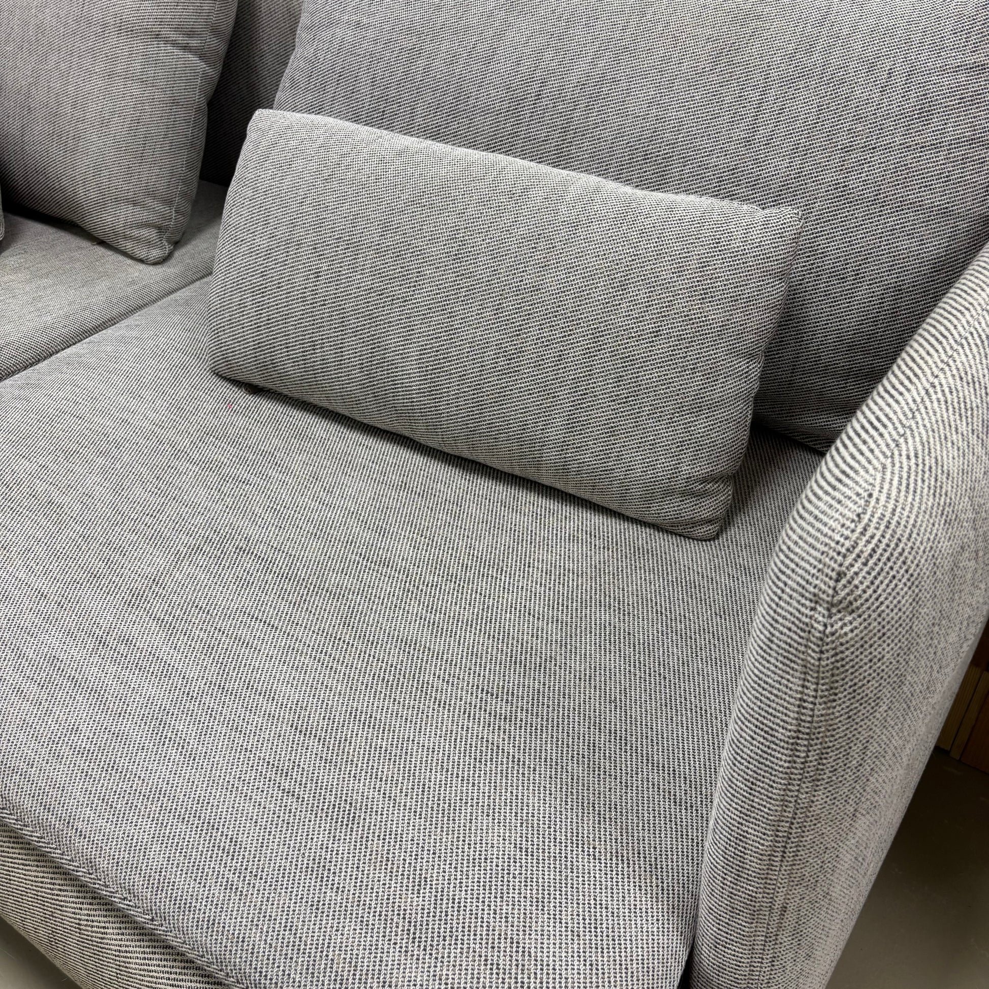 Modular two-piece IKEA sofa in light-grey with a clean, contemporary design, wide seats and supportive cushions, whose covers can be removed for cleaning. Ideal for any living areas.