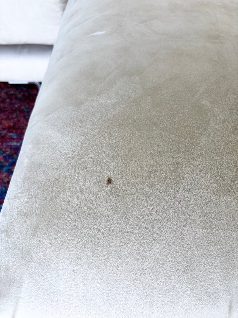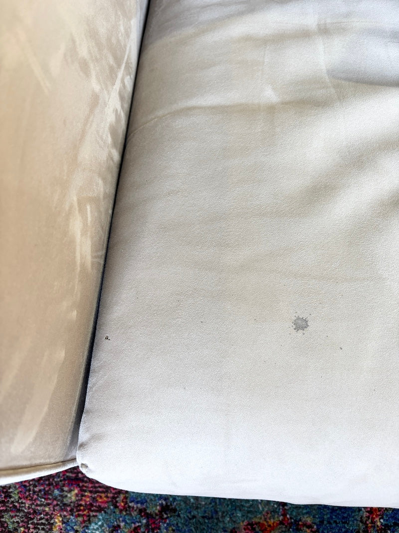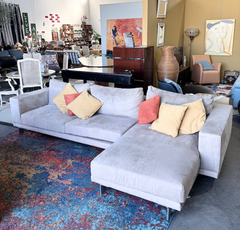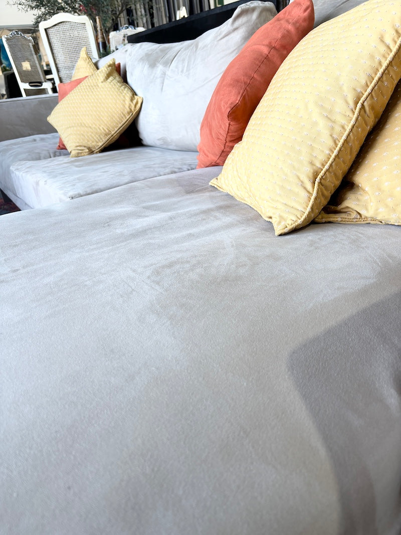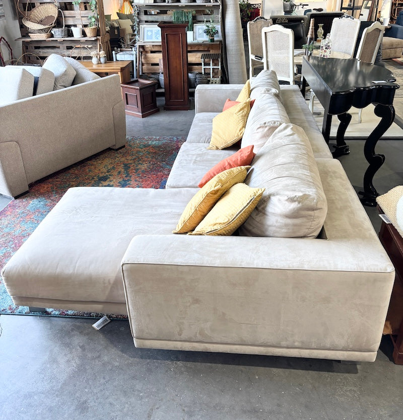 Um sofá modular de grandes dimensões em forma de L, forrado num tecido macio e aveludado bege e com pés em metal, com muito espaço para toda a família. Note que este sofá apresenta algumas marcas de uso; veja as fotos.