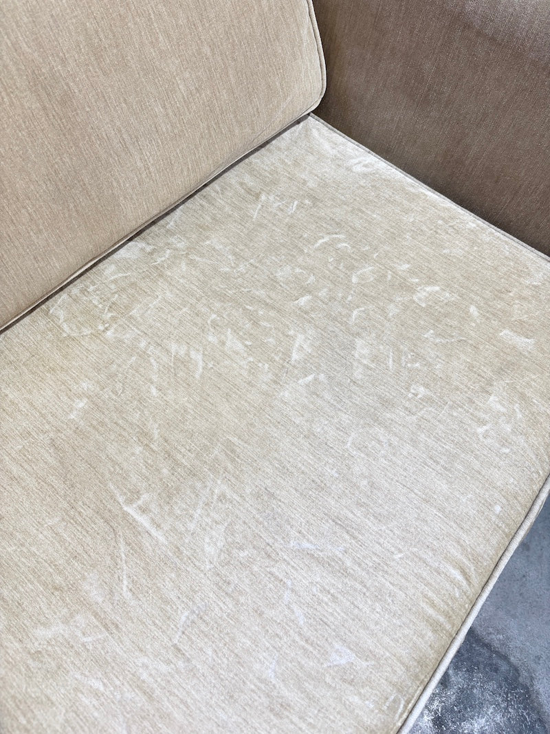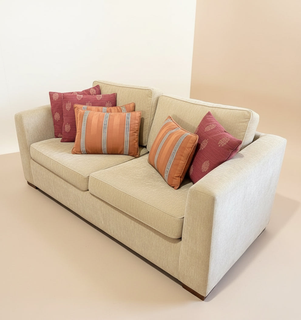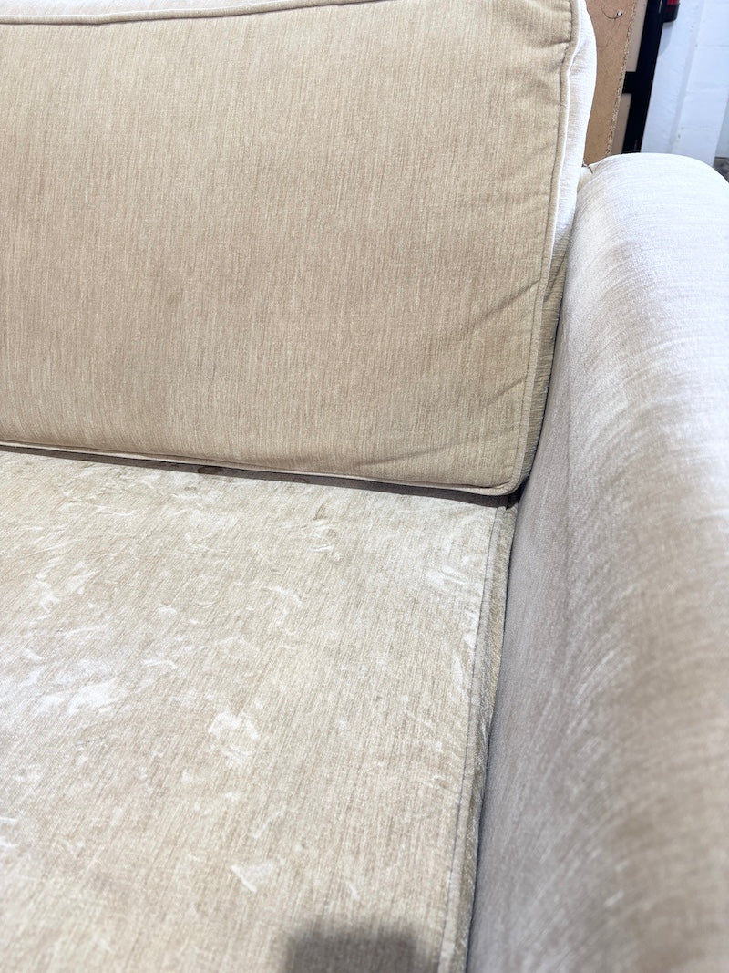 Um sofá confortável de dois lugares com estofos em veludo bege e pés de madeira robustos. Possui a funcionalidade prática de acomodar uma cama dobrável embutida. Note que apresenta alguns sinais de uso; veja as fotos.