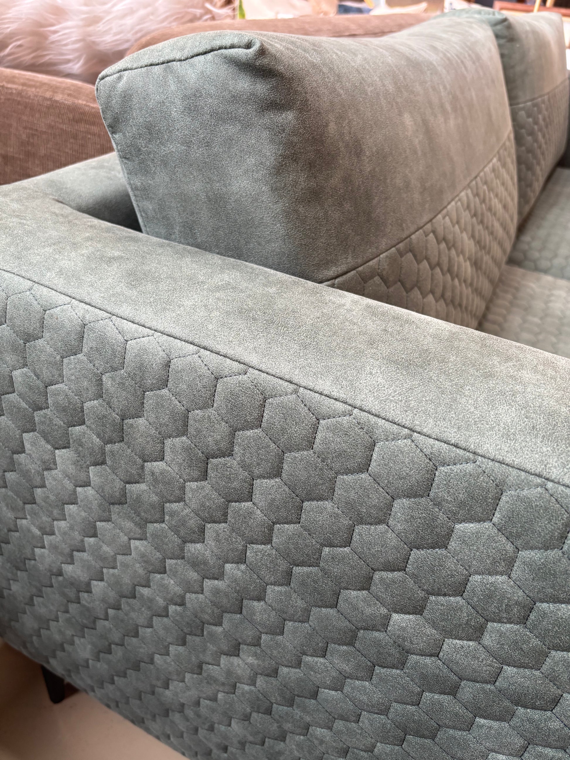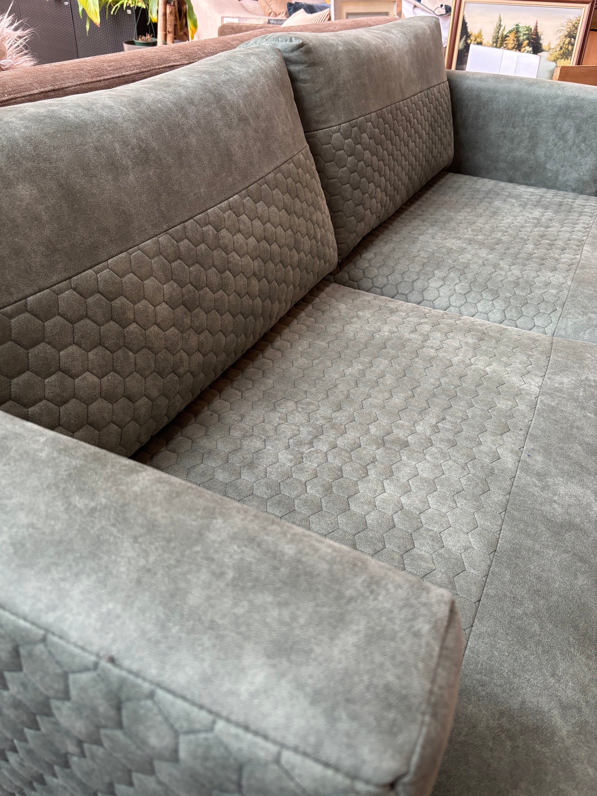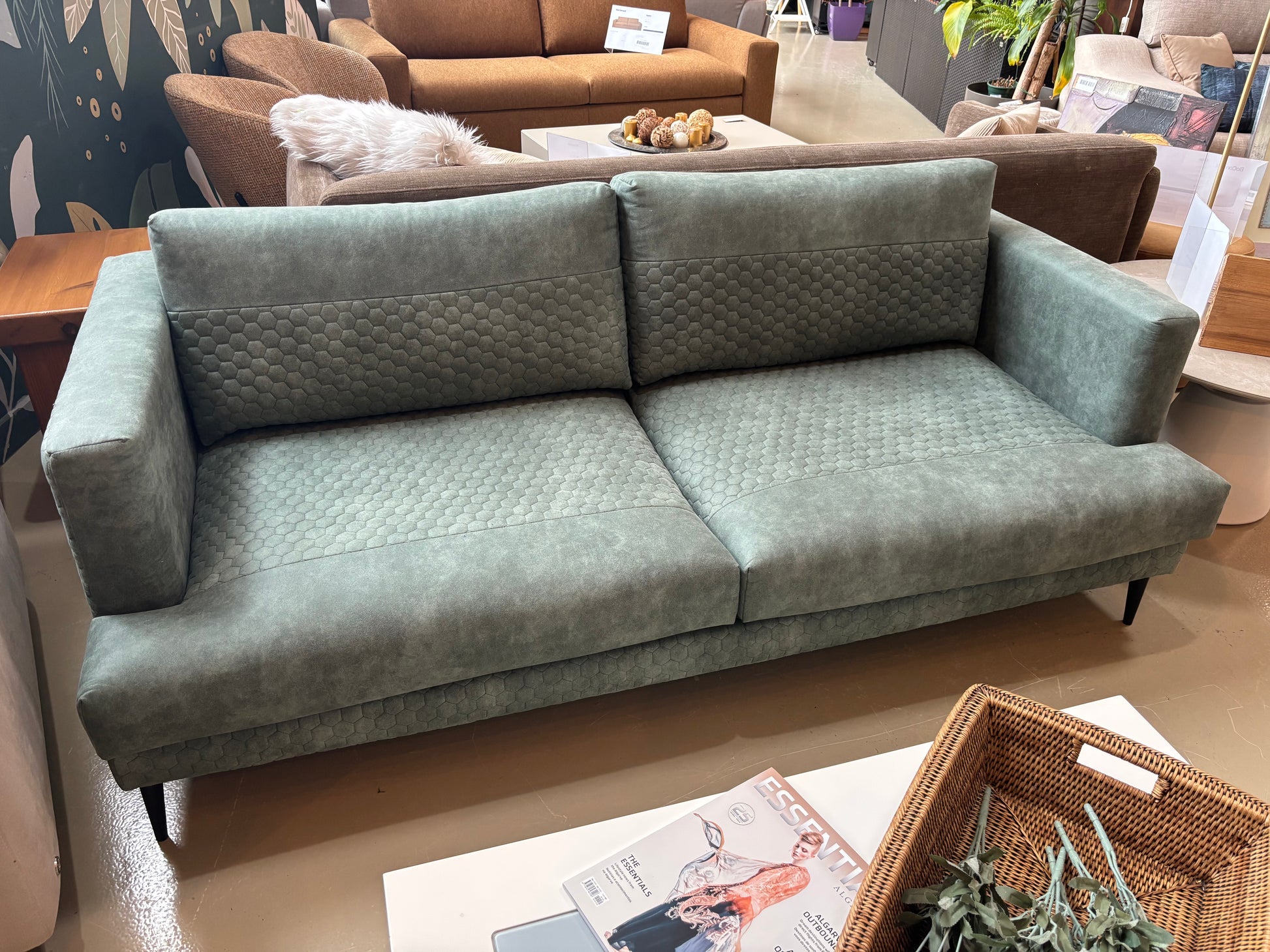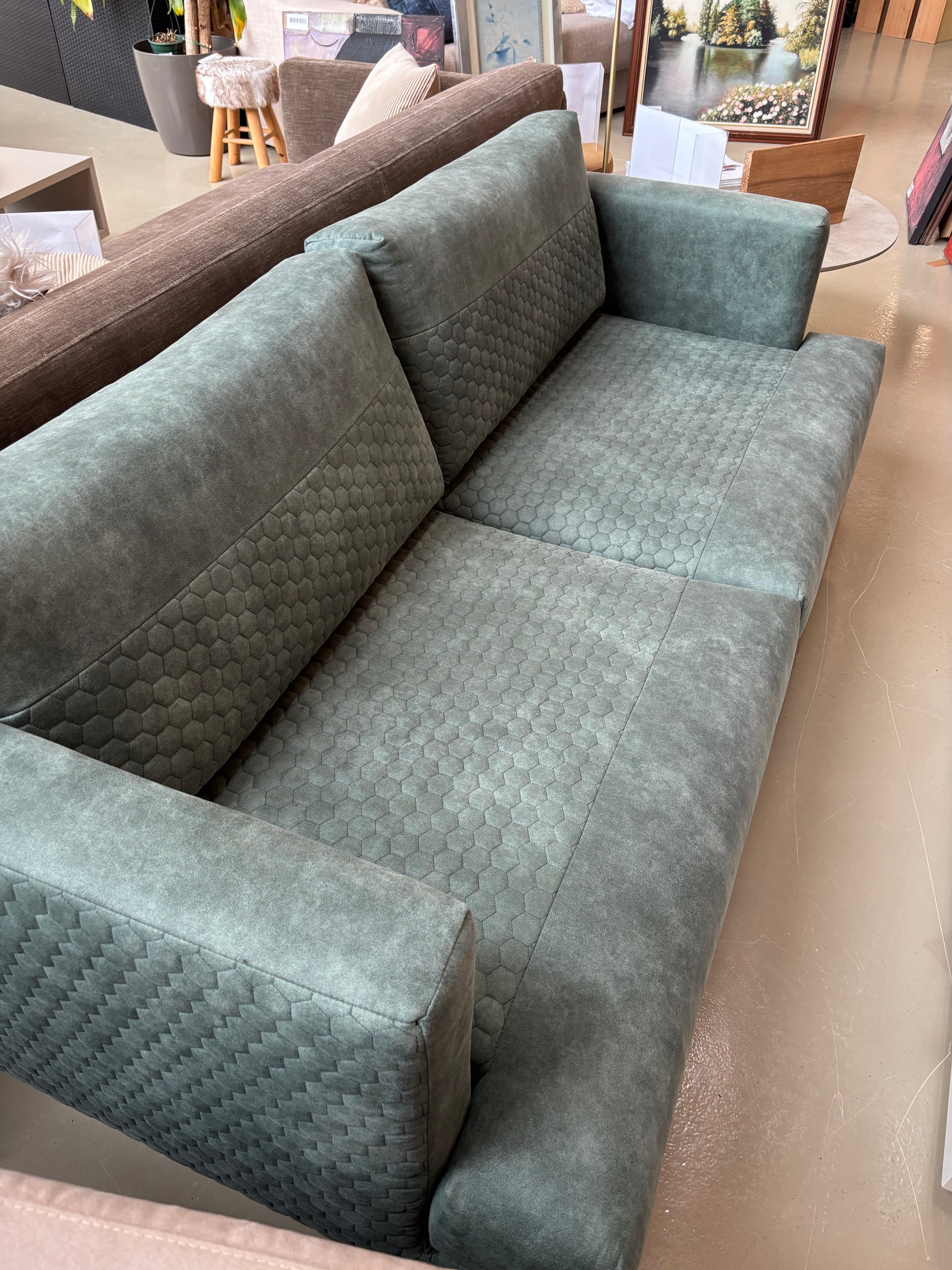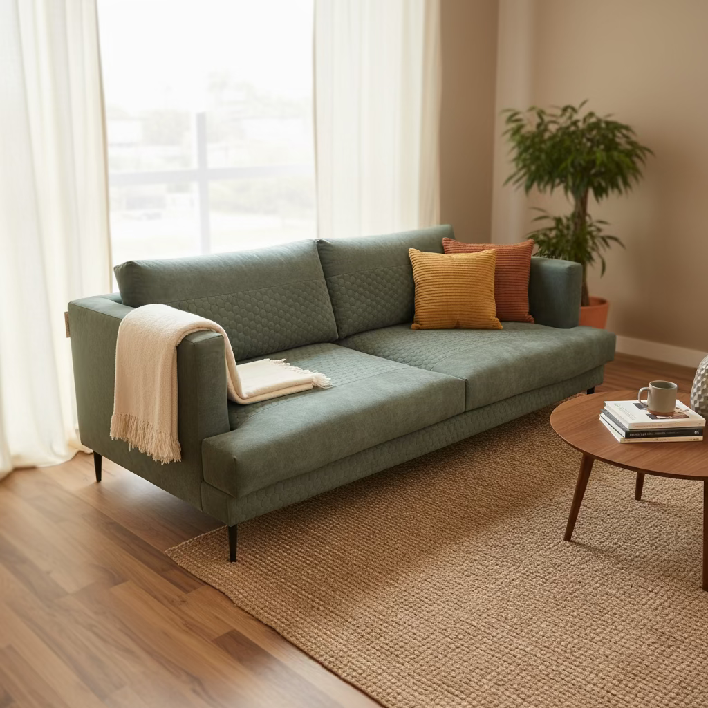Sofá confortável de dois lugares, estofado em tecido verde musgo, com linhas simples e um toque contemporâneo.