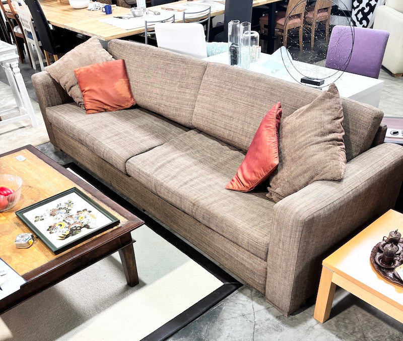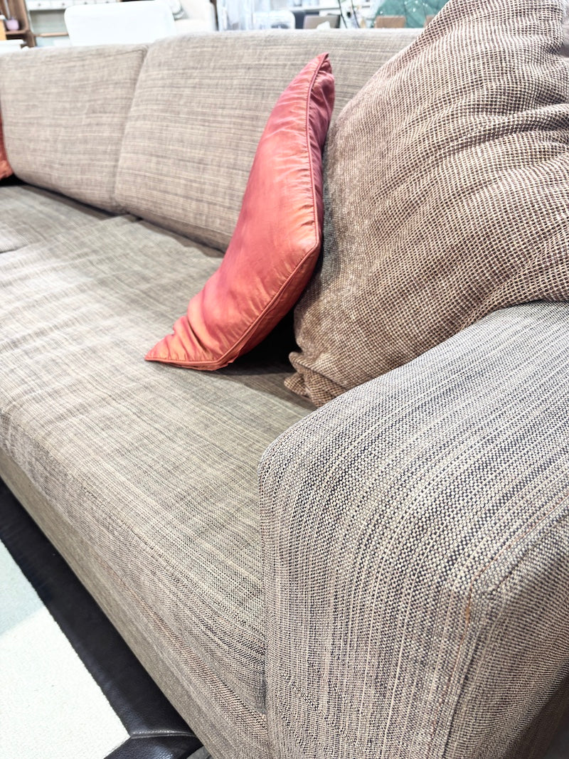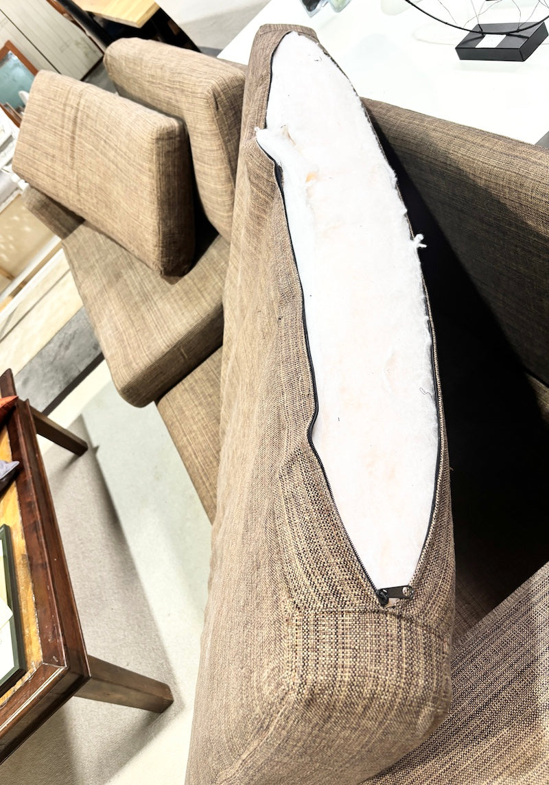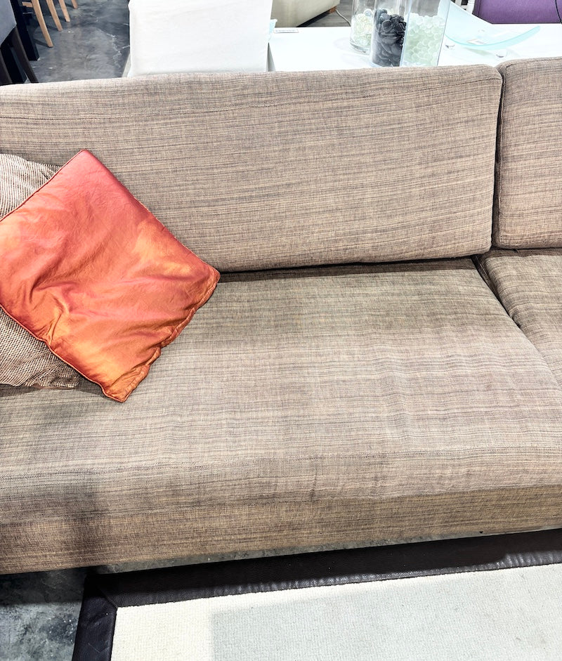 Um sofá-cama castanho extra longo, perfeito para acomodar toda a família confortavelmente. Este sofá acaba de ser limpo profissionalmente, mas note que uma das almofadas tem o fecho partido e precisará de reparação.