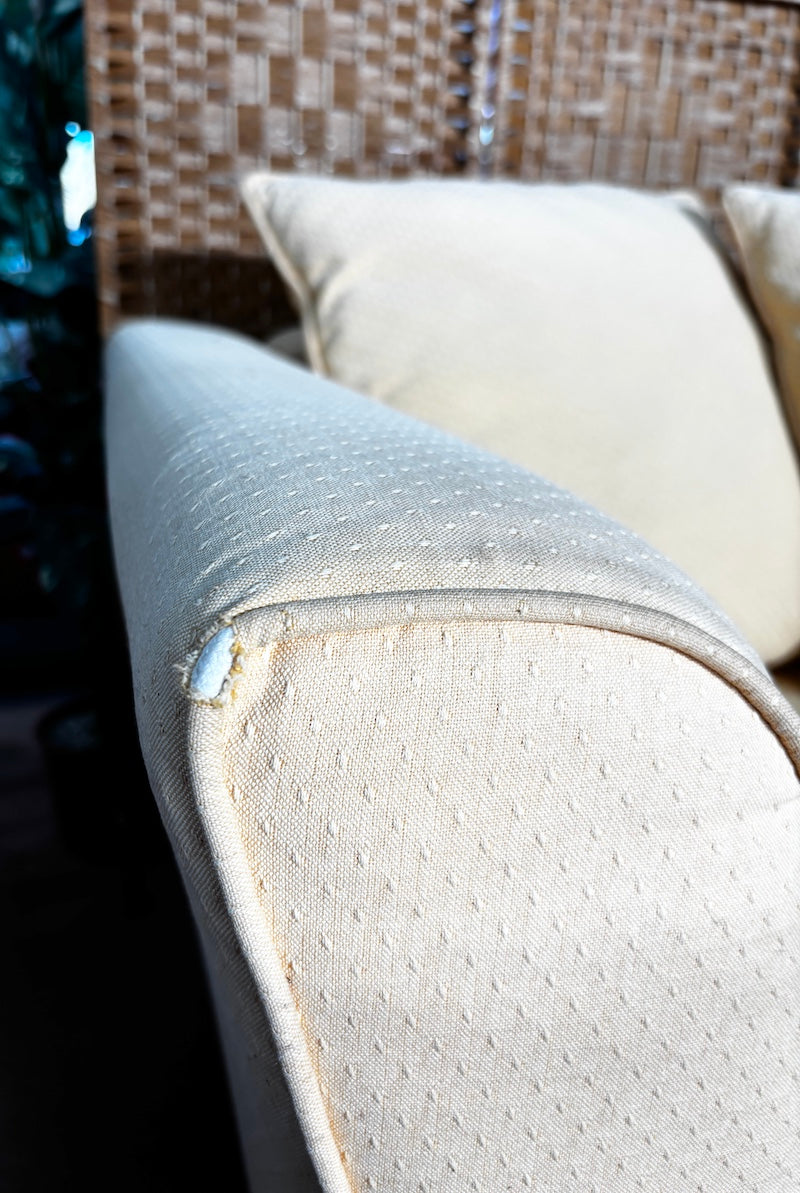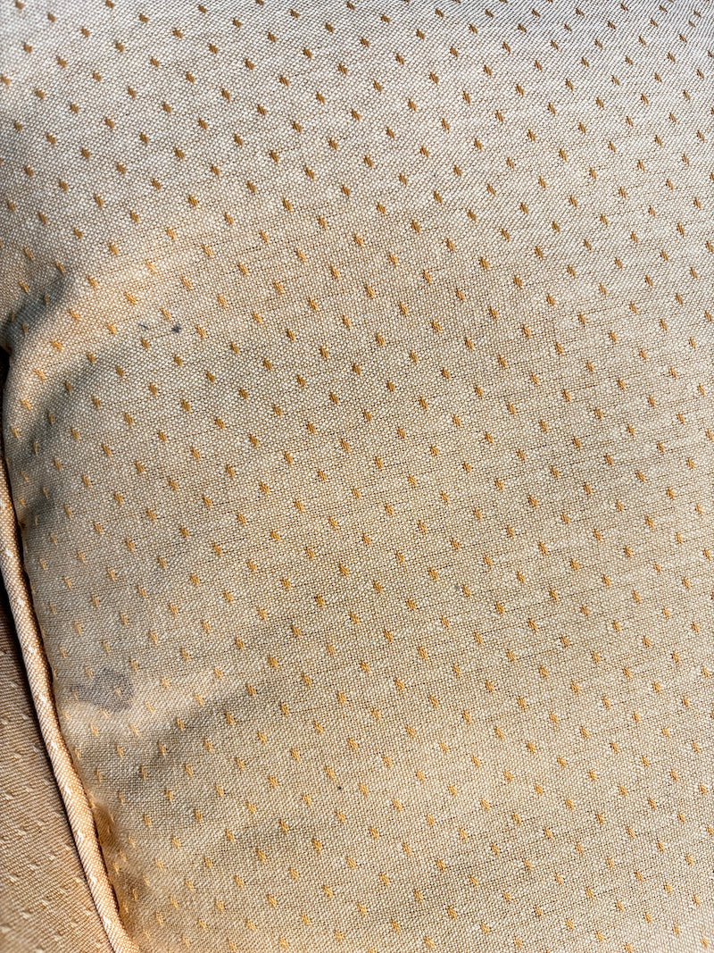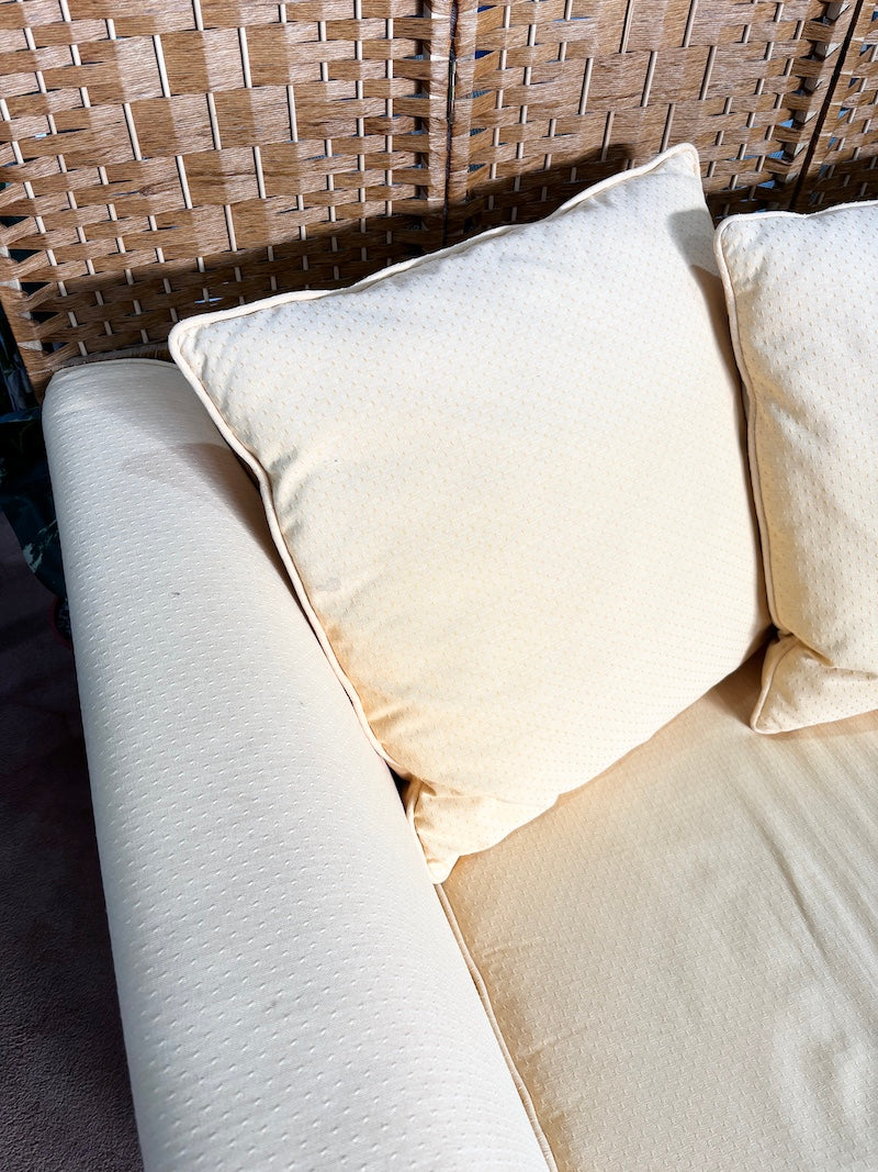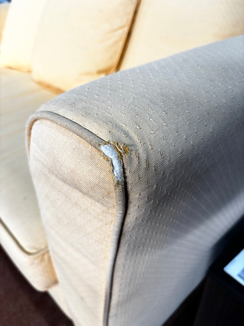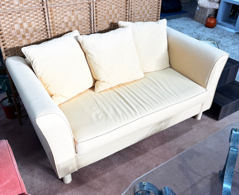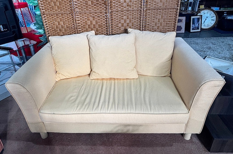 Um sofá pequeno que acomoda duas pessoas confortavelmente e ainda cabe em espaços reduzidos. Está estofado num alegre tecido amarelo, embora seja importante notar que há algum desgaste no estofamento dos braços.