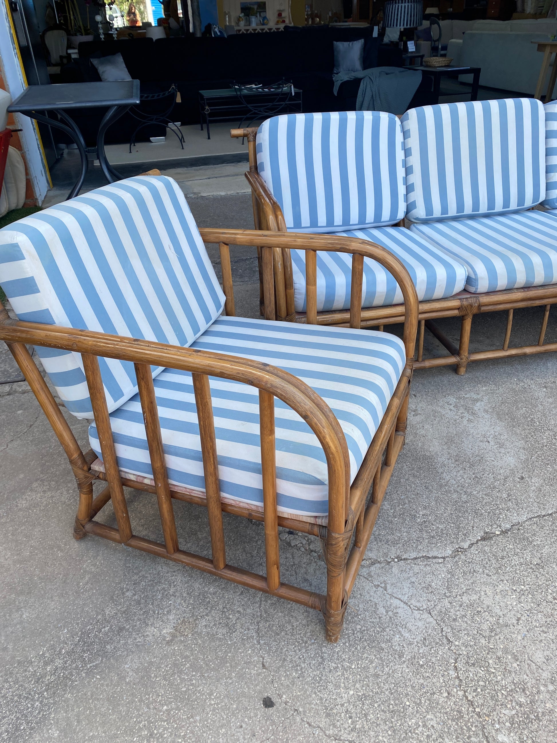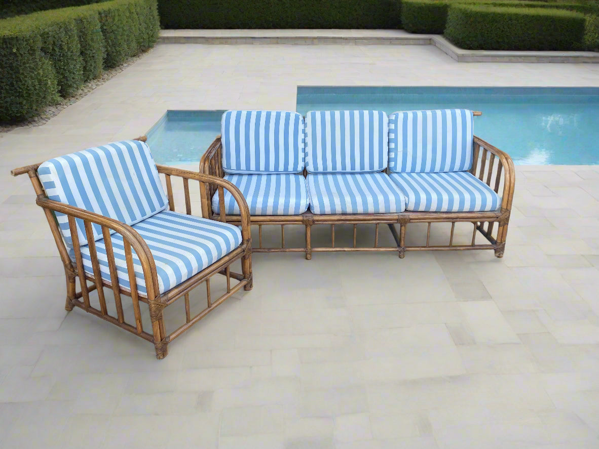 Este atraente conjunto de jardim em rattan inclui um sofá de três lugares e uma poltrona a condizer, ambos com uma estrutura de vime resistente e almofadas confortáveis num design clássico listrado em azul e branco. Ideal para áreas de lazer ao ar livre, jardins de inverno ou casas de veraneio, o conjunto combina um estilo costeiro descontraído com uma construção durável, oferecendo conforto e charme para a sua área de estar.