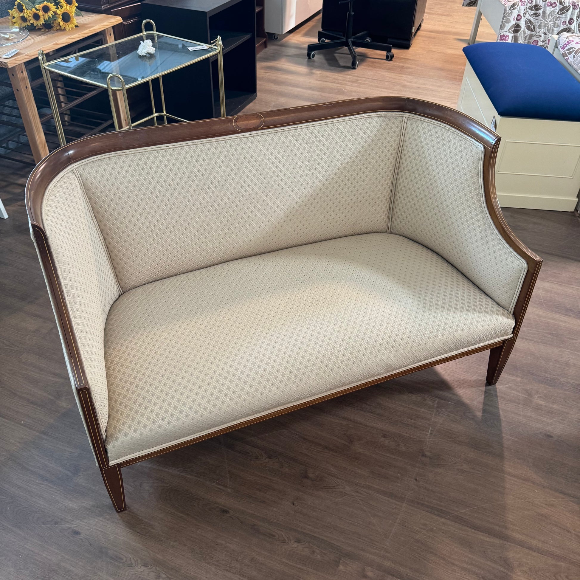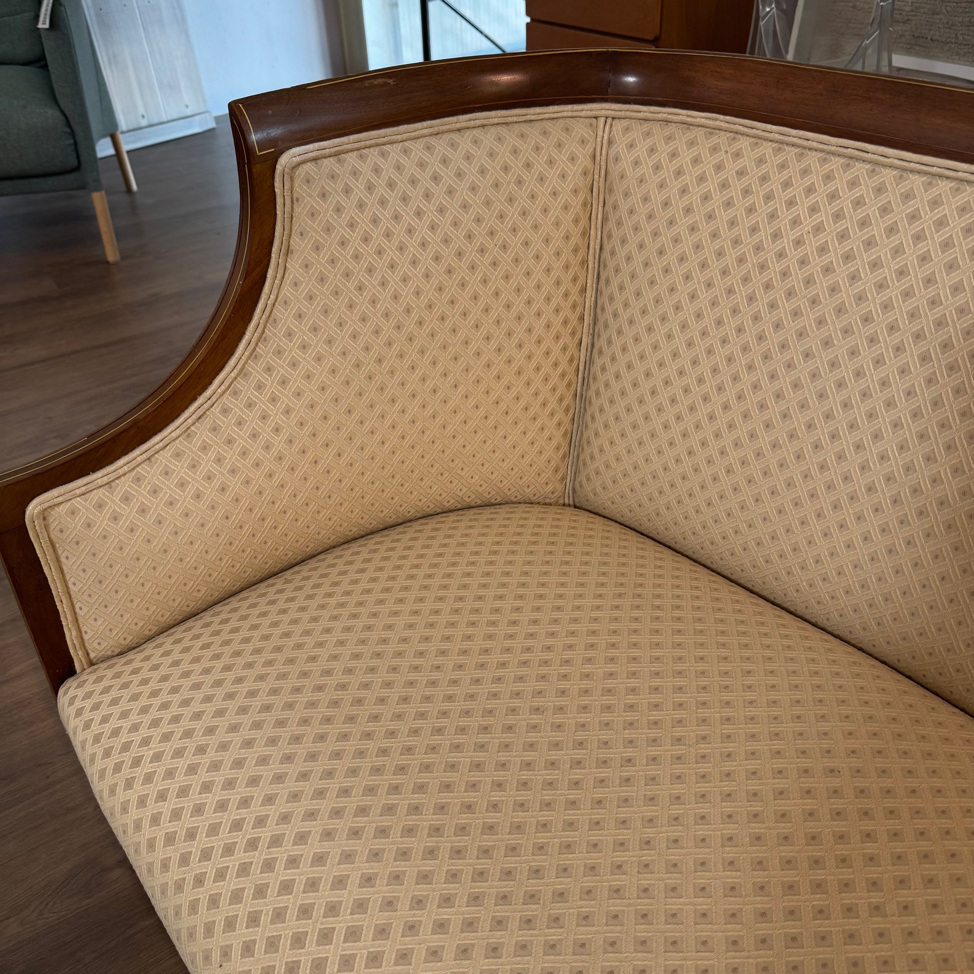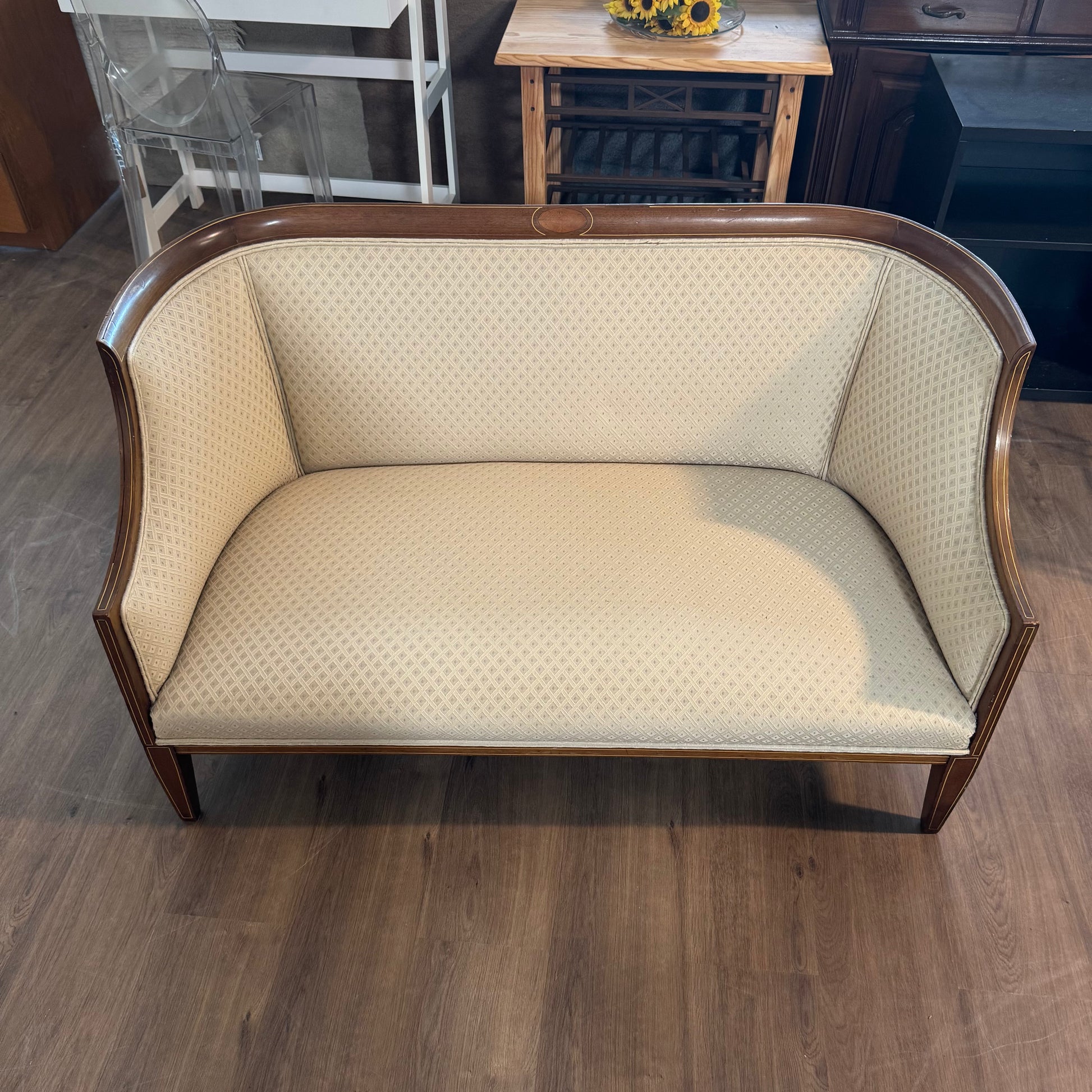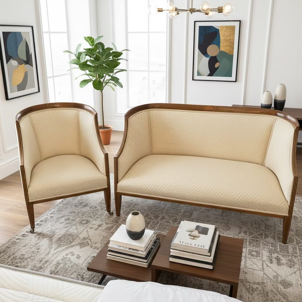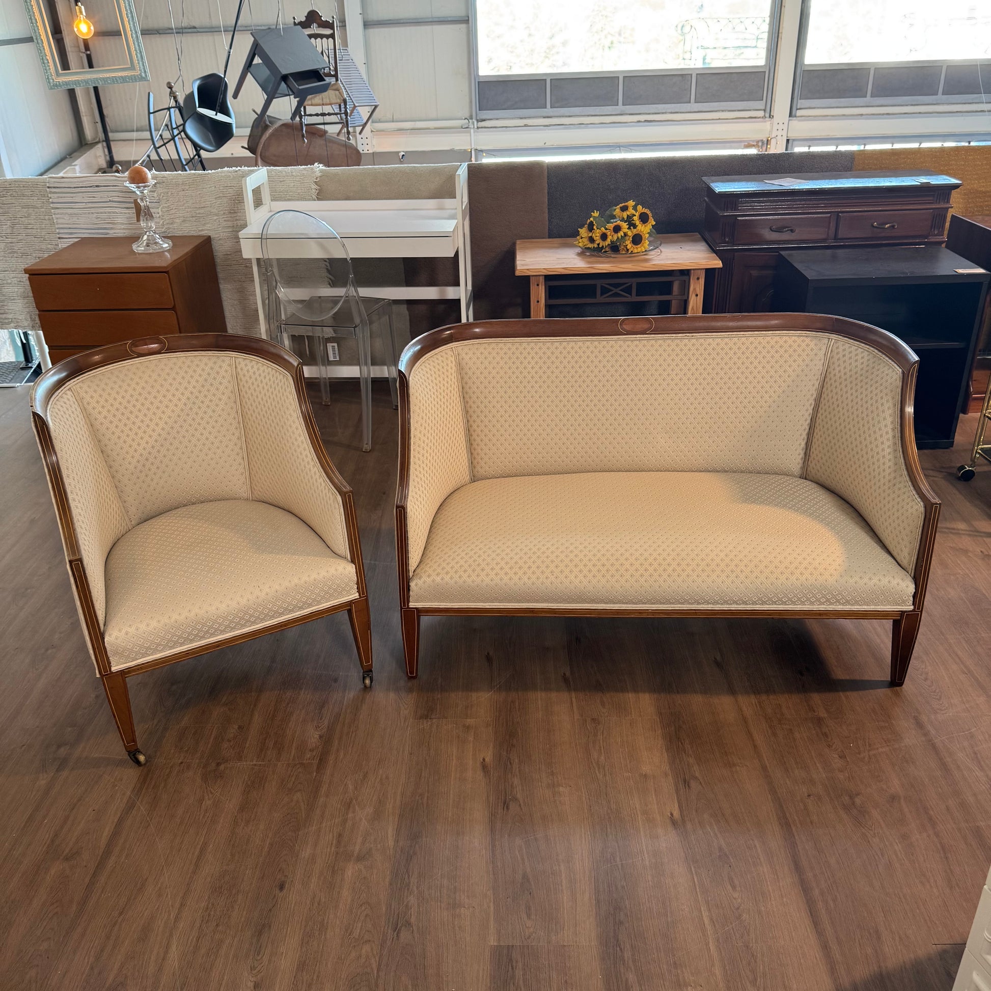 Um romântico sofá de dois lugares, em tons claros, com uma estrutura curva em madeira, combinado com uma poltrona da mesma cor.