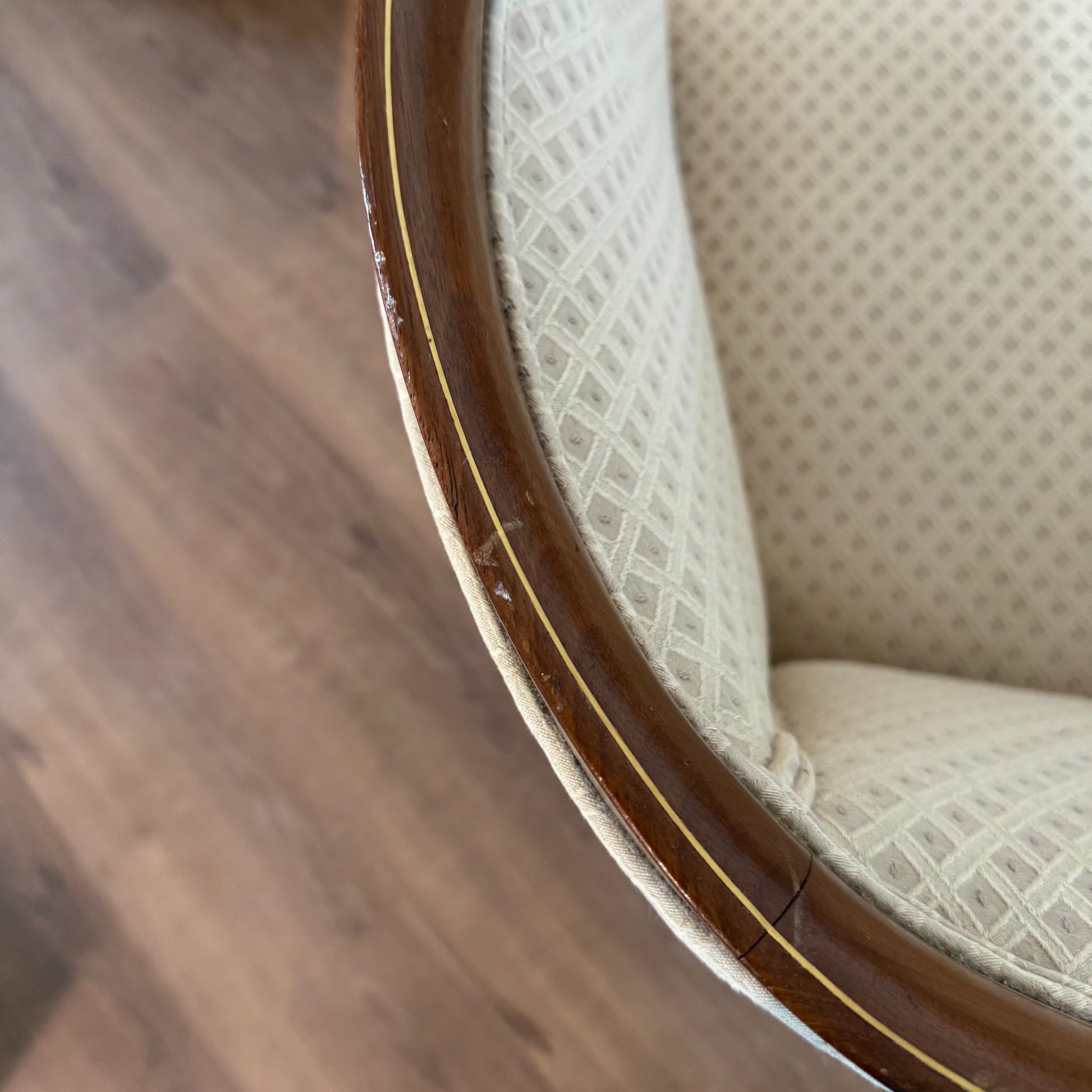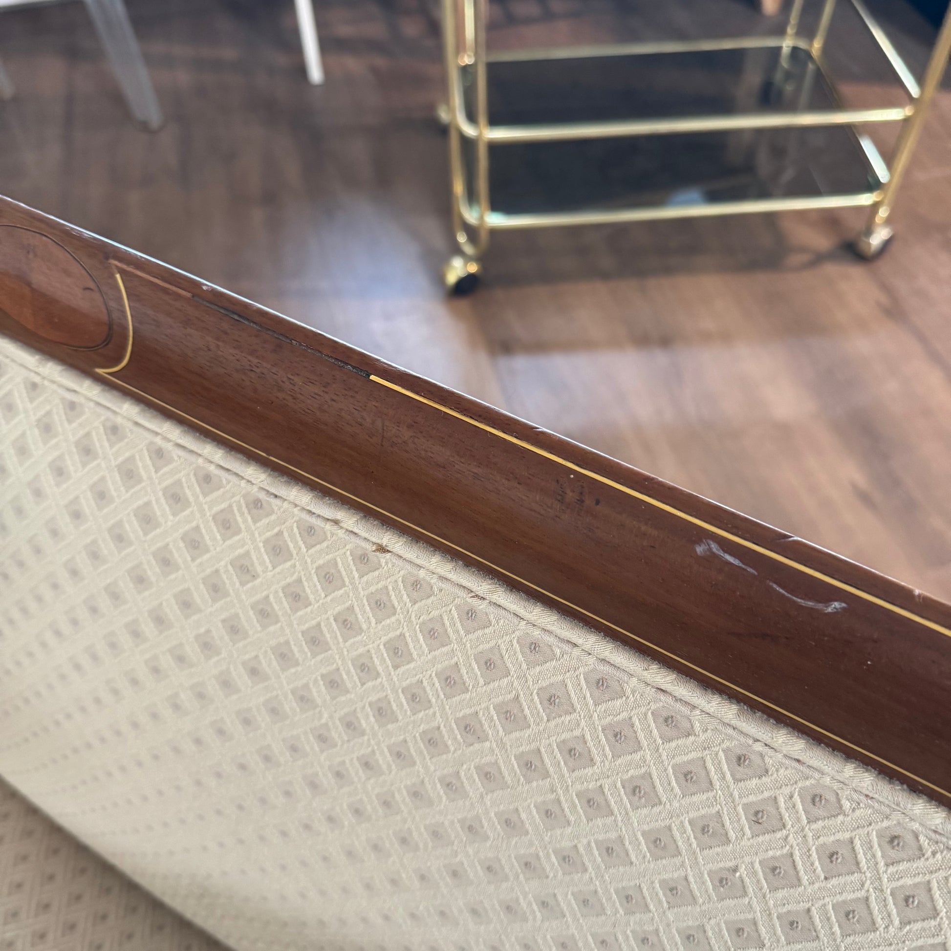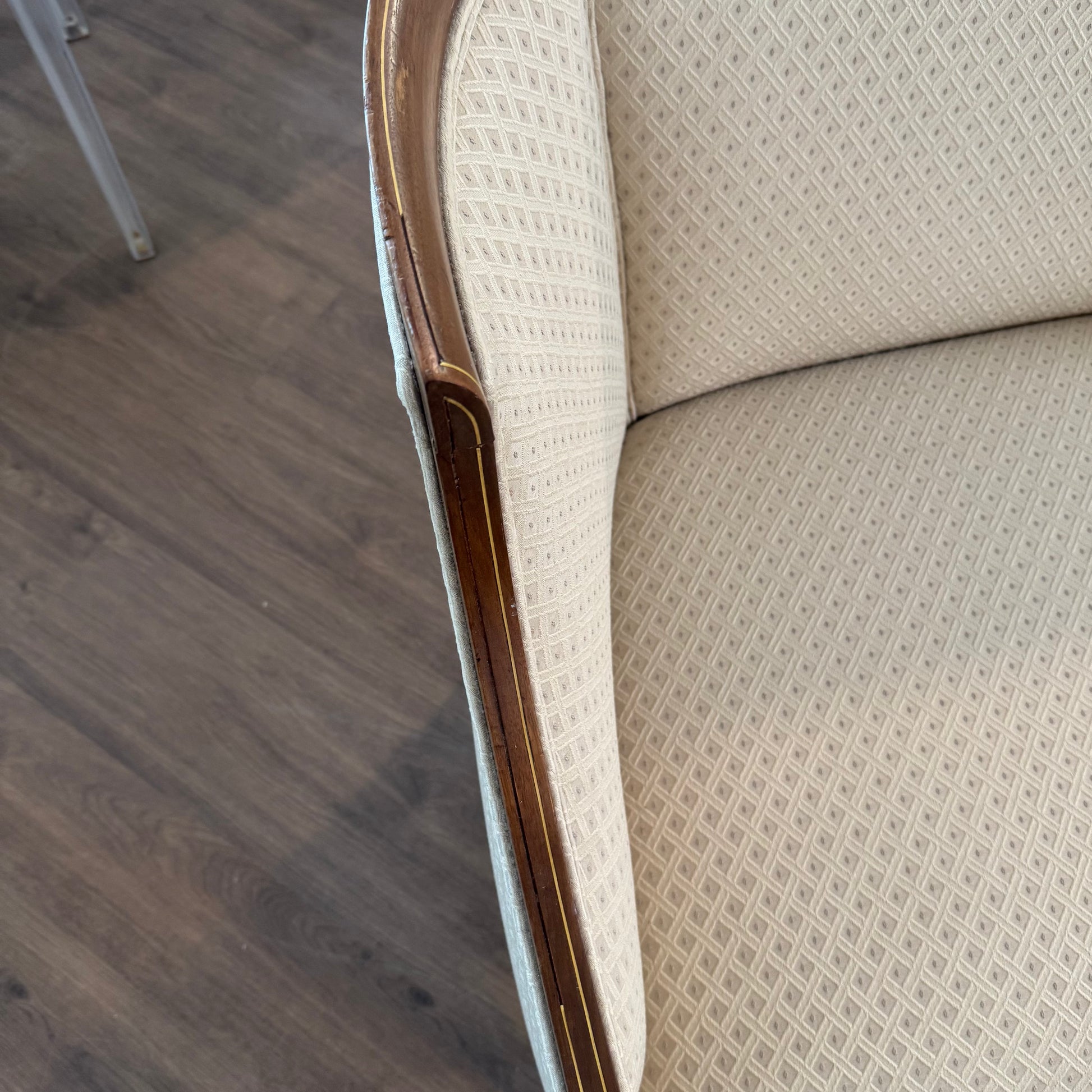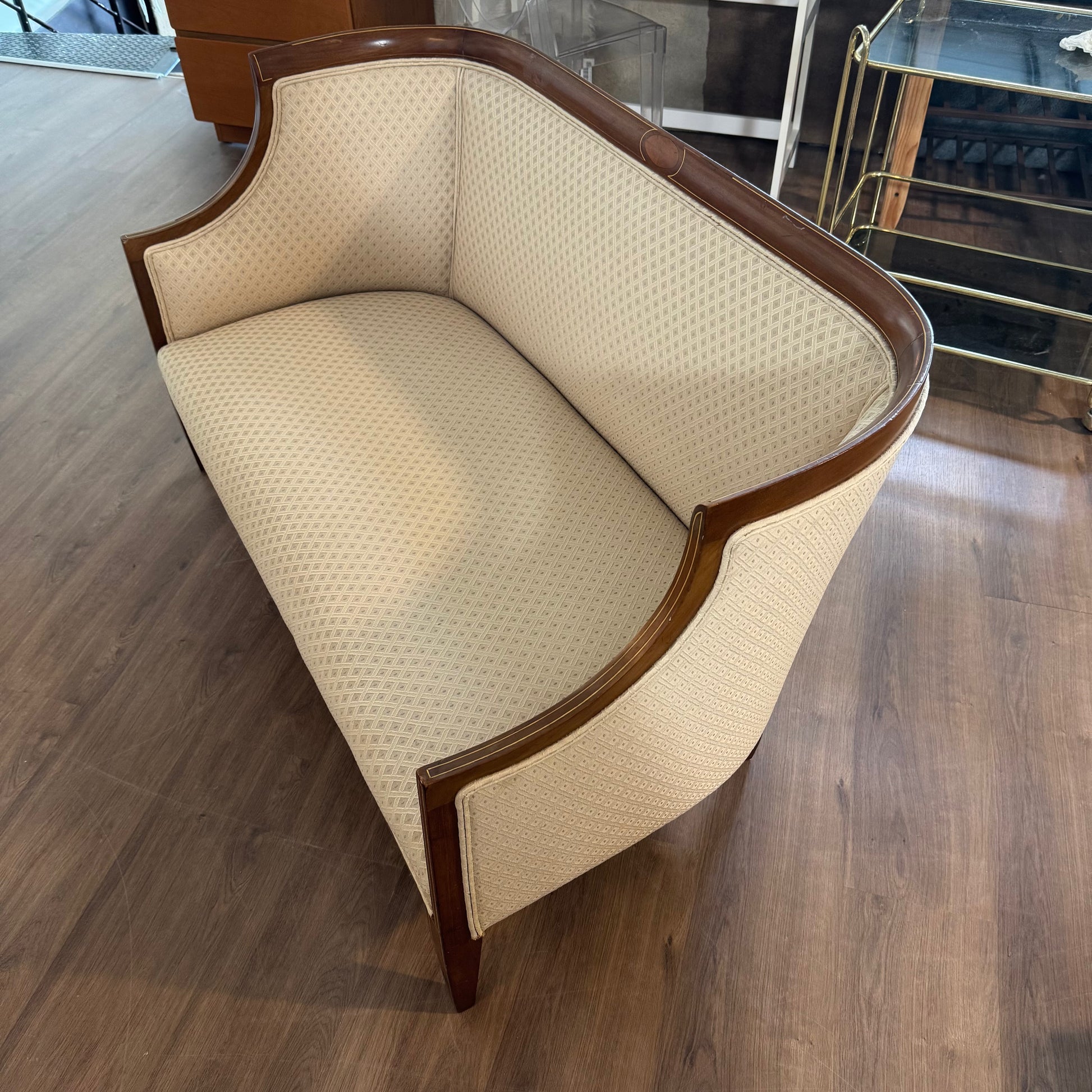 Um romântico sofá de dois lugares, em tons claros, com uma estrutura curva em madeira, combinado com uma poltrona da mesma cor.