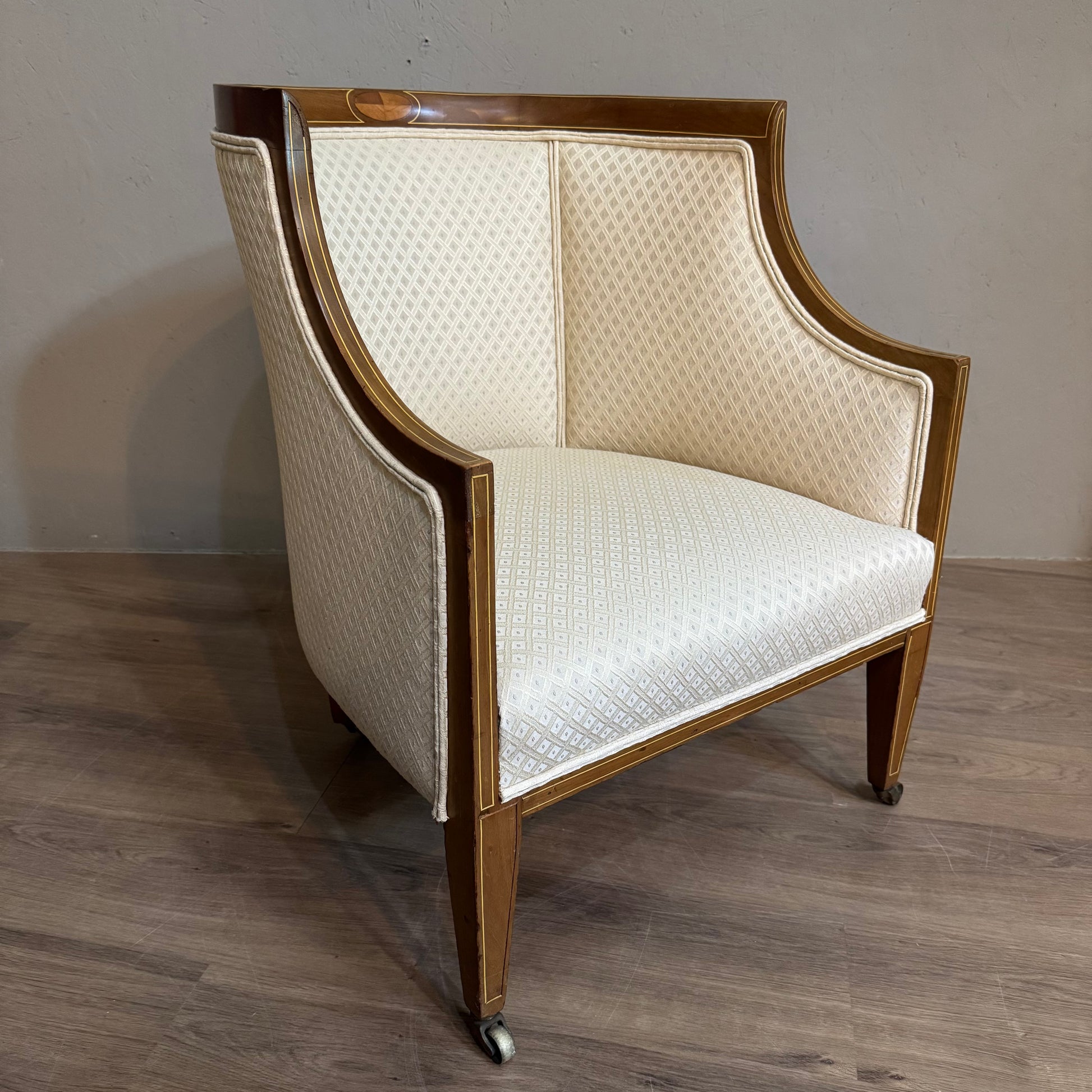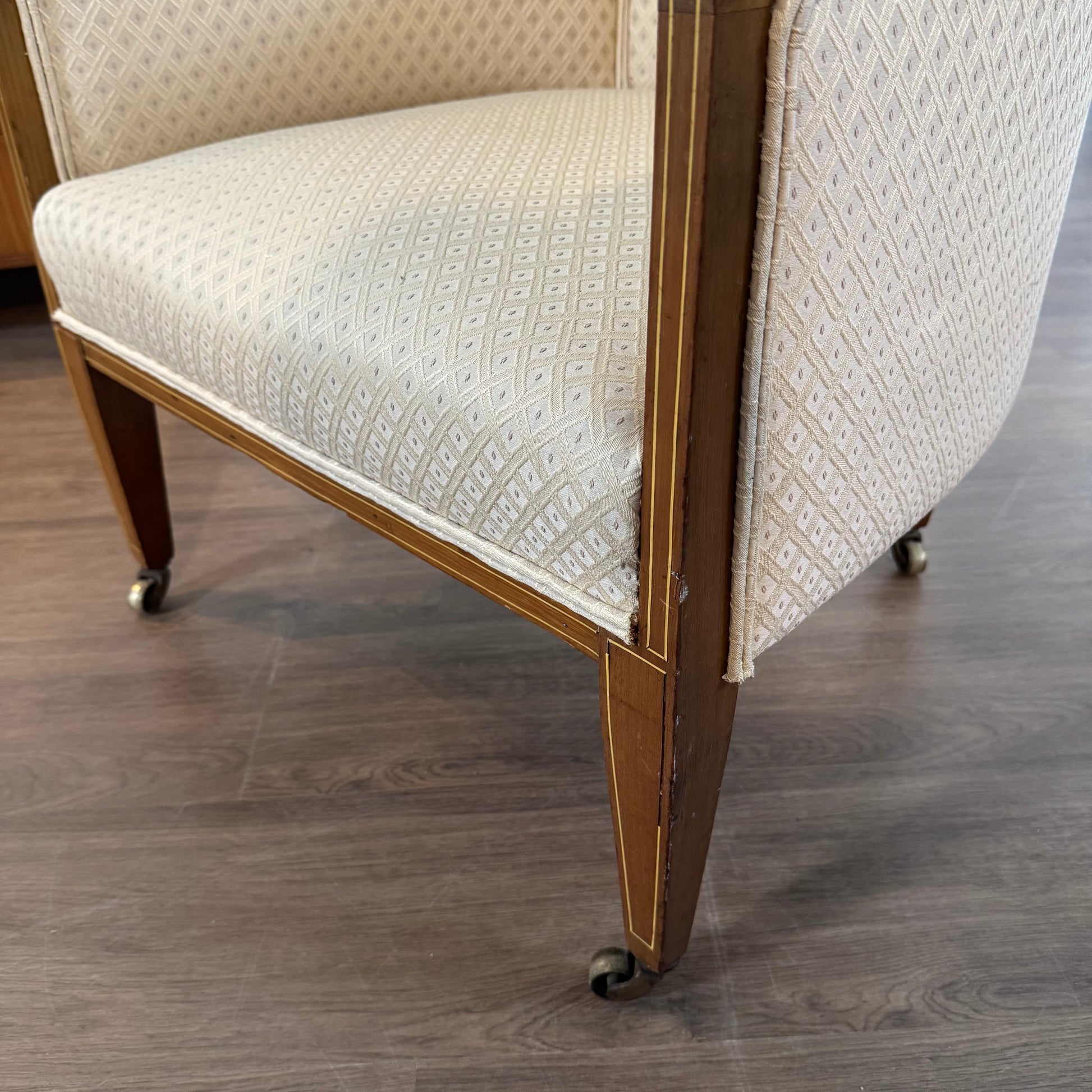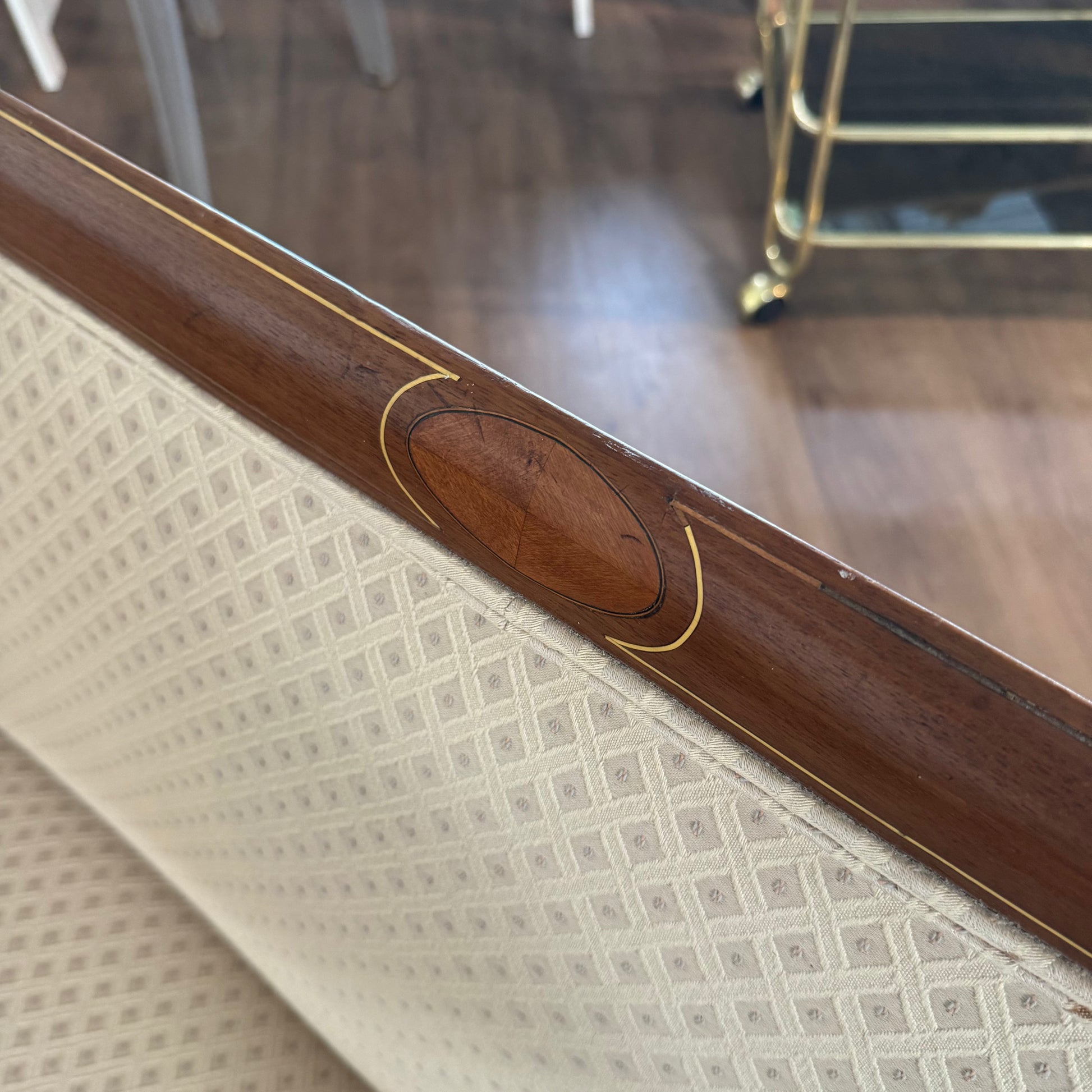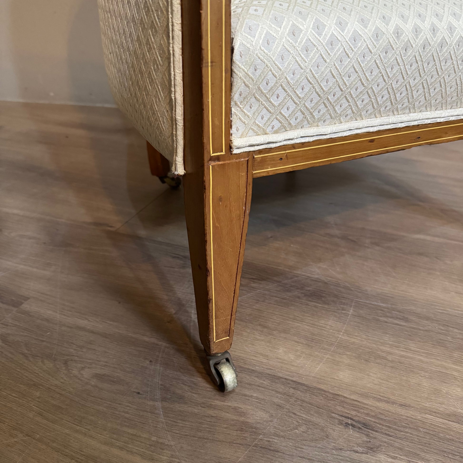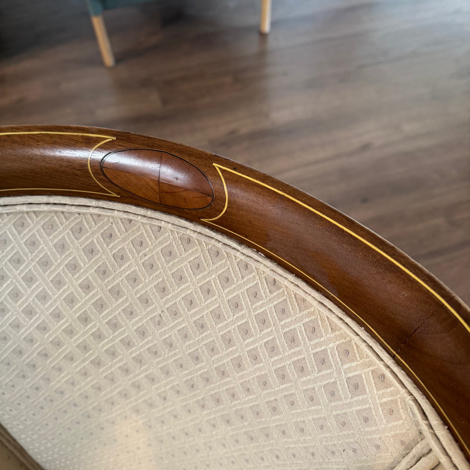 Um romântico sofá de dois lugares, em tons claros, com uma estrutura curva em madeira, combinado com uma poltrona da mesma cor.