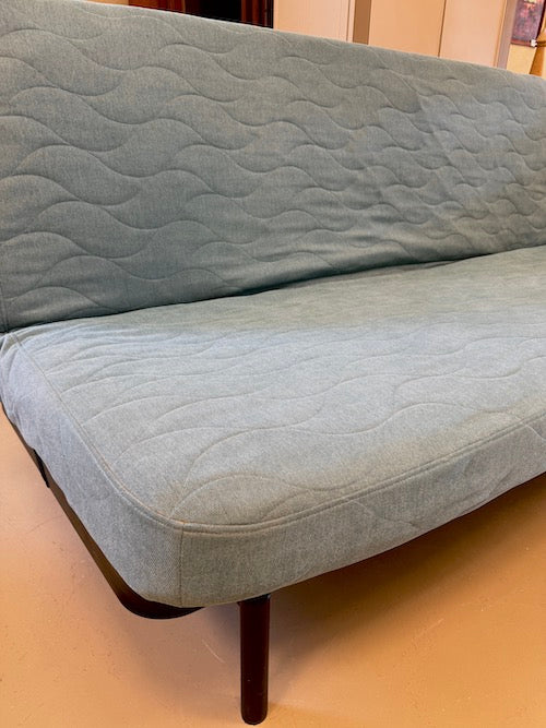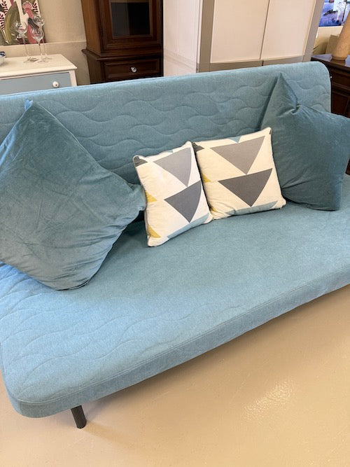 Um sofá-cama click clack fácil de usar, em azul-claro. As capas são amovíveis para facilitar a limpeza. Muito prático!