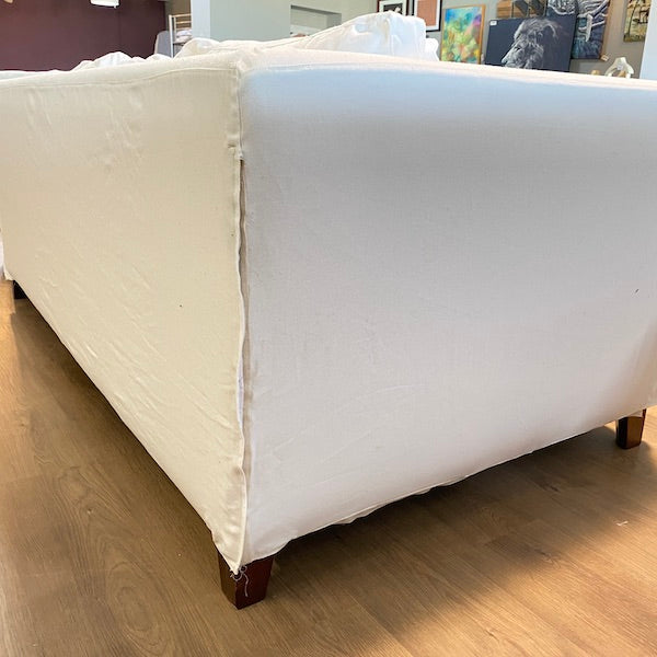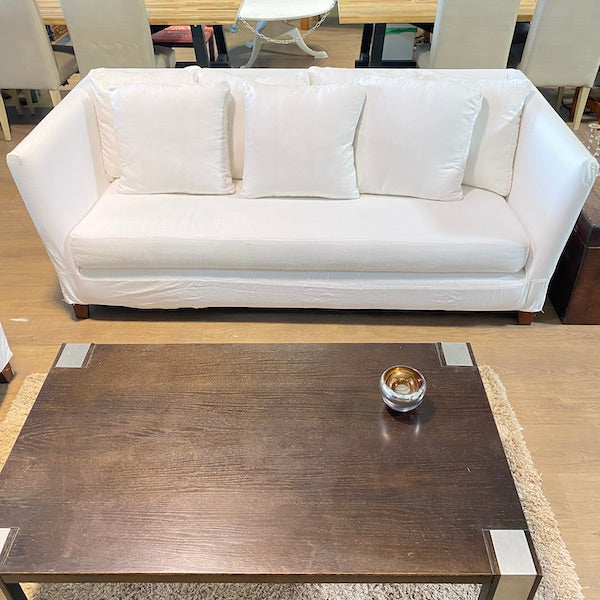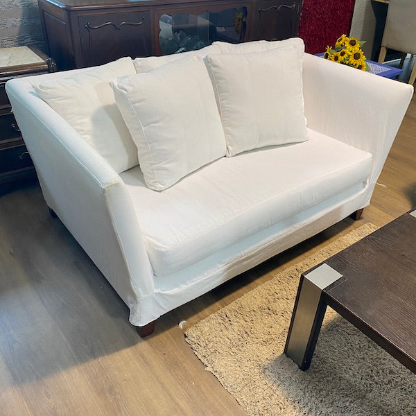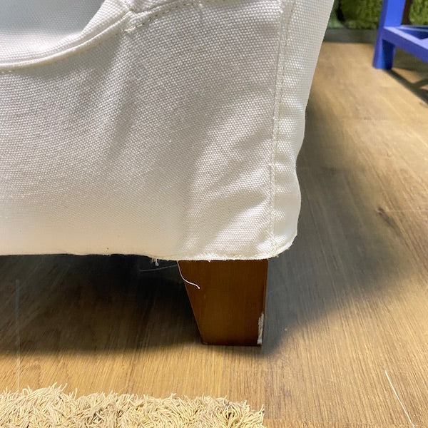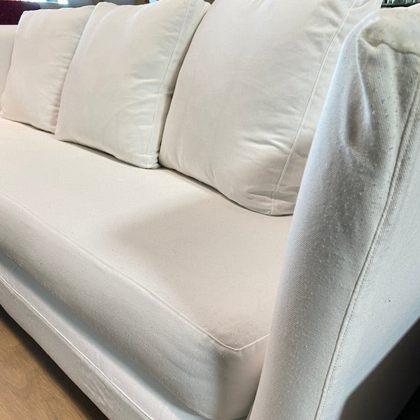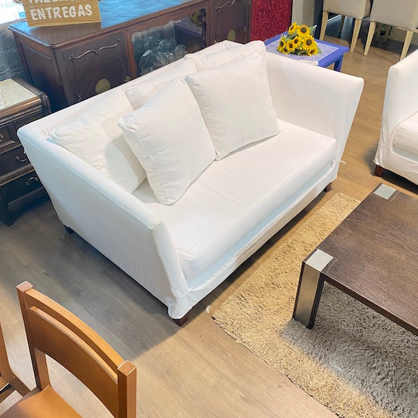 Este conjunto de sofás brancos, elegantes e contemporâneos, inclui um de 3 e outro de 2 lugares, oferecendo uma silhueta clean e moderna com almofadas generosas e encostos confortáveis. As capas de algodão são amovíveis para facilitar a limpeza. Seria óptimo se alguns bancos fossem amovíveis... se não tivéssemos tempo para isso nós próprios.