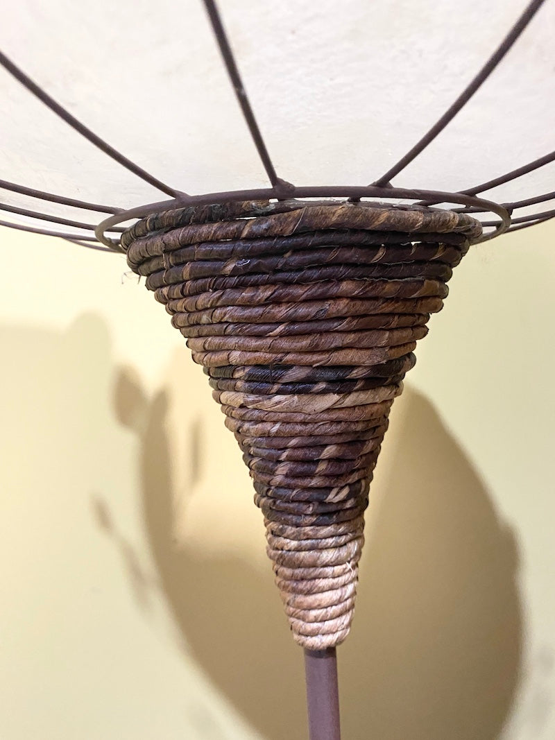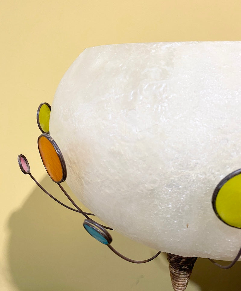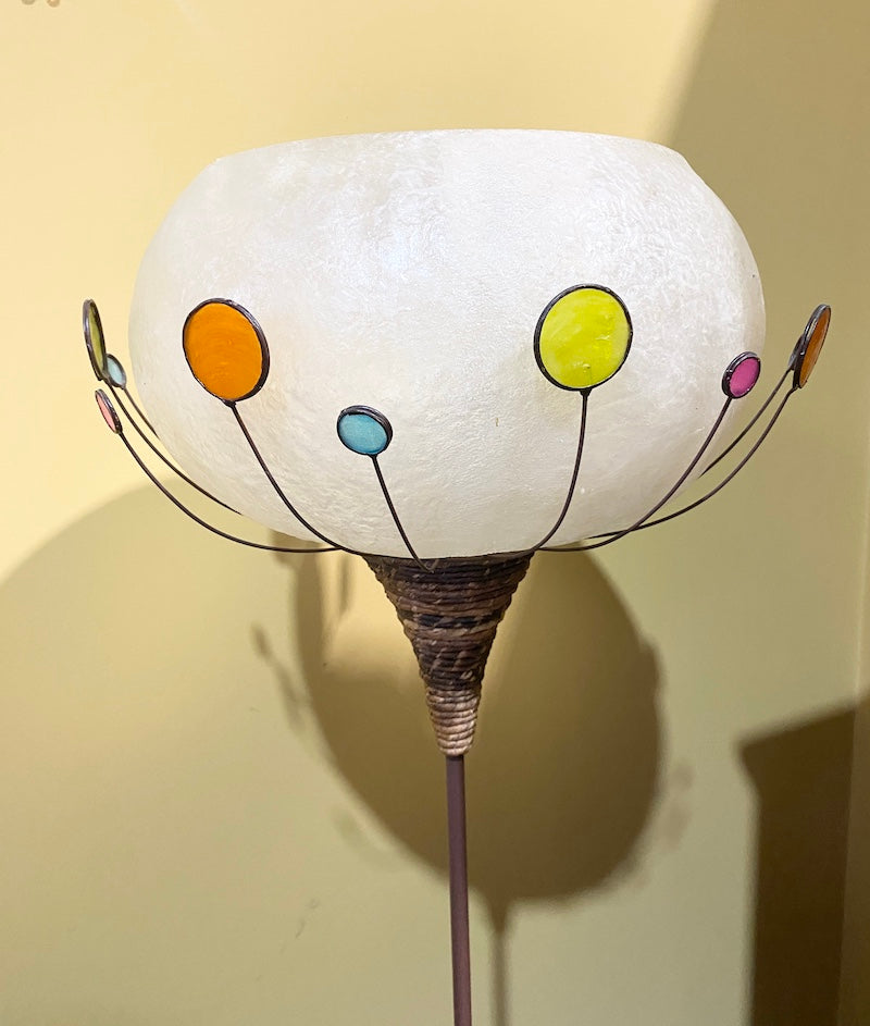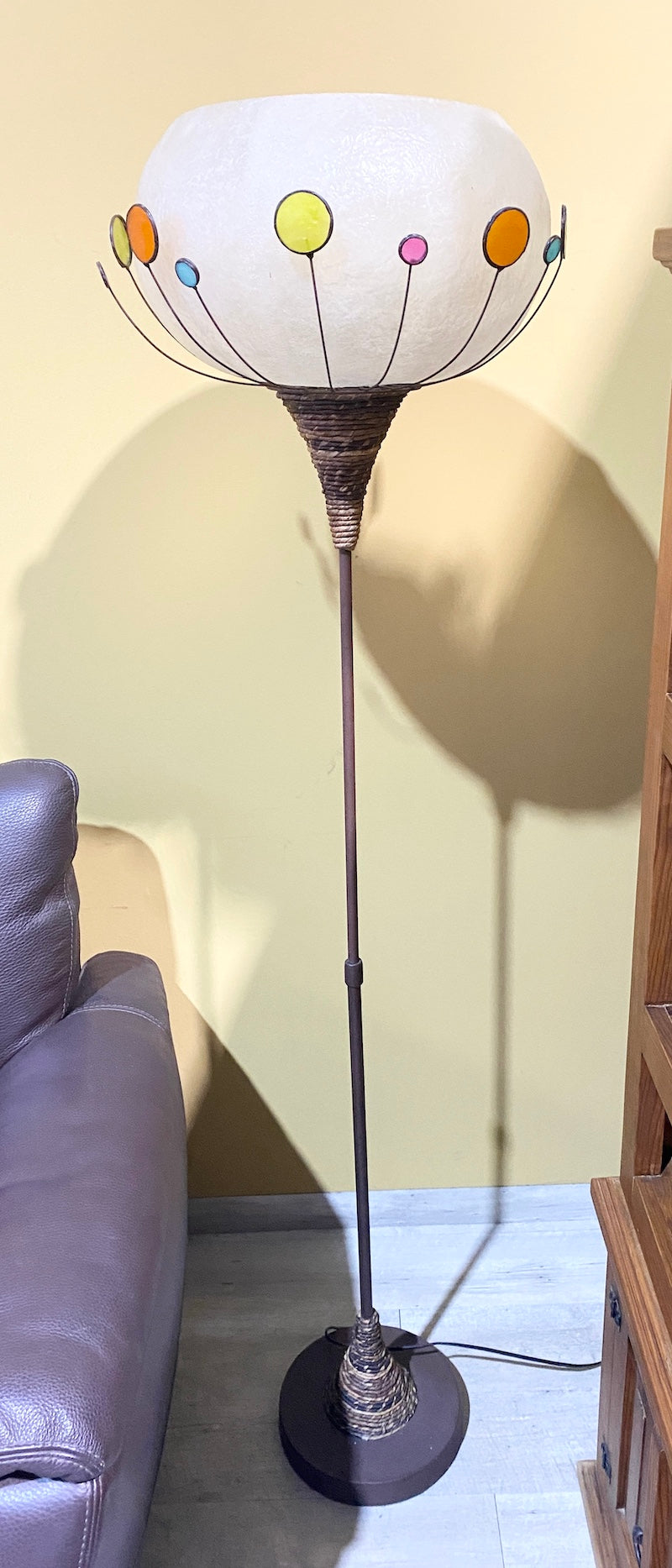 Um candeeiro de pé moderno com um abat-jour em forma de taça, rodeado por círculos coloridos suportados por hastes metálicas. A base apresenta detalhes em rattan entrançado, sendo um complemento marcante para qualquer divisão.