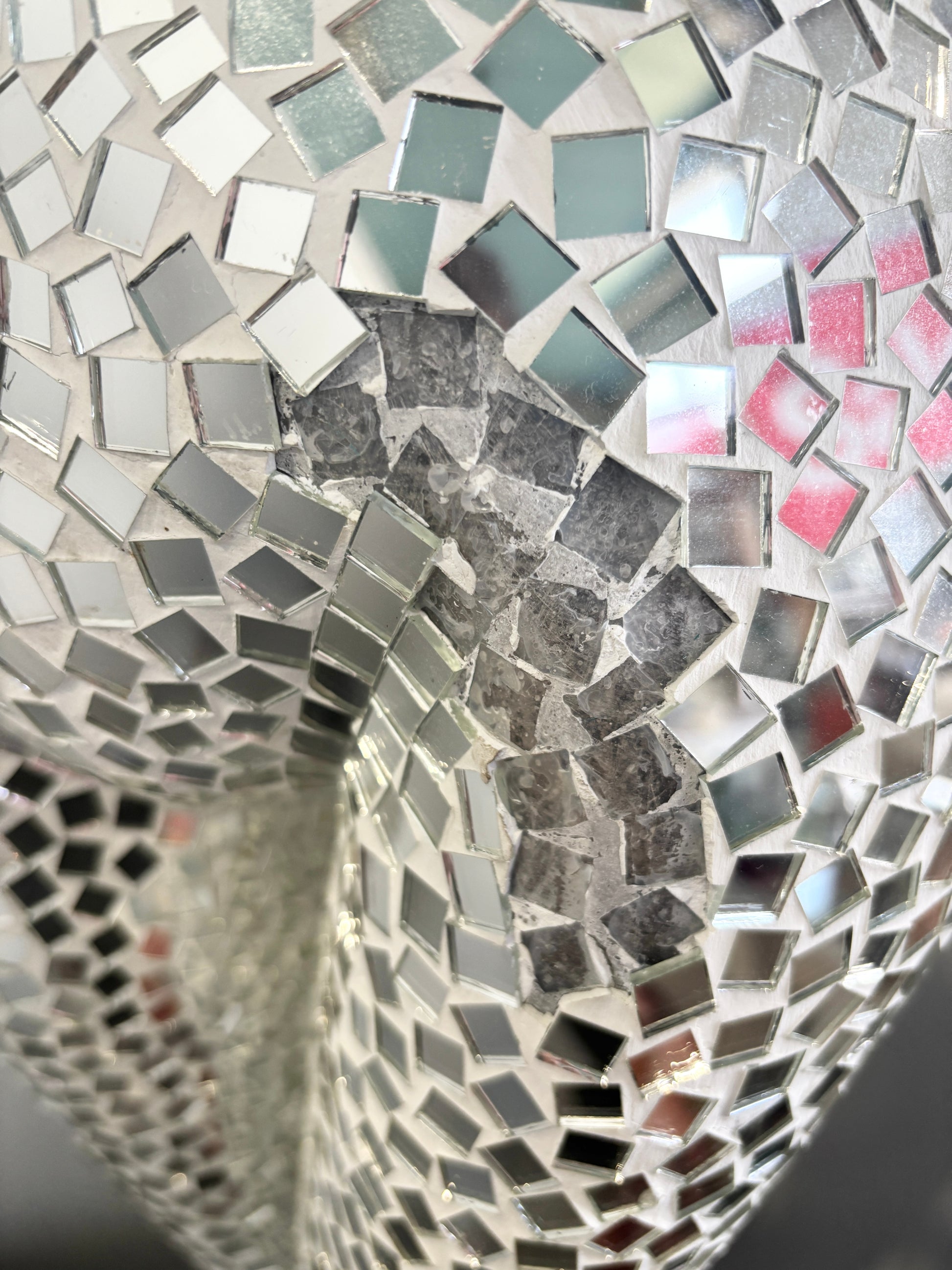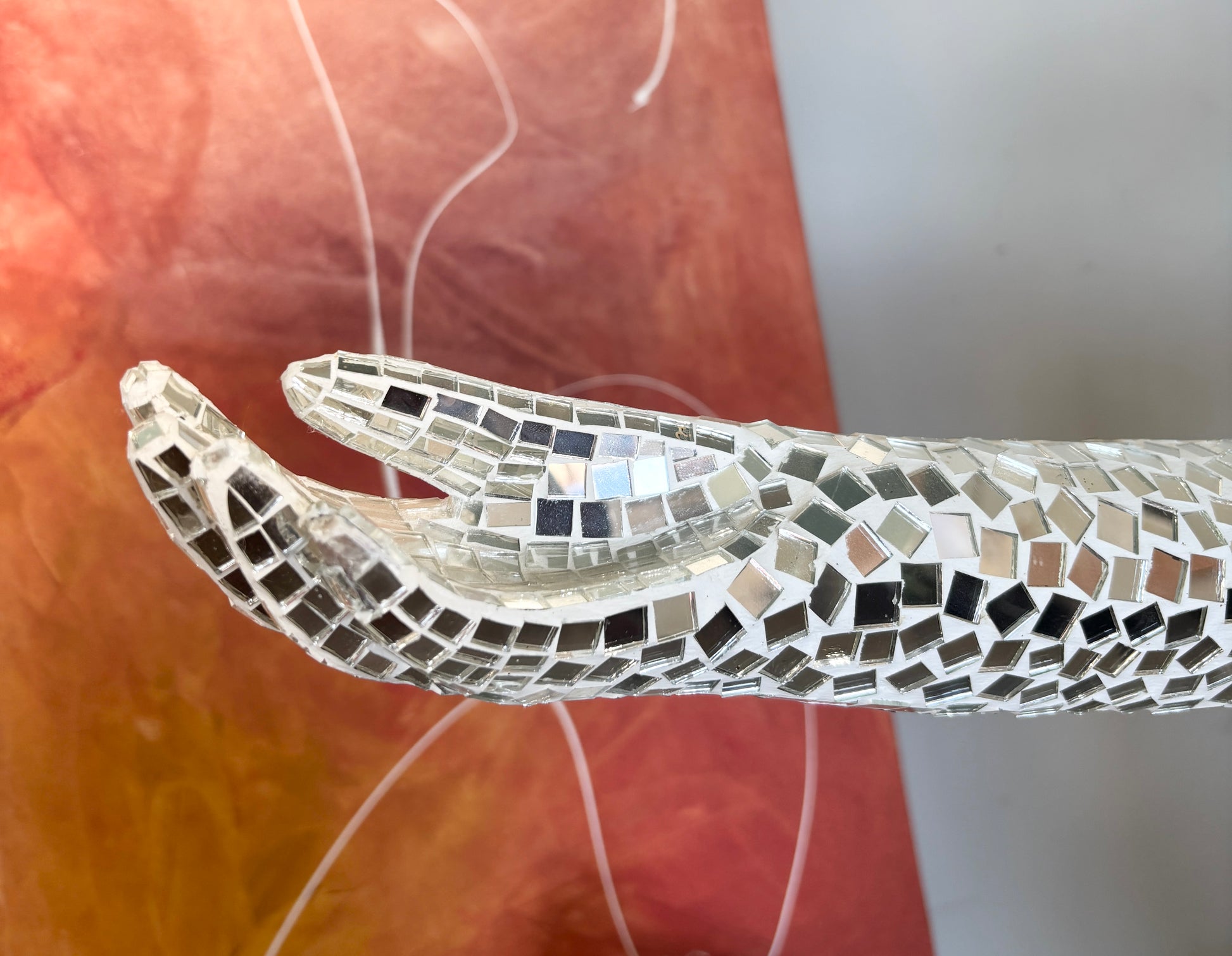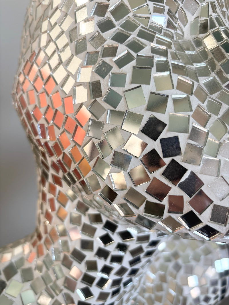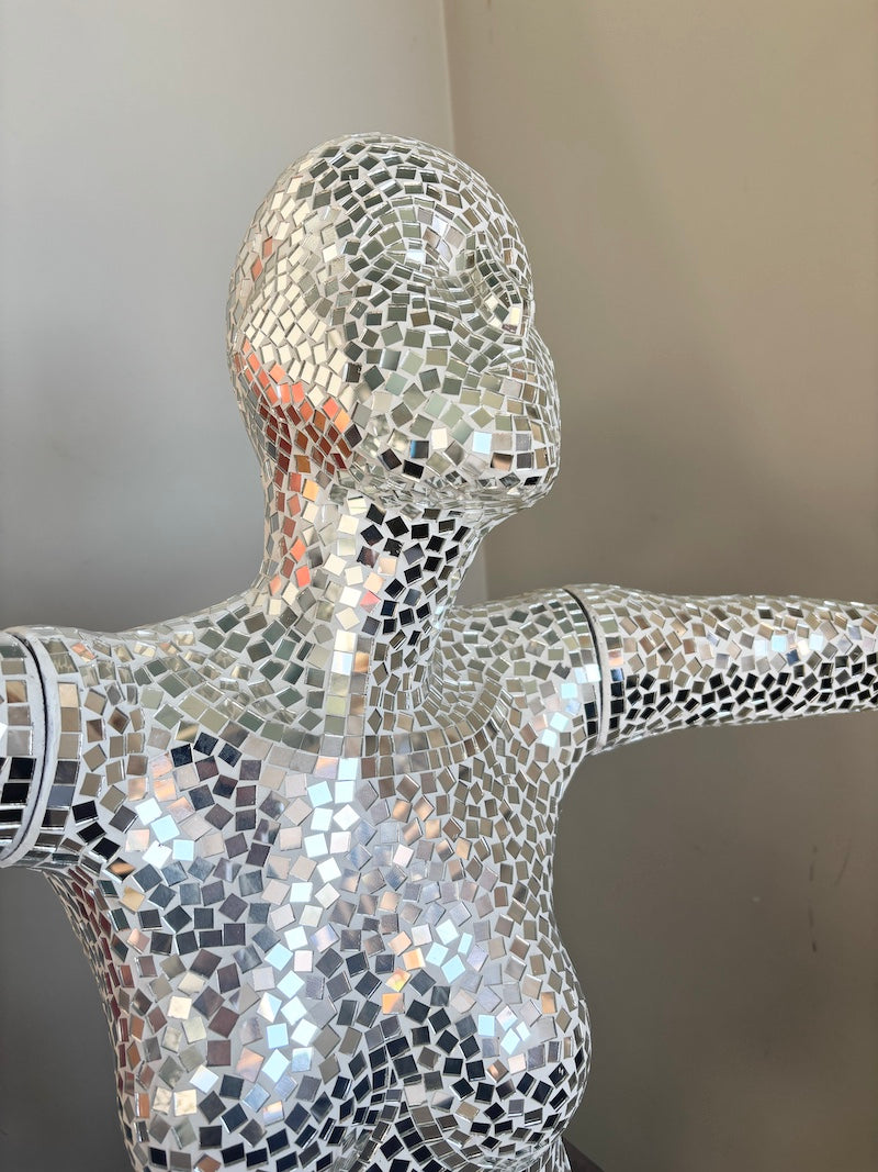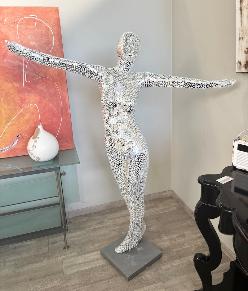 Esta escultura impressionante capta a elegância da silhueta feminina numa pose ampla e acolhedora. Adornada inteiramente com fragmentos de espelho refletores que captam e dispersam a luz por todo o ambiente, transforma-se numa peça central luminosa que atrai todos os olhares.