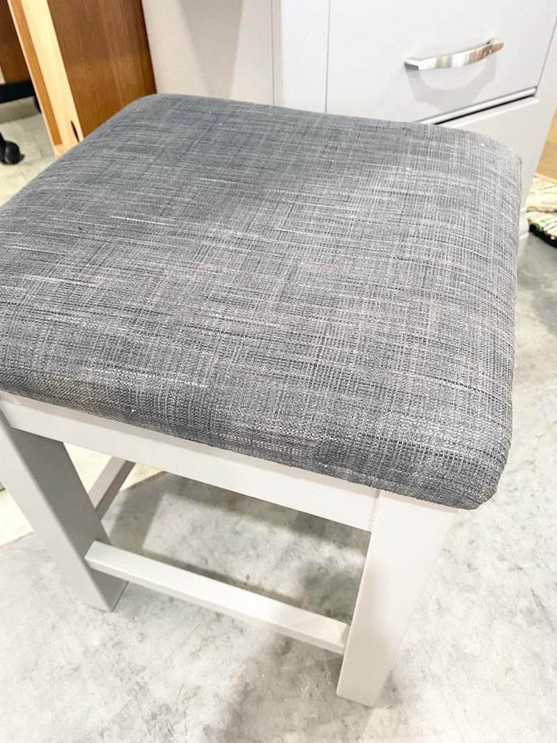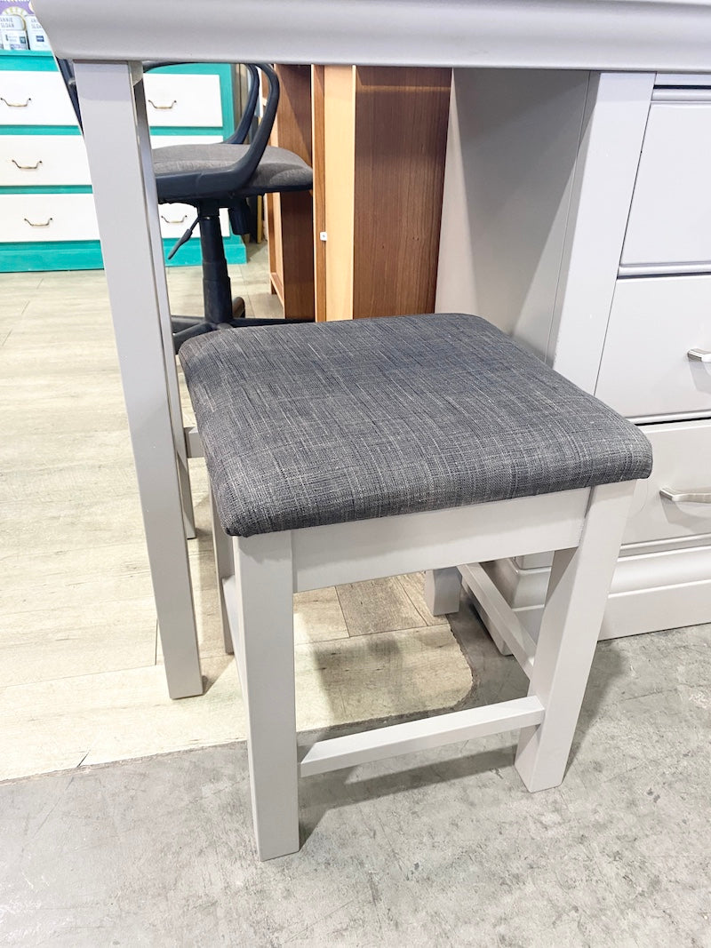 Um banco estofado cinzento, perfeito para complementar um toucador.