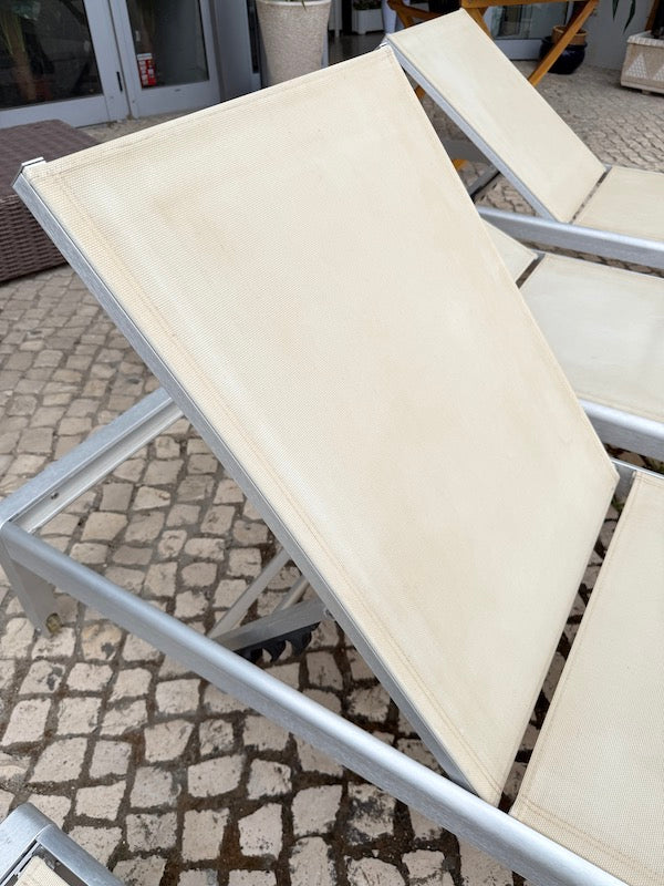 Conjunto de quatro espreguiçadeiras robustas com estrutura leve em alumínio e tecido tipo rede. Os encostos ajustáveis oferecem múltiplas posições reclináveis para maior conforto.