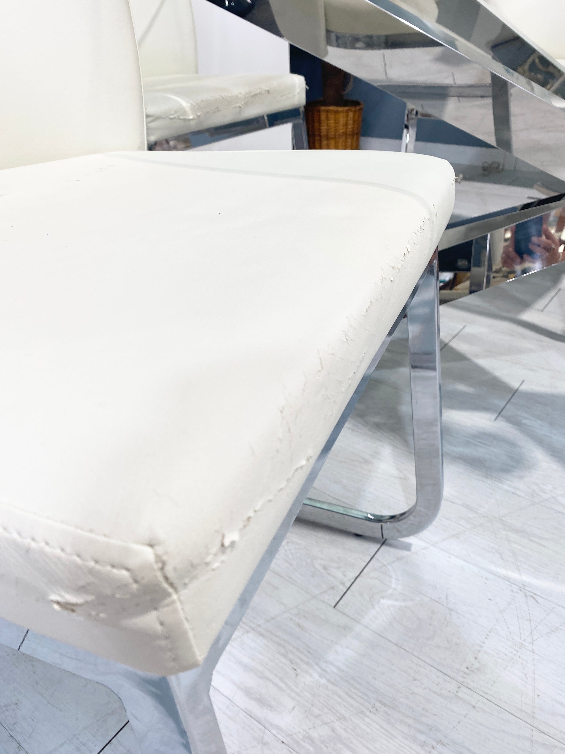 Trata-se de uma elegante mesa de refeições com base cruzada cromada, tampo em vidro e 6 cadeiras de encosto curvo em pele sintética branca, da marca portuguesa LMM (Luís Maroto Mobiliário). Um elegante conjunto de design com cadeiras um pouco gastas, como na imagem, e a precisar de um pouco de cuidado e atenção.