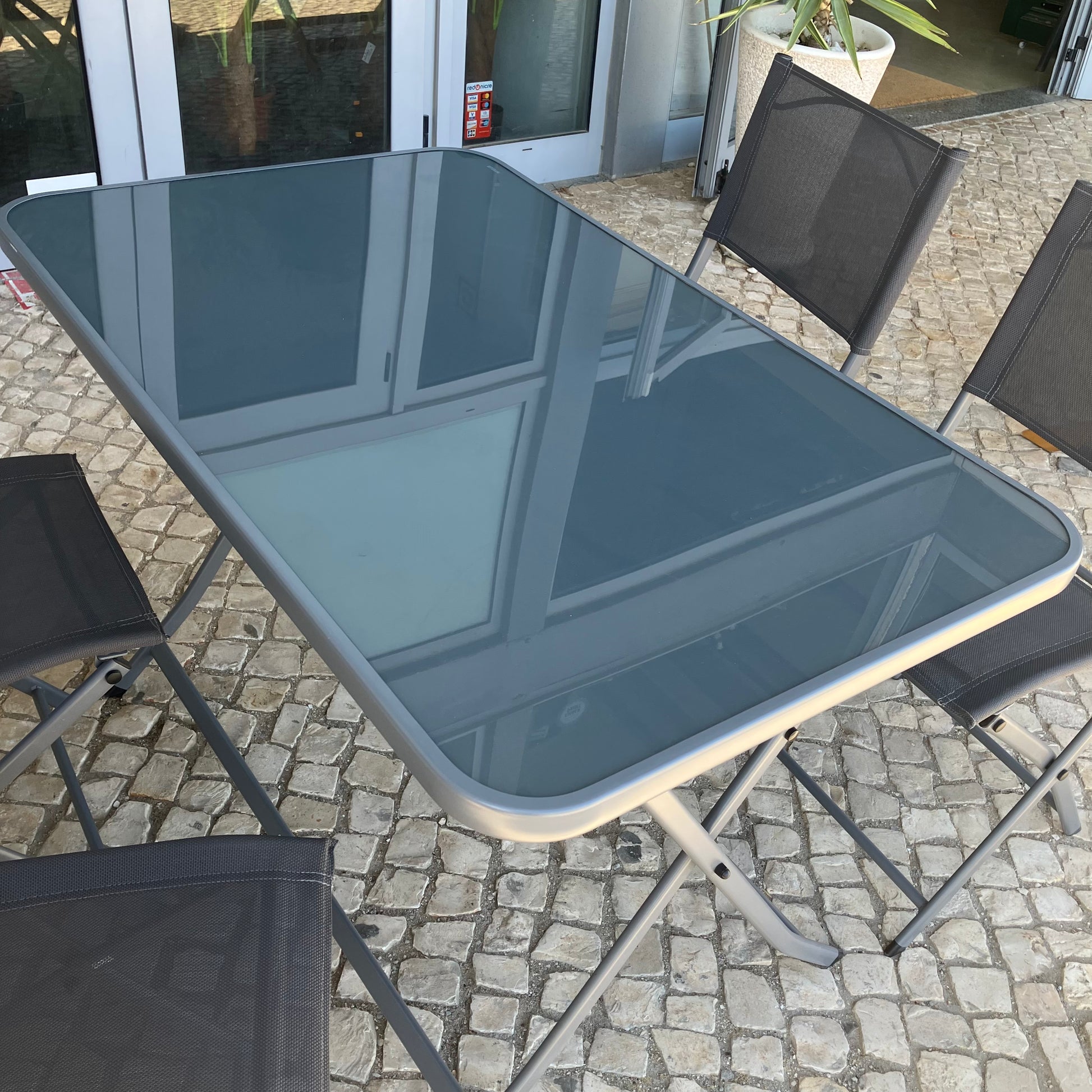 This modern outdoor dining set includes a rectangular glass-top table and four matching chairs in mesh. Durable and weather-resistant, it’s ideal for patios, gardens, or balconies - perfect for enjoying meals or drinks outdoors.