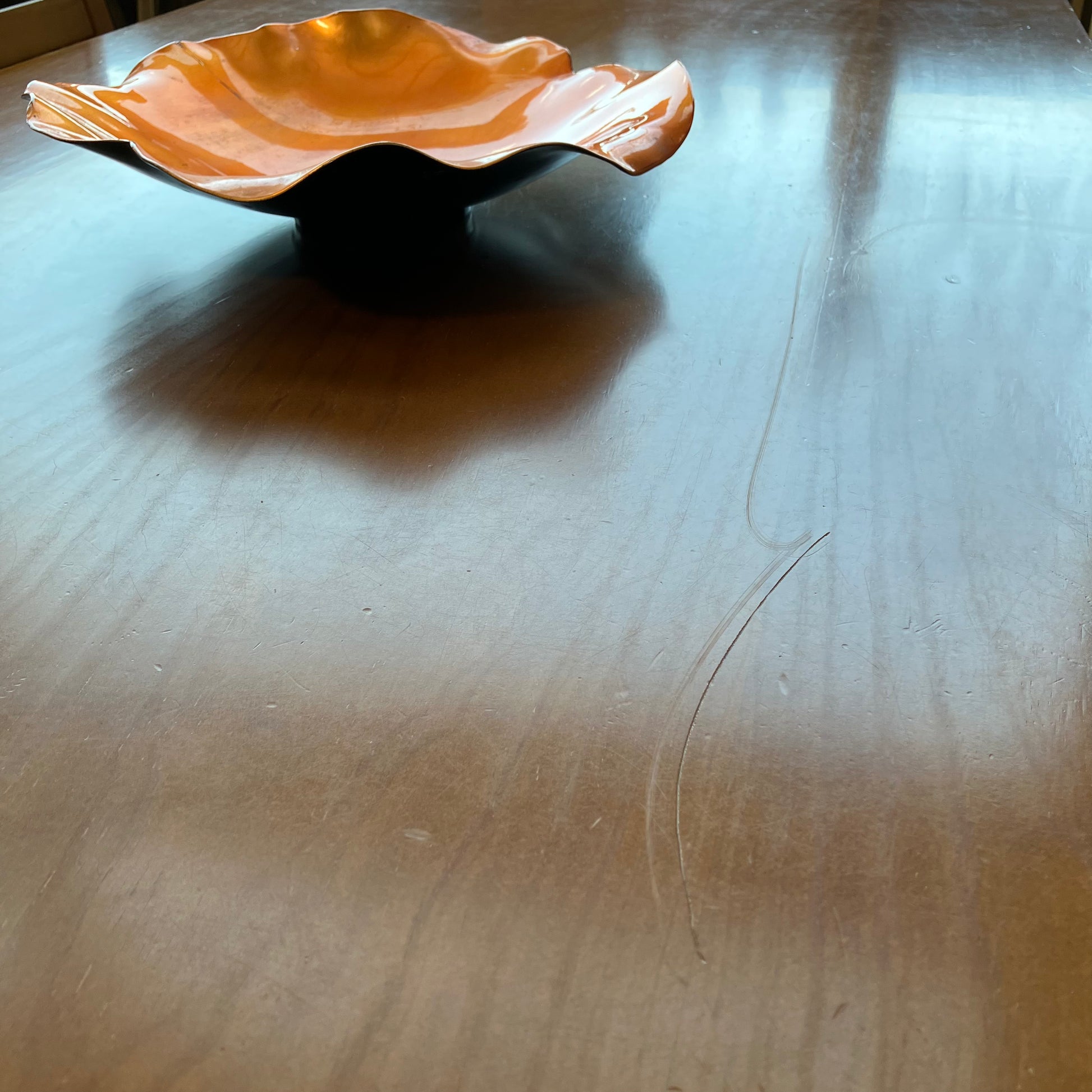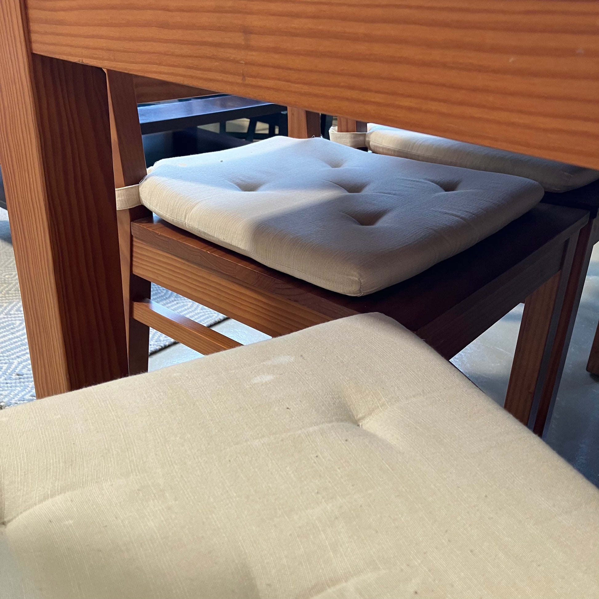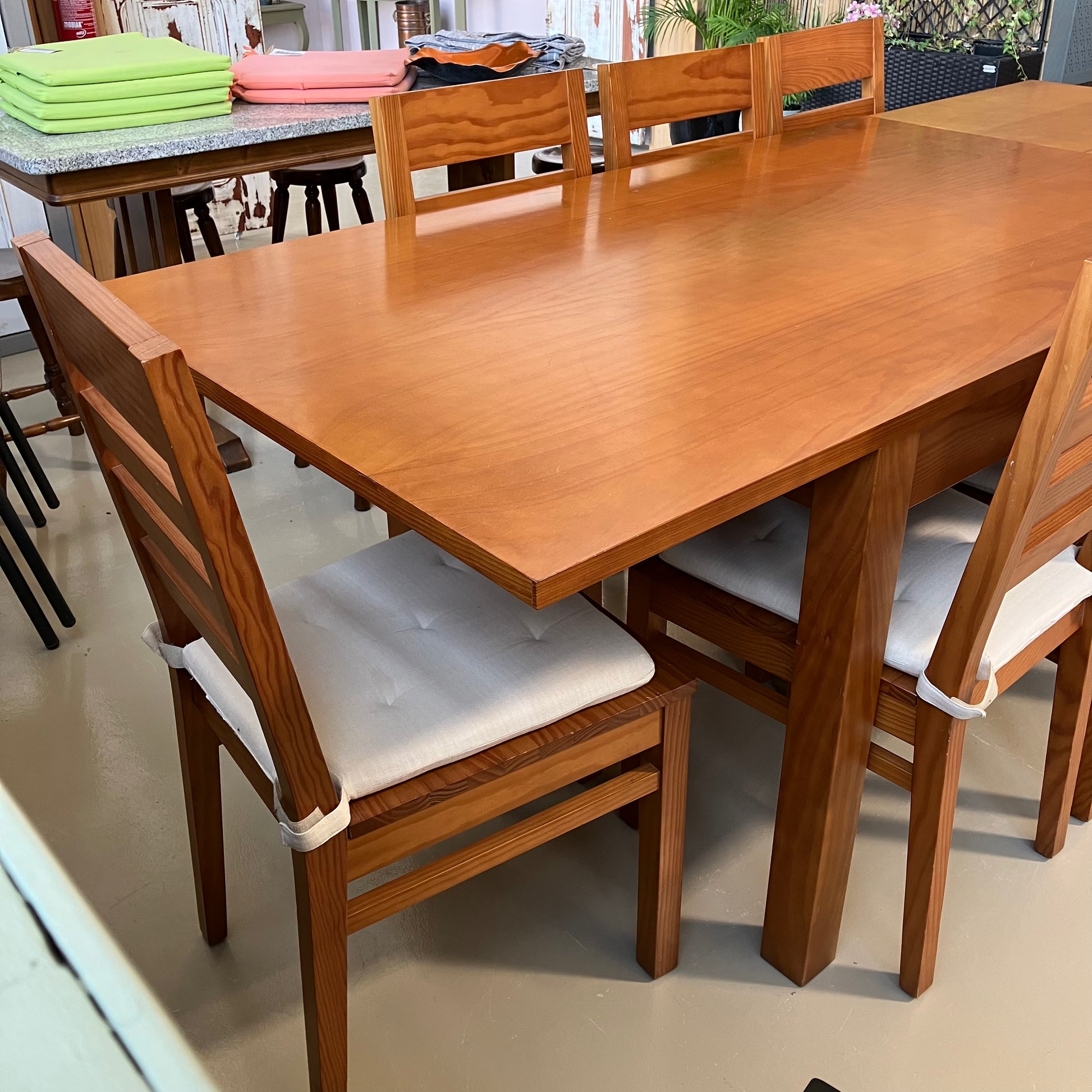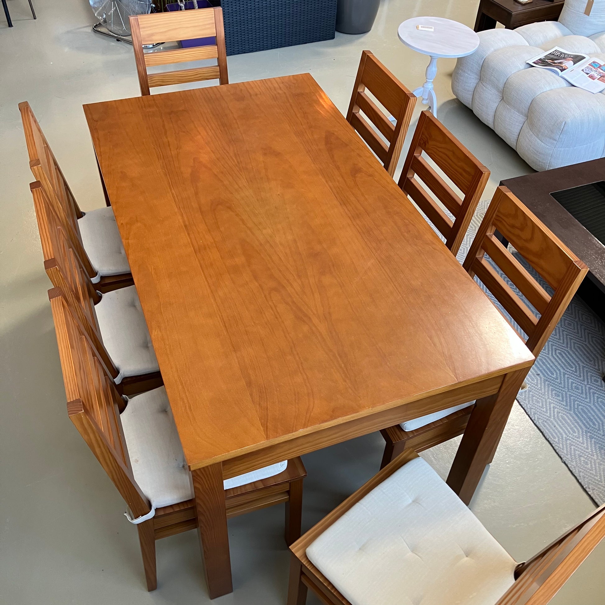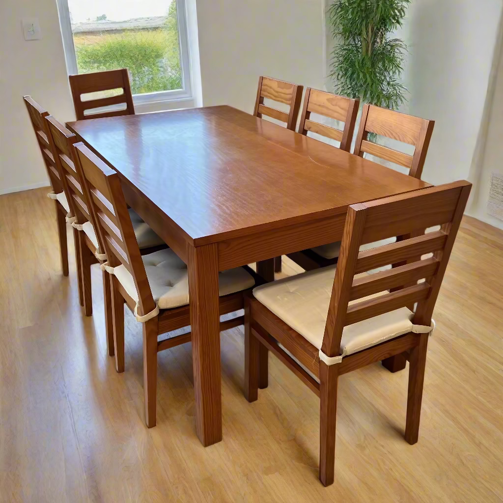 A spacious extendable wooden dining table paired with eight matching chairs with white seat pads. Great for larger households, dinner parties, or spreading out your work-from-home life.